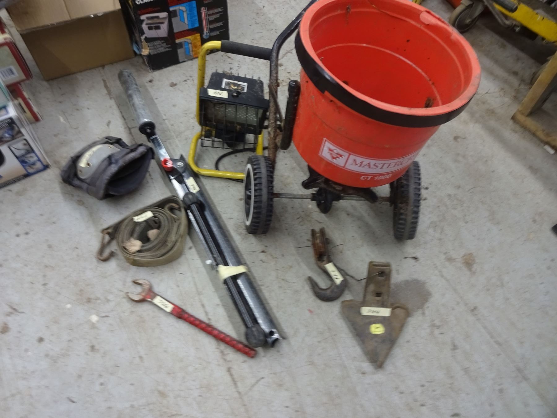 DAMAGED IN STORAGE SEEDER ADJUSTABLE ROLLER, LIGHT, STRAP, OLD WRENCH, SET OF KNEE PADS, HOOK PULLES
