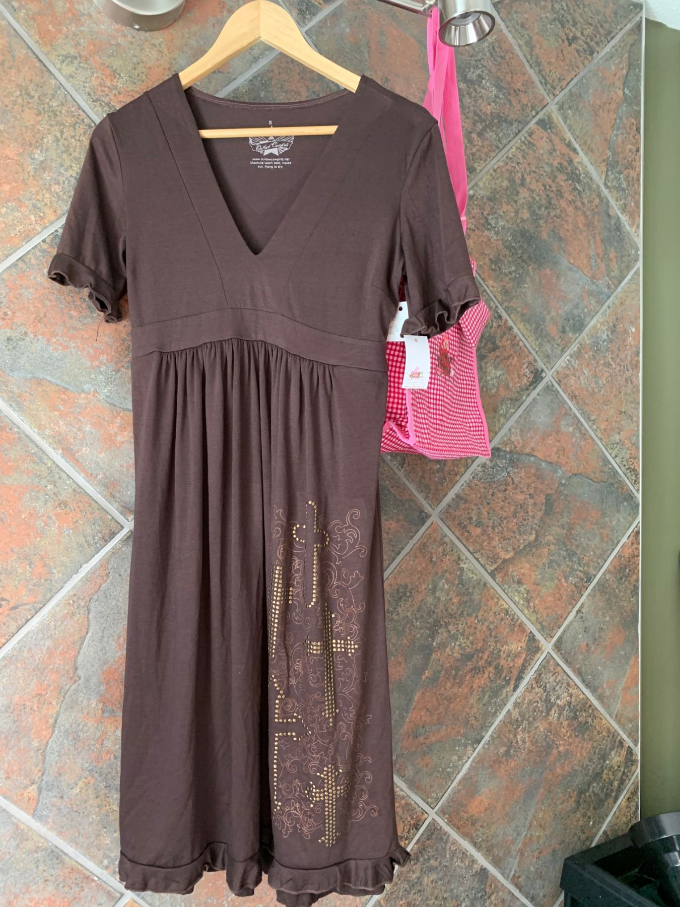 DARK BROWN RUFFLE DRESS/GOLD CROSSES/ STUDDED  DESIGN ON BOTTOM/SIZE SMALL  / COWGIRL FINESSE FINESS