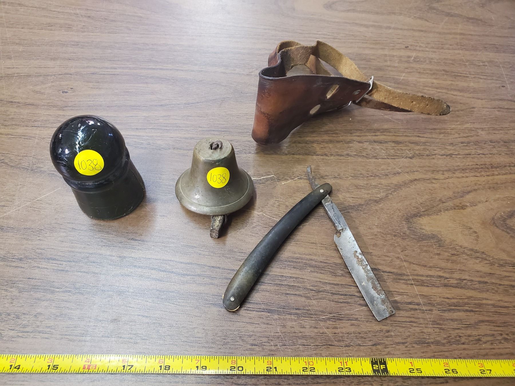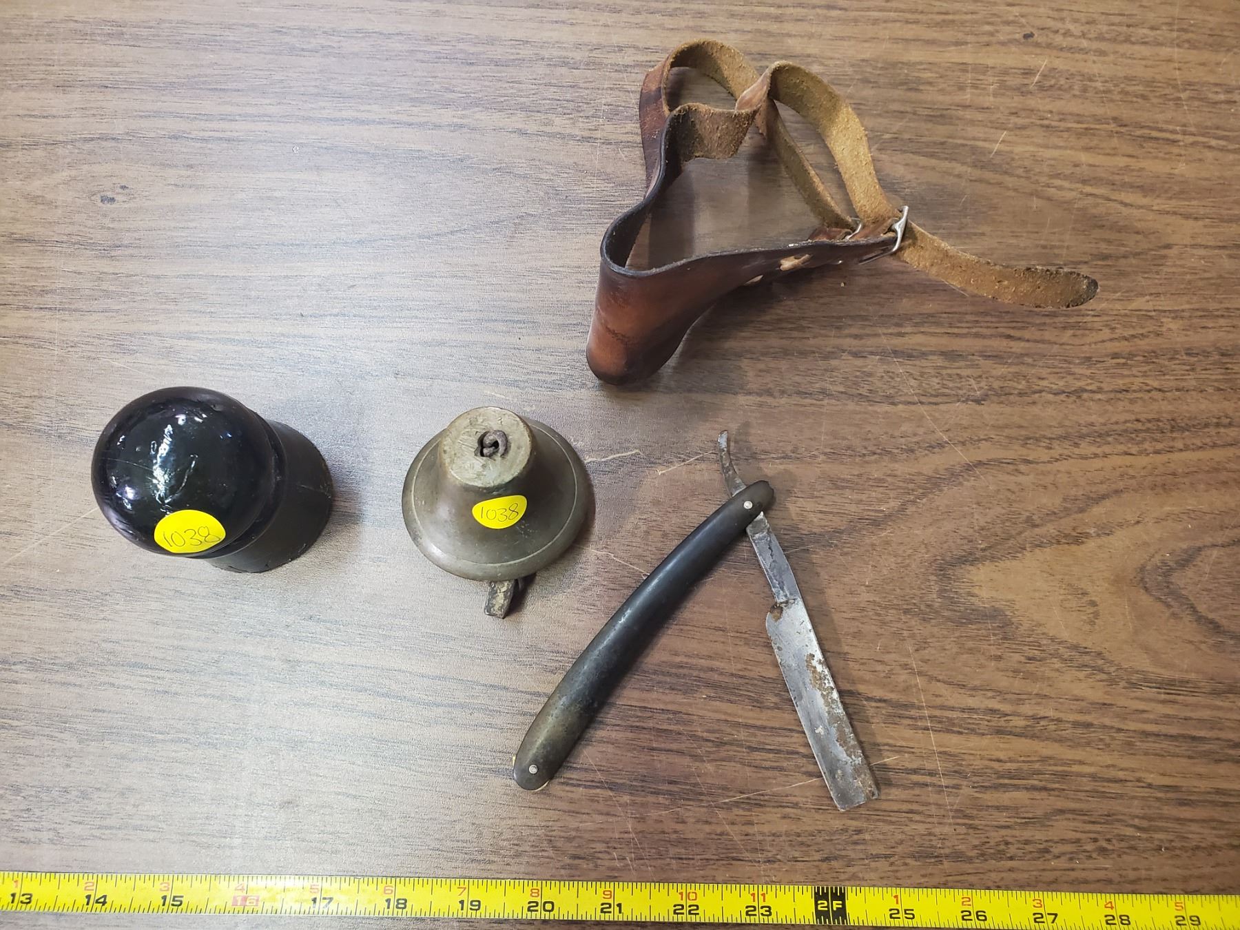 DARK GREEN INSULATOR, ANTIQUE BRASS BELL, RAZOR AND LEATHER STRAP