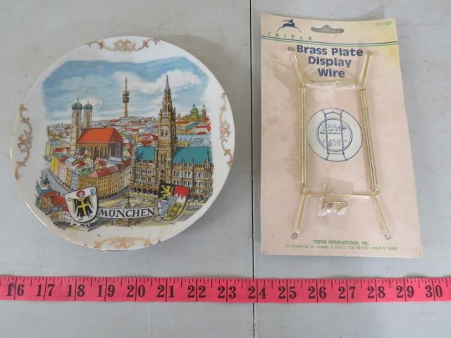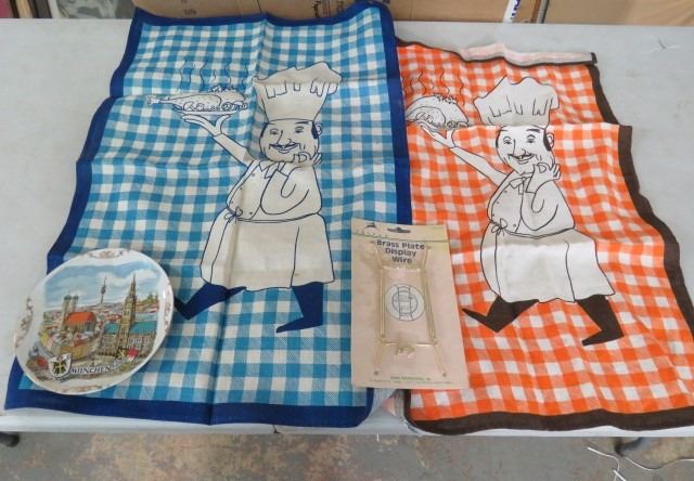 DECORATIVE PLATE, DISPLAY STAND AND TWO IRISH LINEN TOWELS