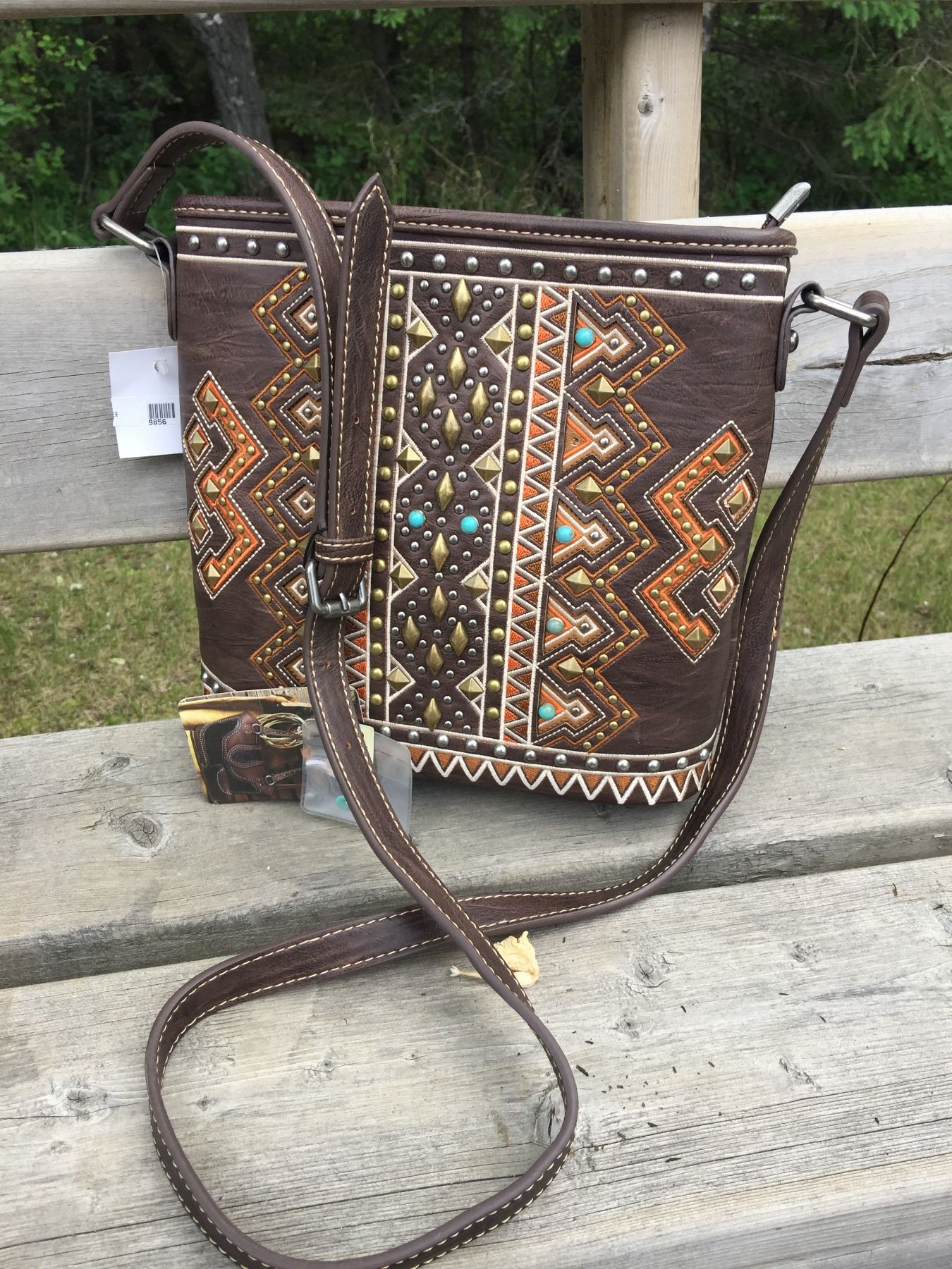 DISCOUNT PURSE/BROWN MULTI COLOR DESIGN ON FRONT (MISSSING ONE STUD ON FRONT DESIGN)