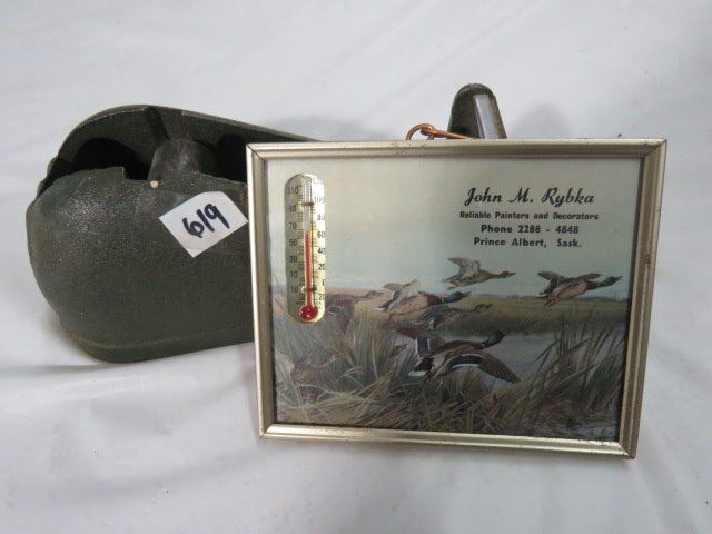 DUREX TAPE DESPENSER (CAST IRON FOR CELLULOSE TAPE) & WALL THERMOMETER (BY JOHN M. RYBKA OF PRINCE ALBERT)