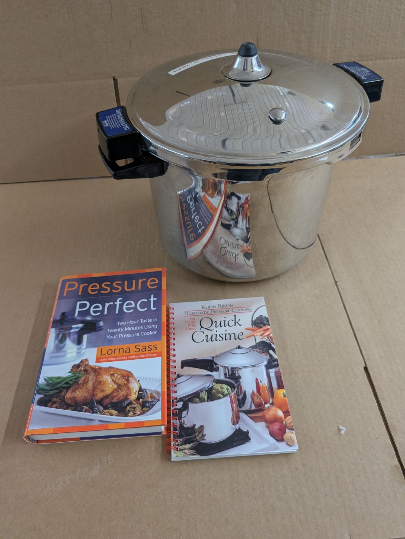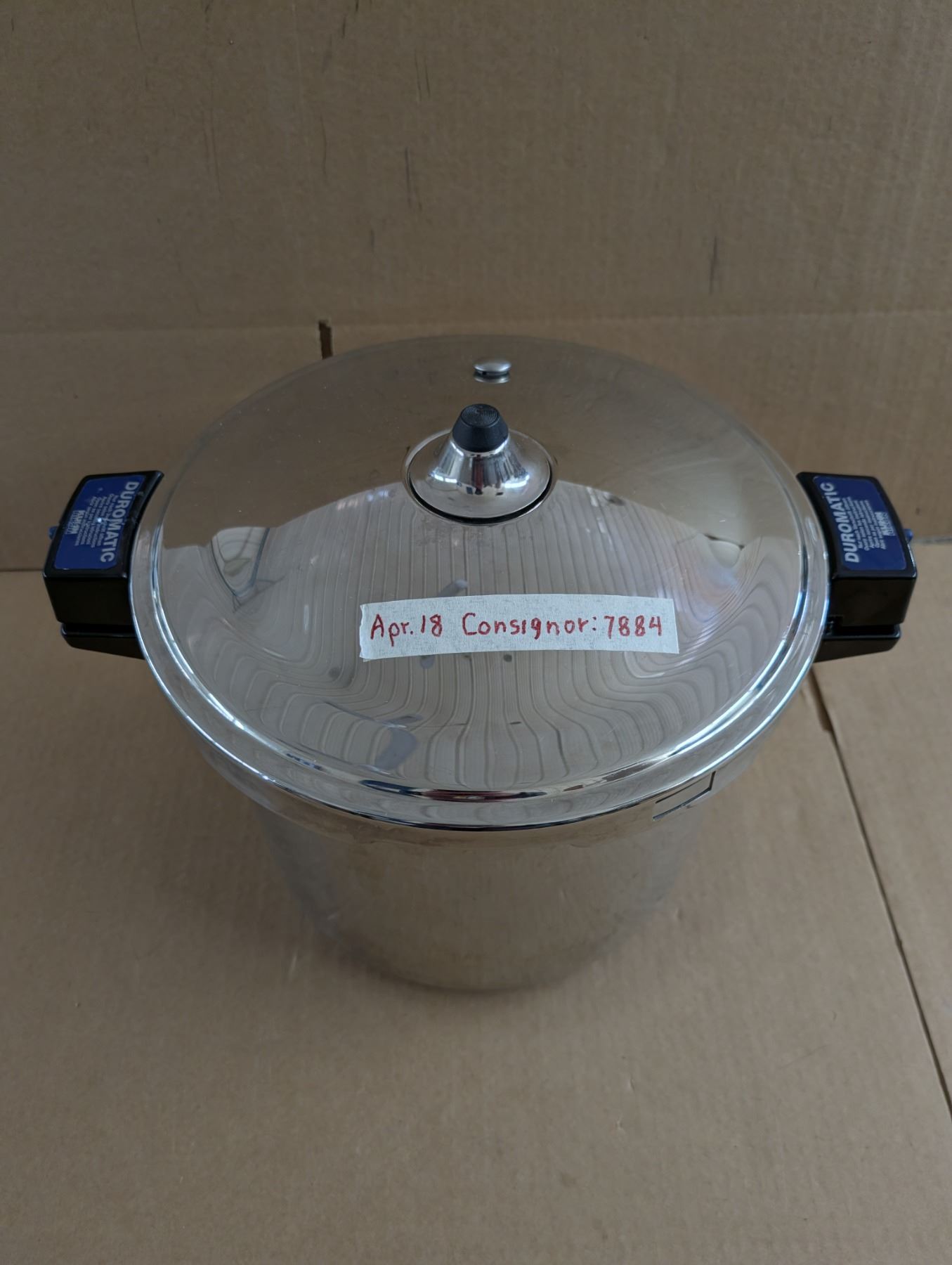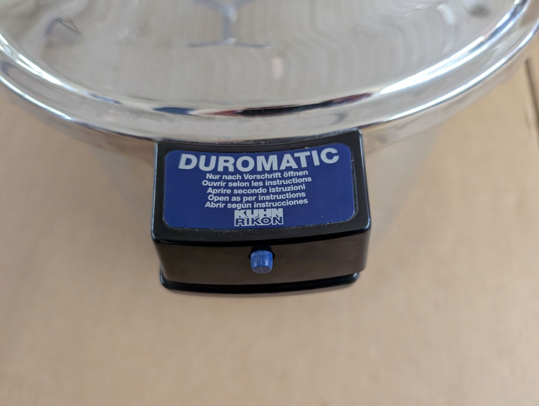 DUROMATIC Pressure Cooker; works well. Two recipe books included.