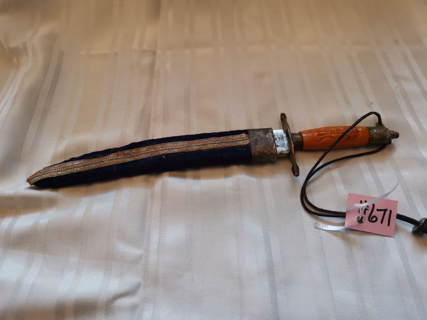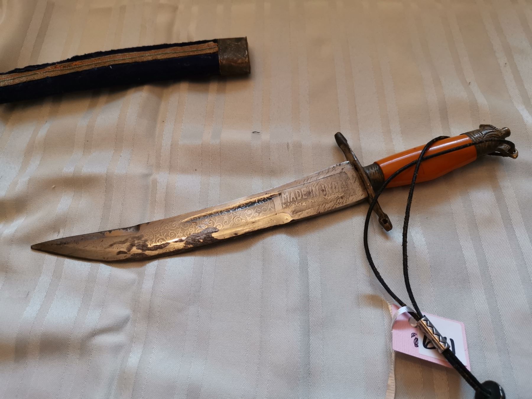 Dagger, chased 8” blade, bakelite grip, marked, “Made in India”