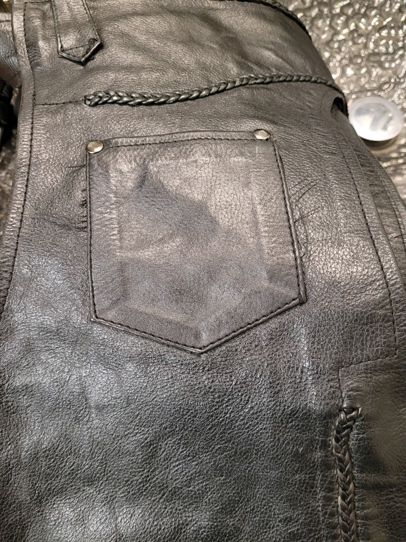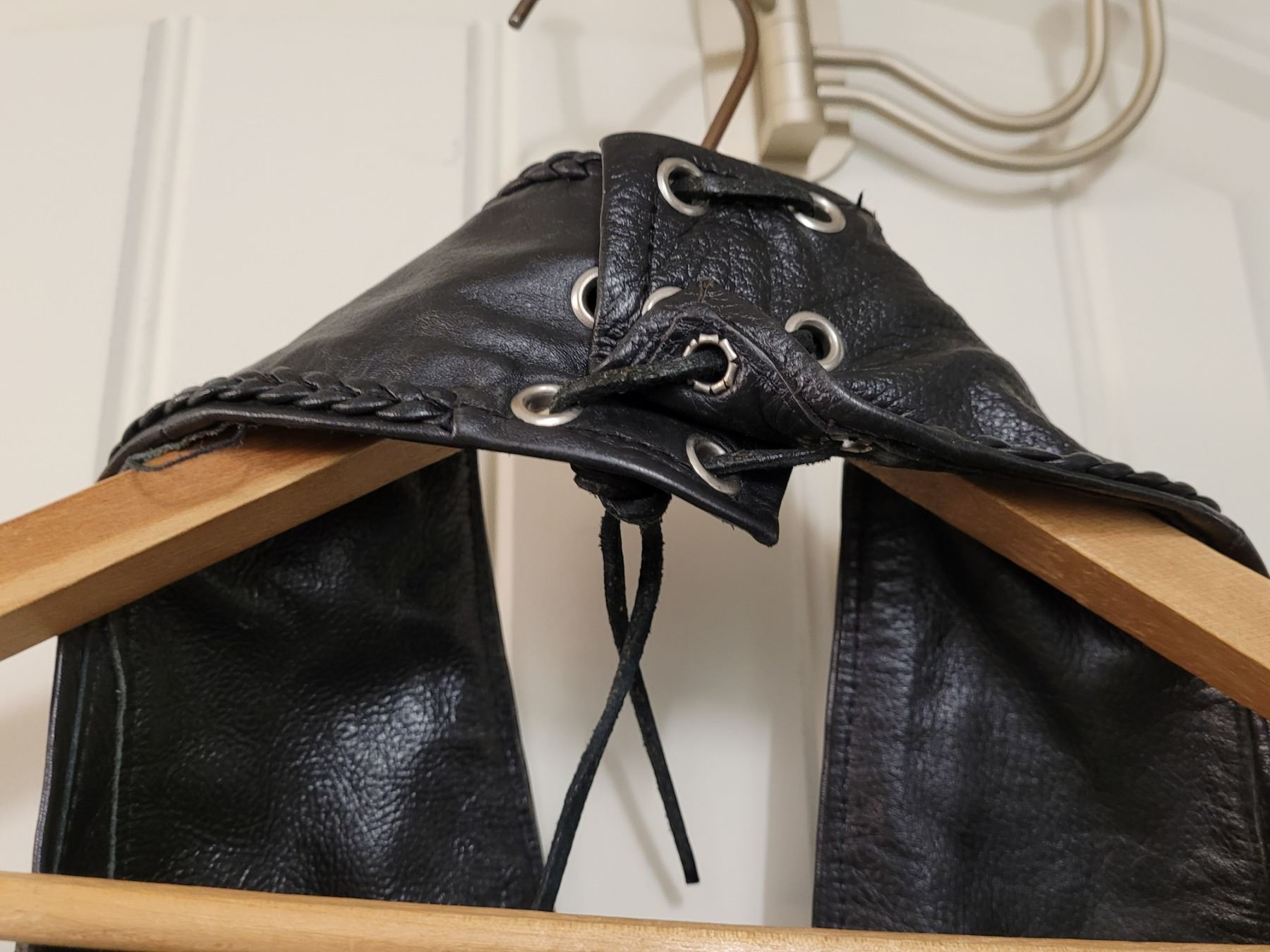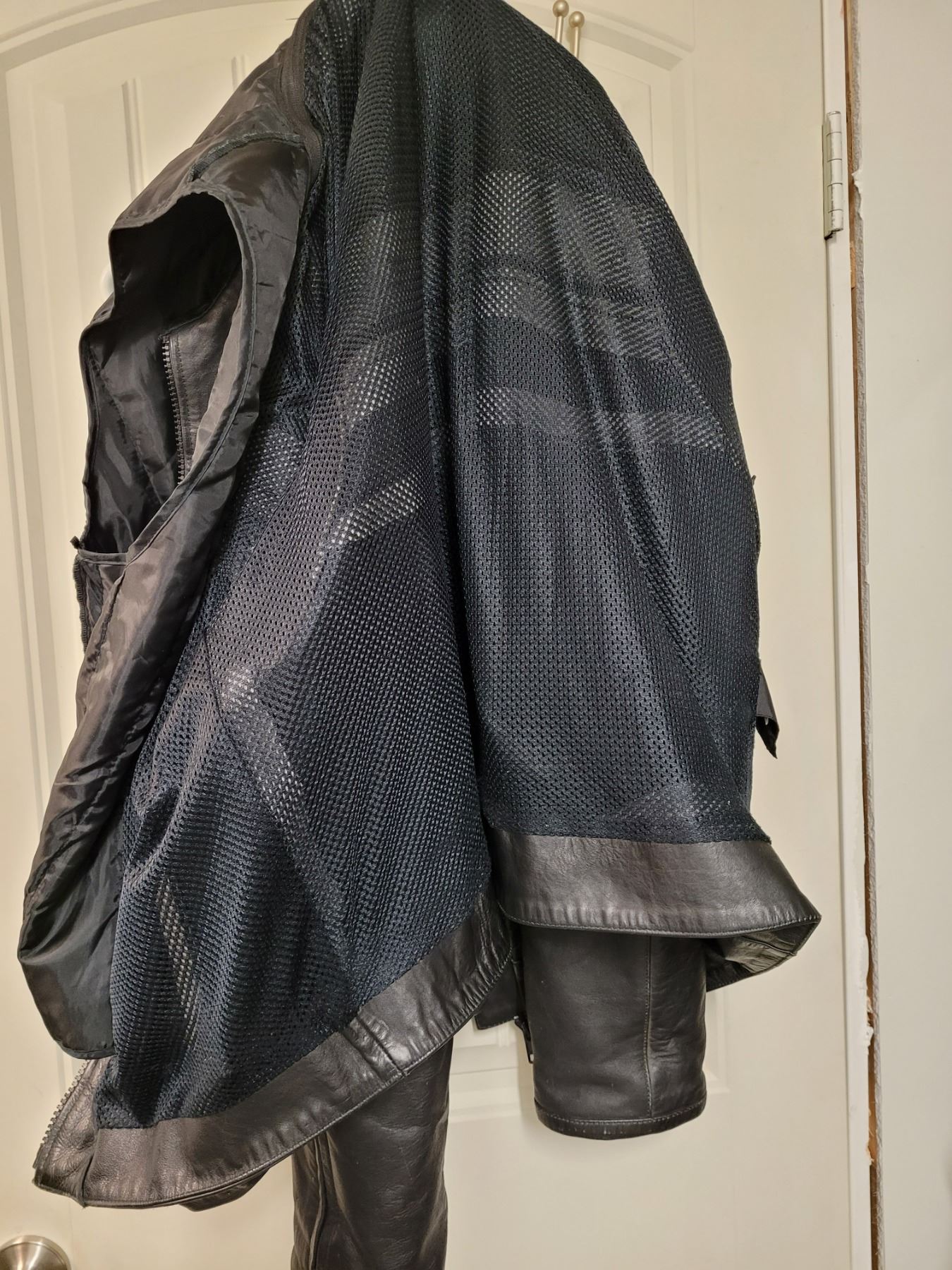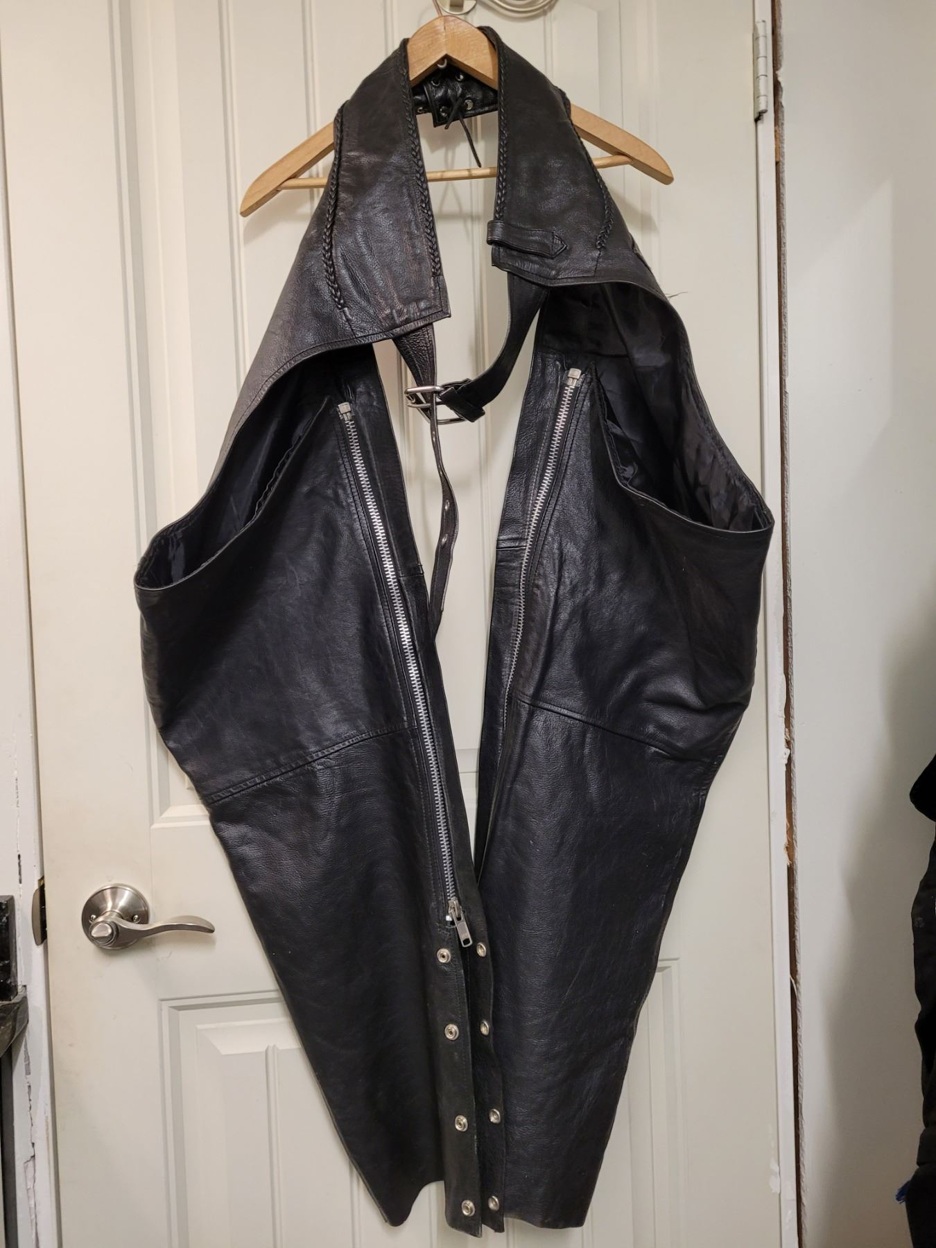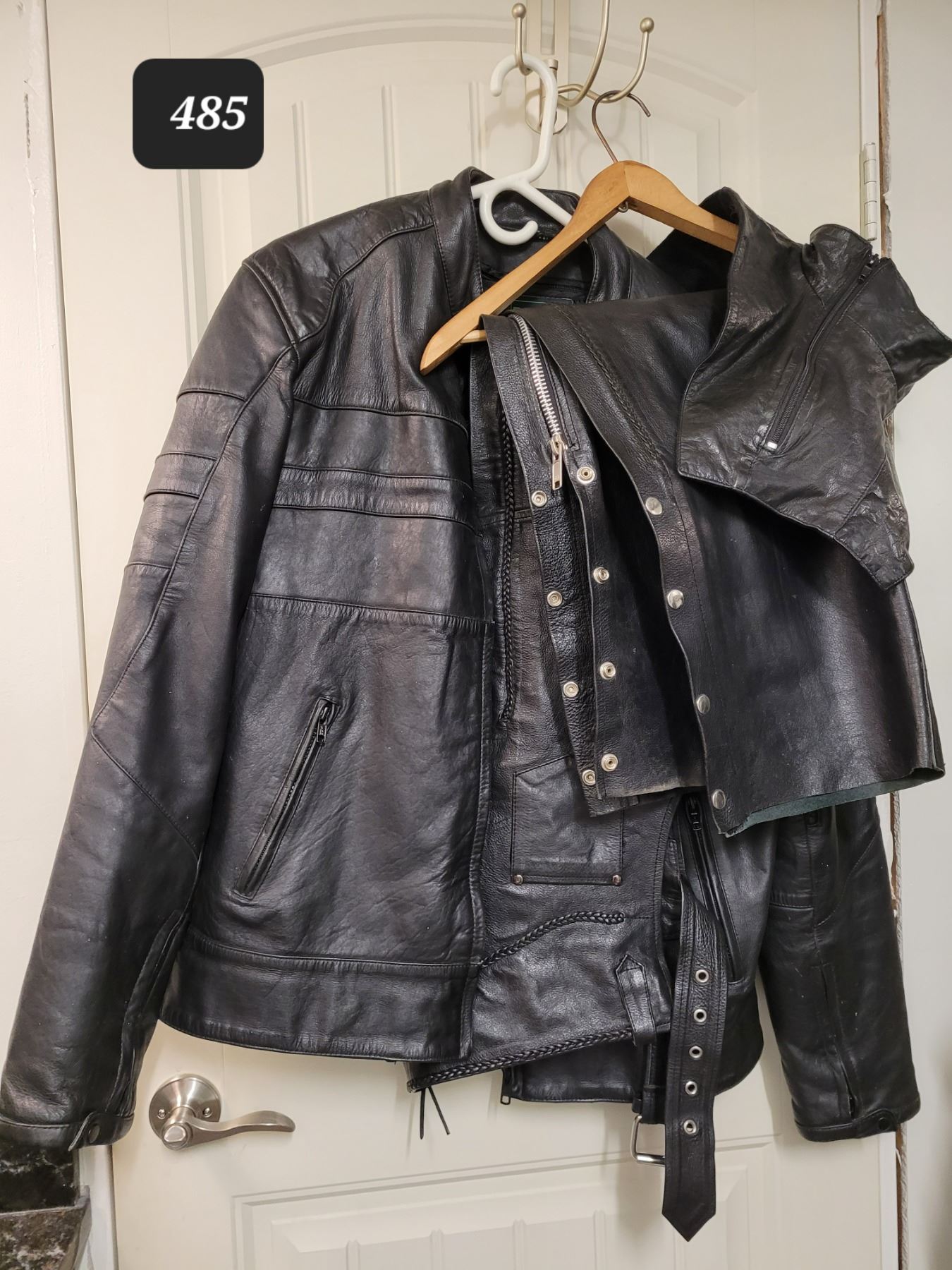 Danilo Italian leather biker attire. Jacket (XL) with zip out liner, leg chaps & neck cover.