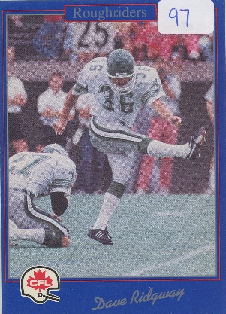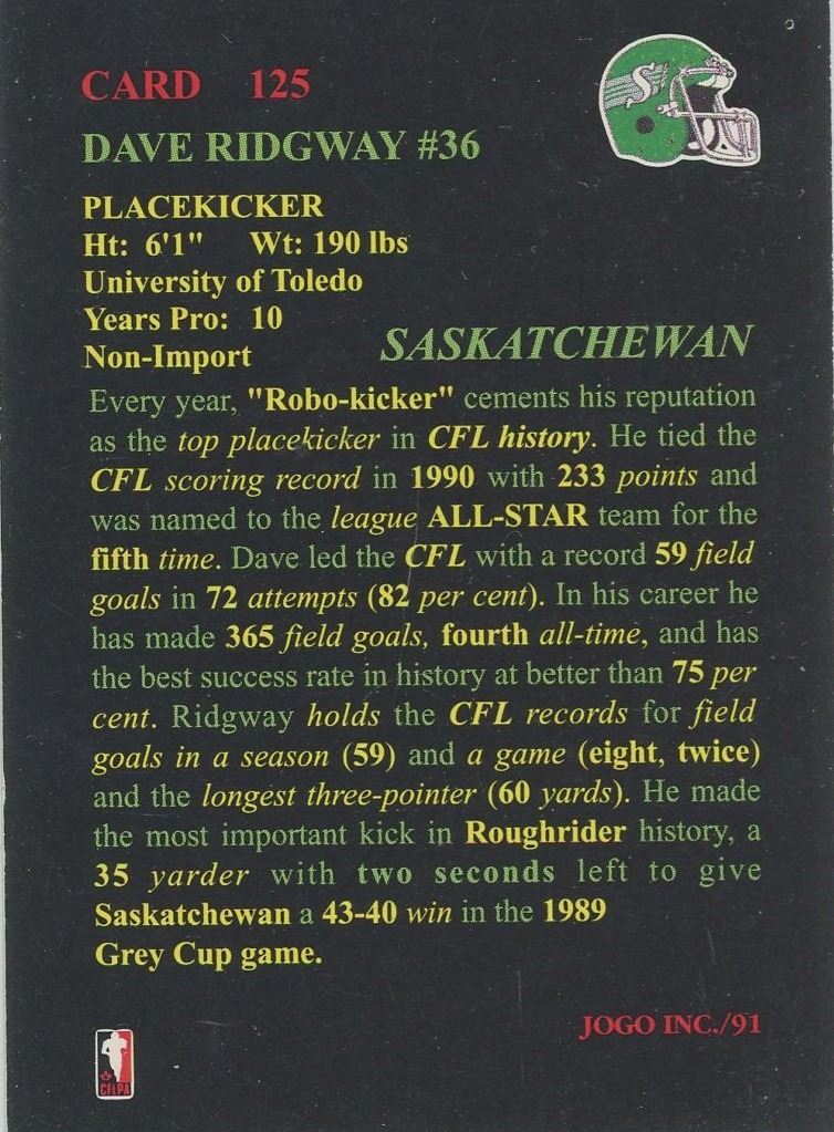 Dave Ridgeway, K, Saskatchewan Roughriders. CFL Football card. 1991 Jogo. Gem Unc.