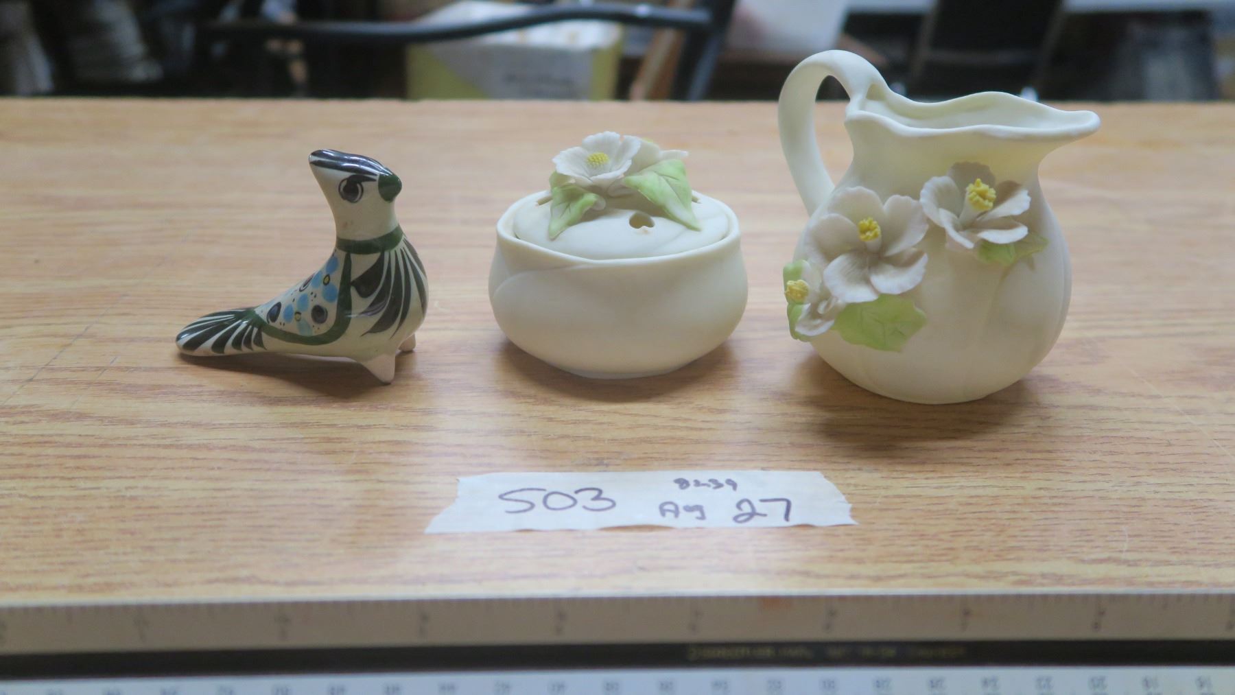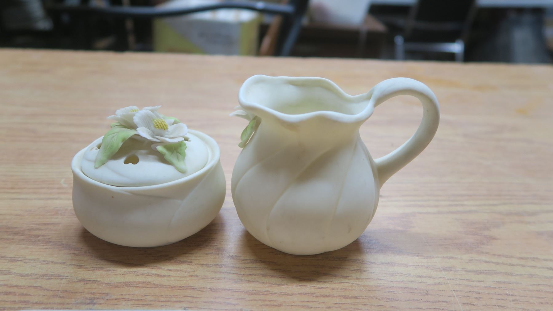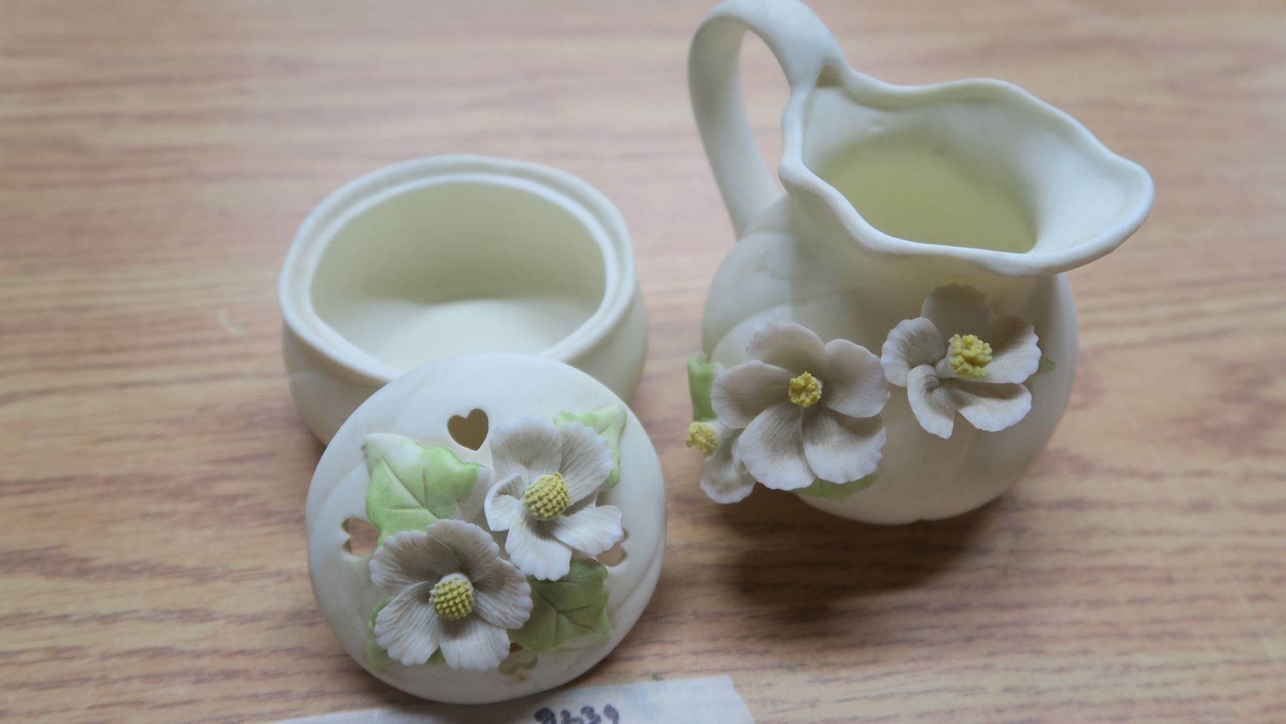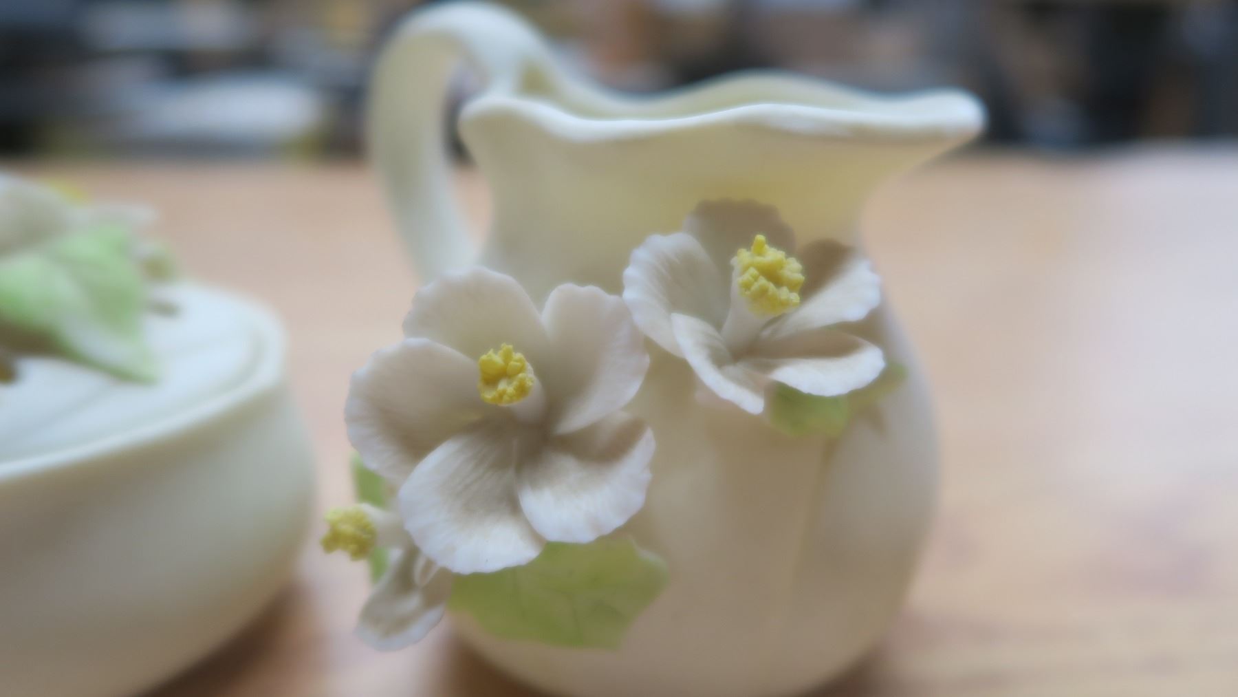 Decorative cream &sugar set with flowers. Ceramic bird.