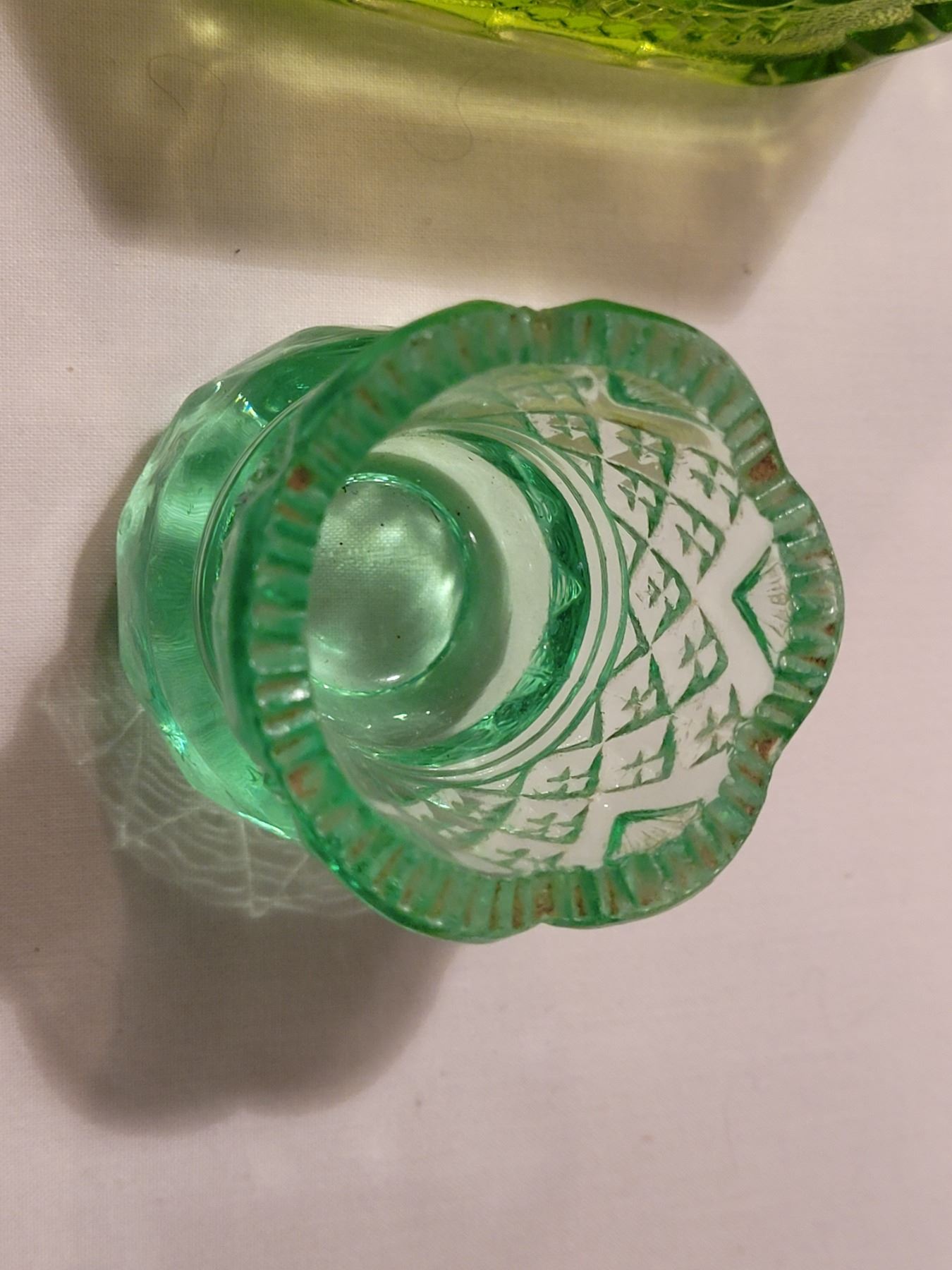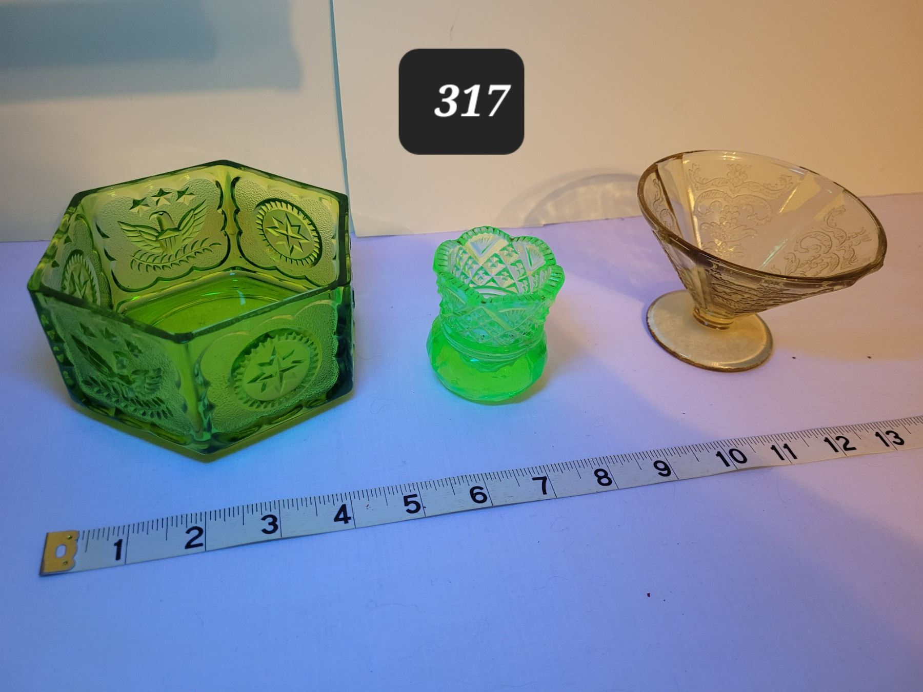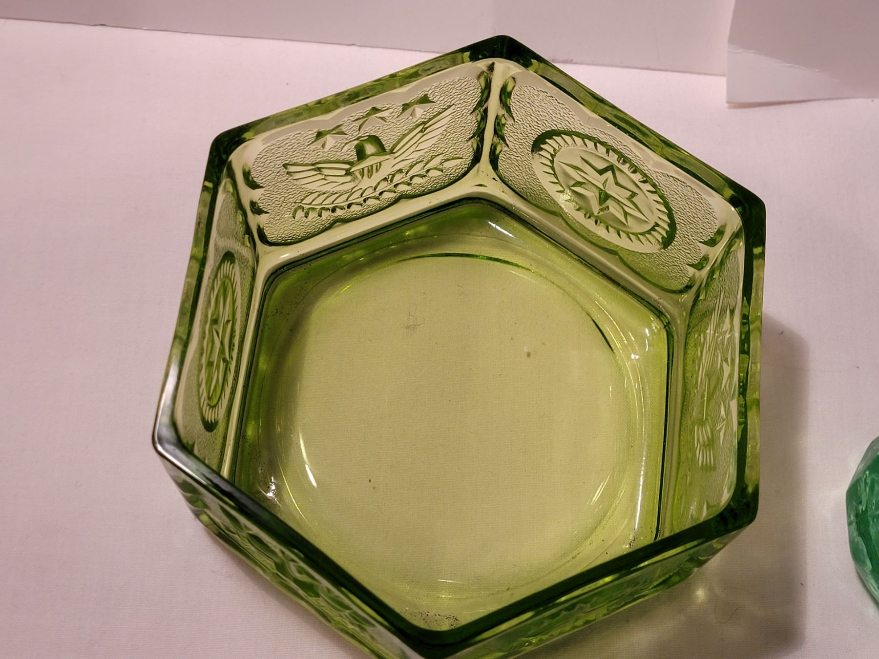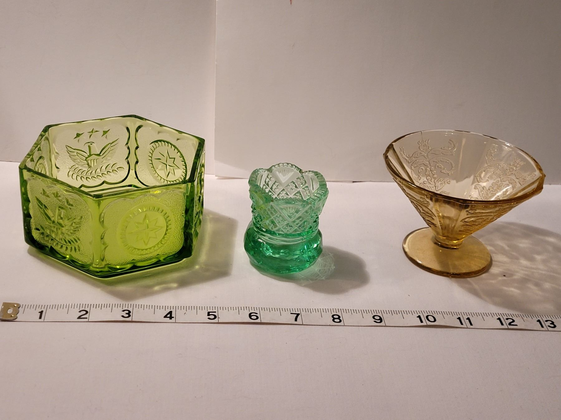 Depression glass fruit nappe, green candy dish & small uranium glass