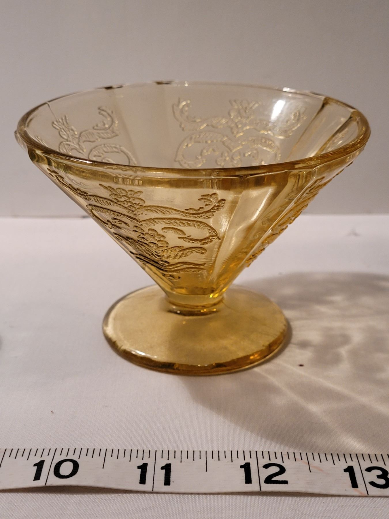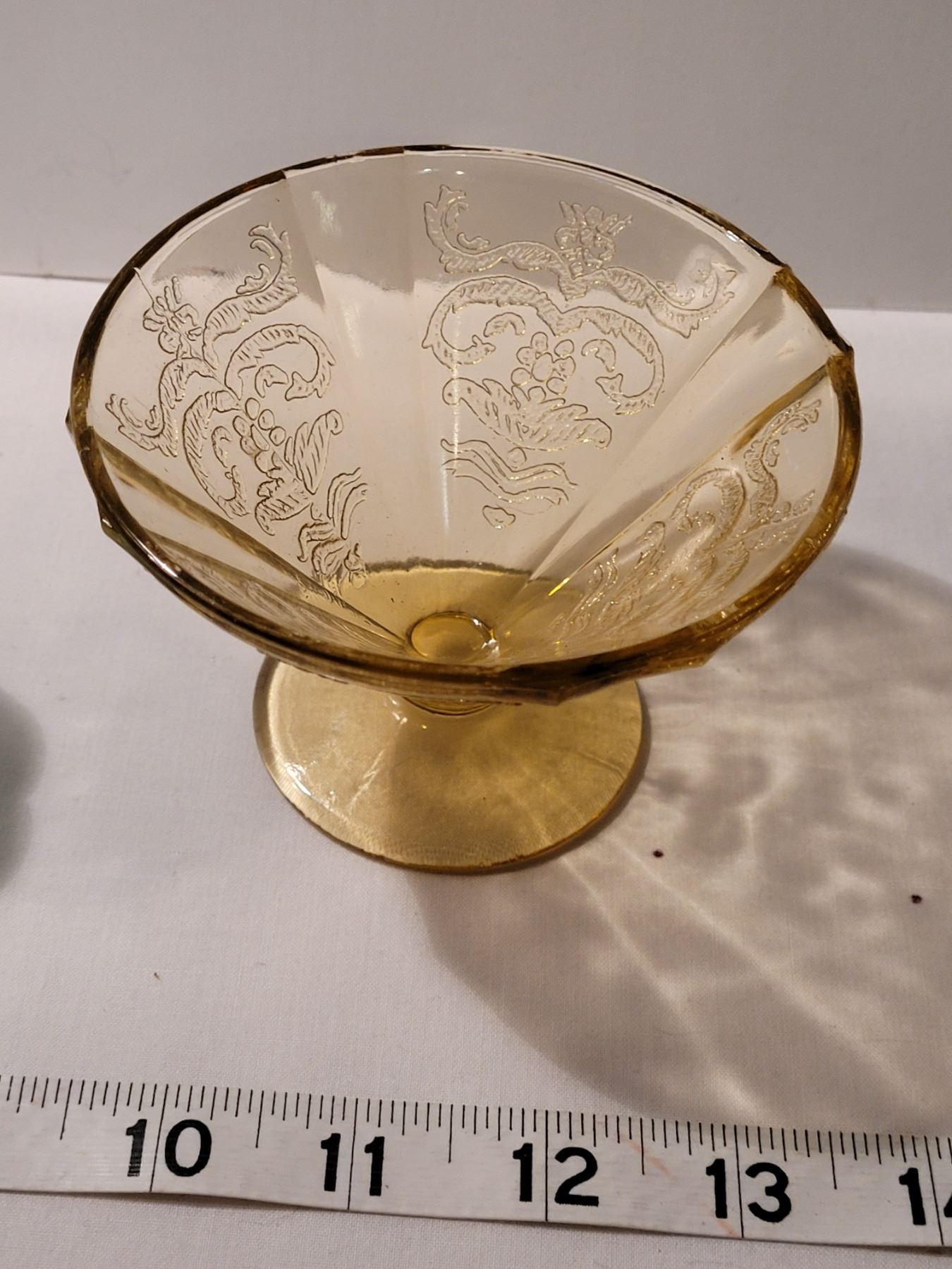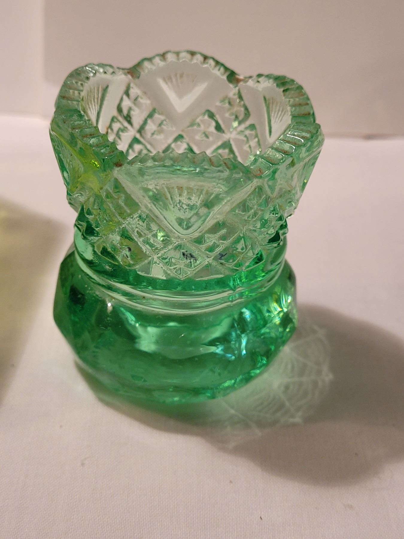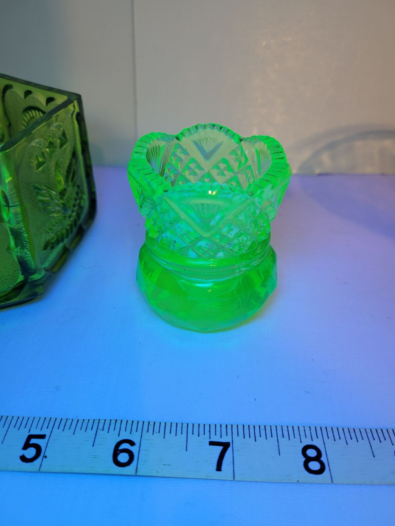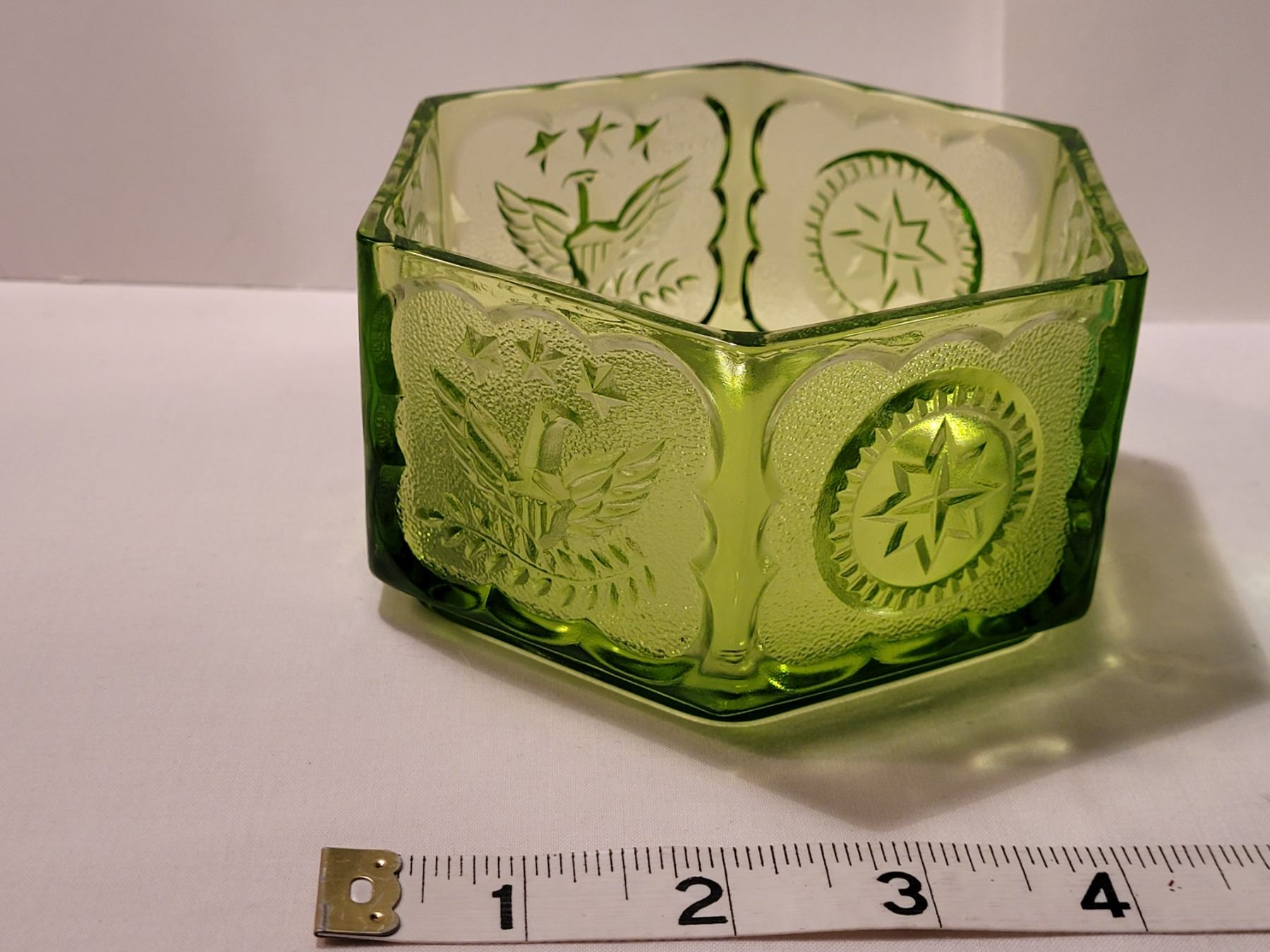 Depression glass fruit nappe, green candy dish & small uranium glass