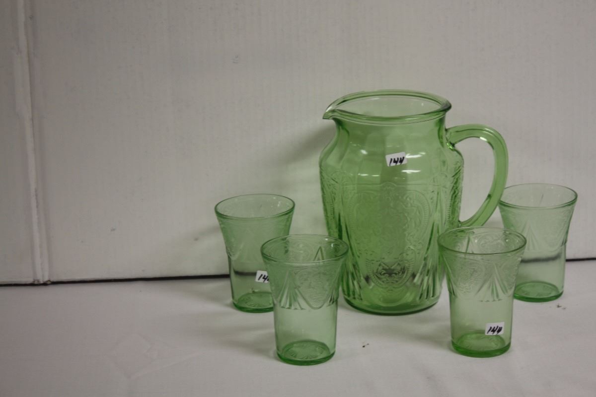 This is a Green Royal lace pattern pitcher with 4 matching glasses