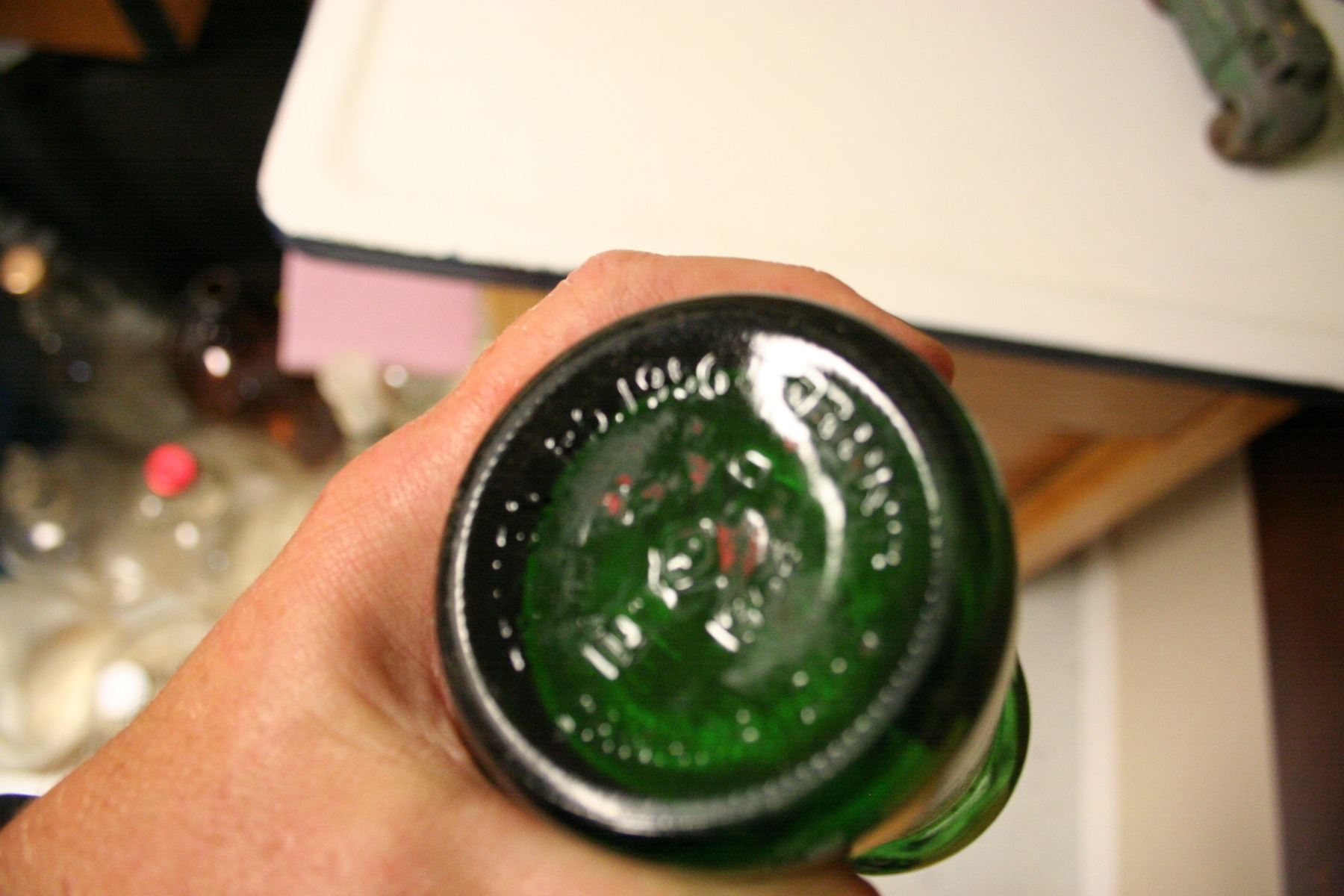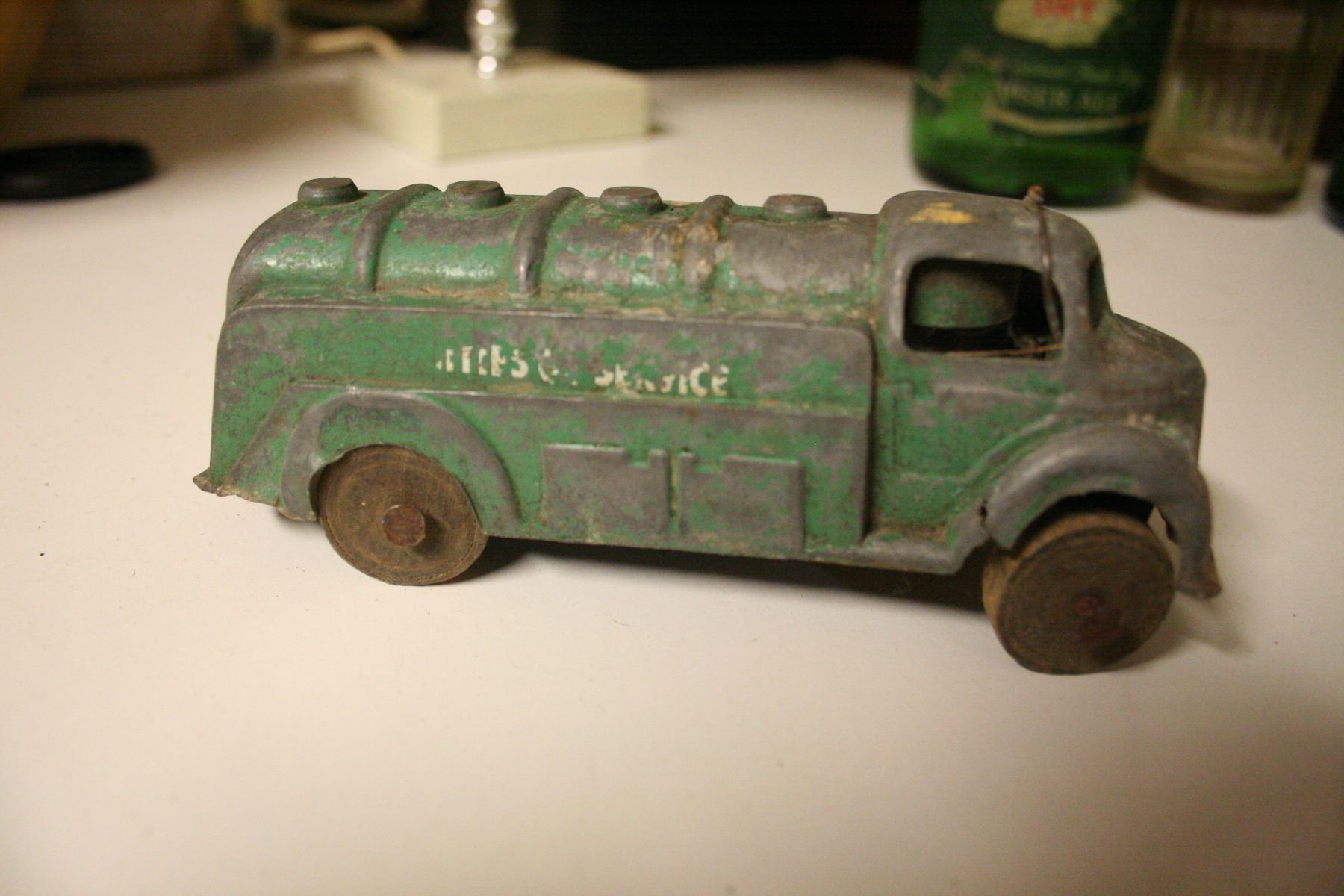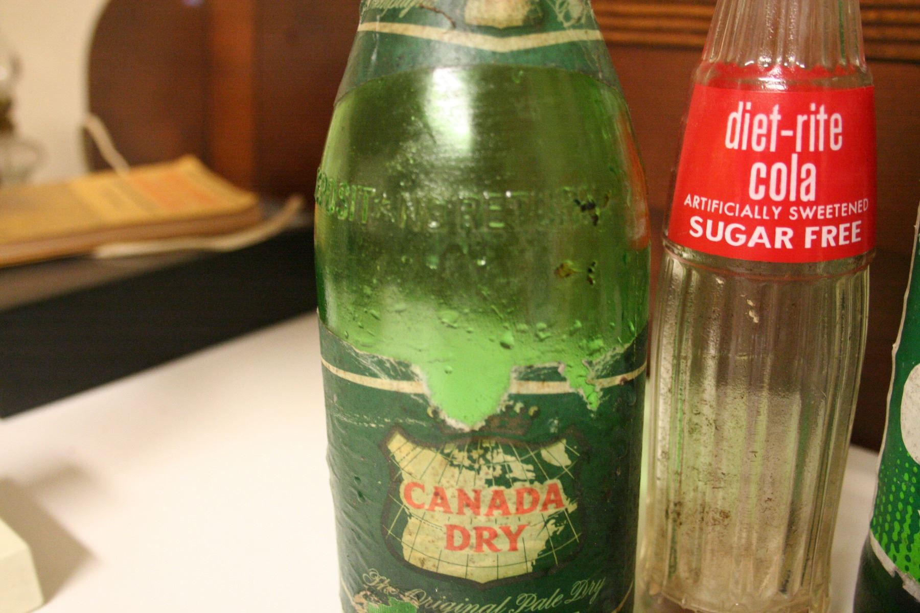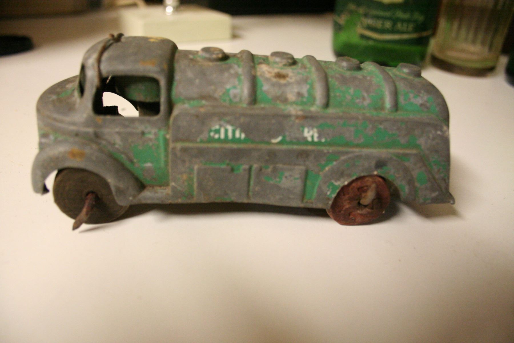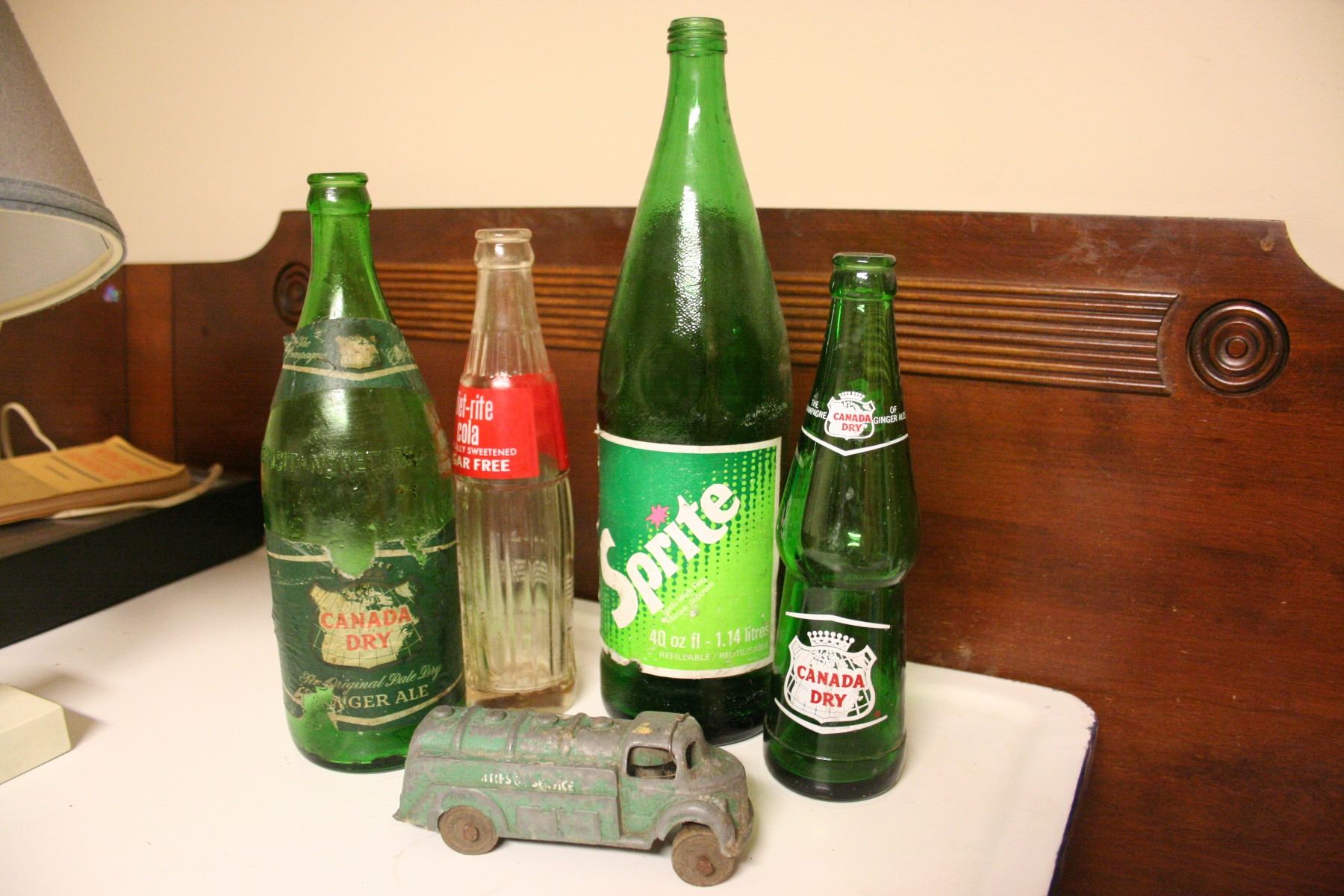 Diet-rite Cola Bottle, metal toy truck and various soda bottles