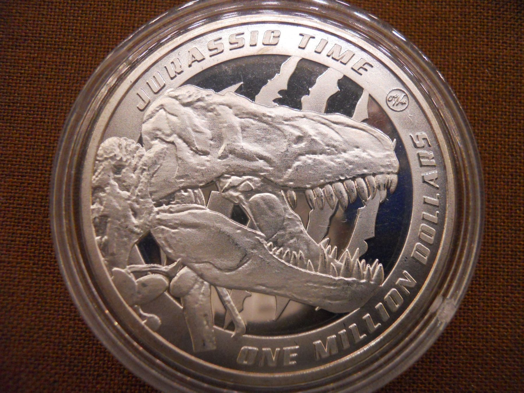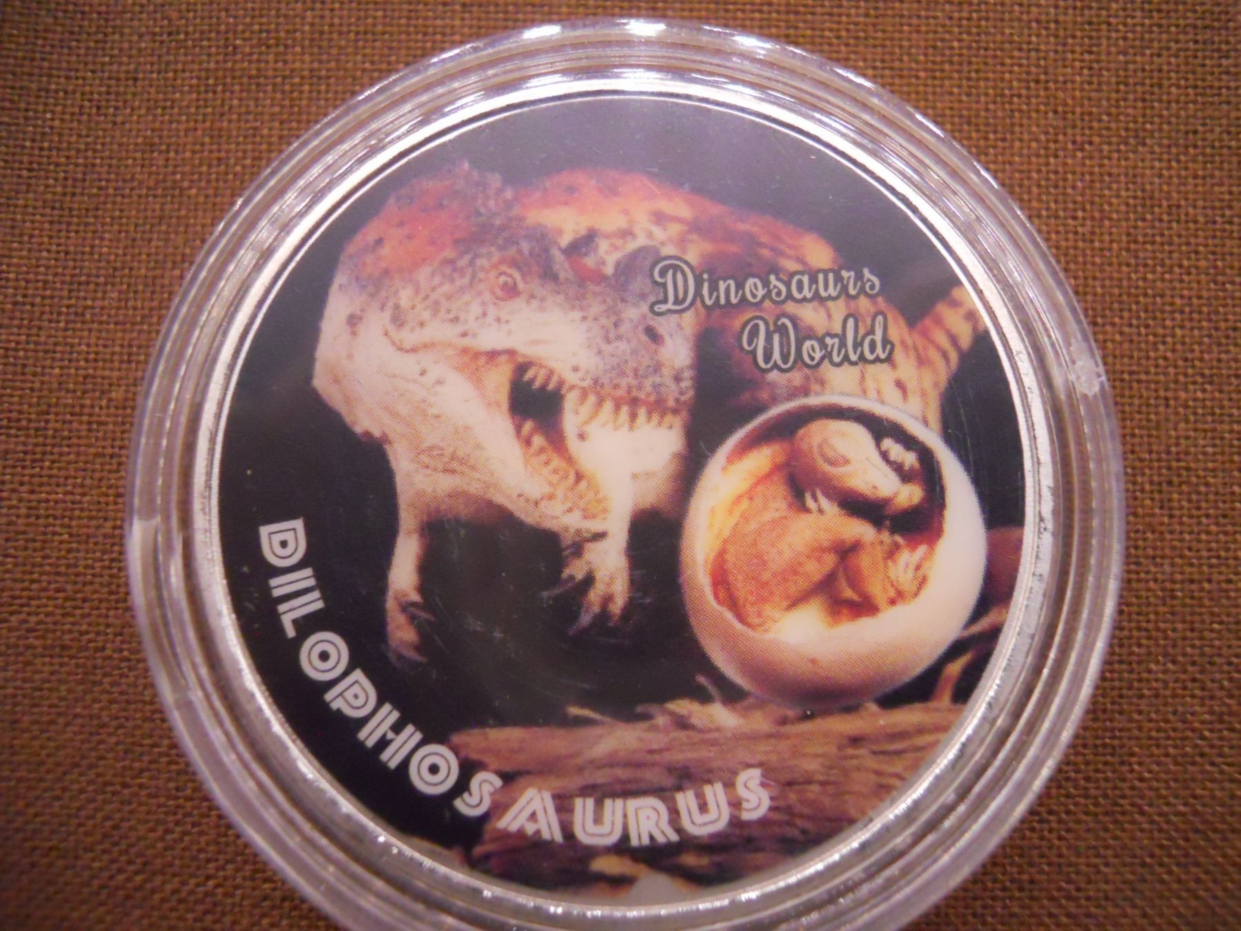 Dilophosaurus Rex Jurassic time Dinosaurs world NEW 1.5" In plastic coin case.