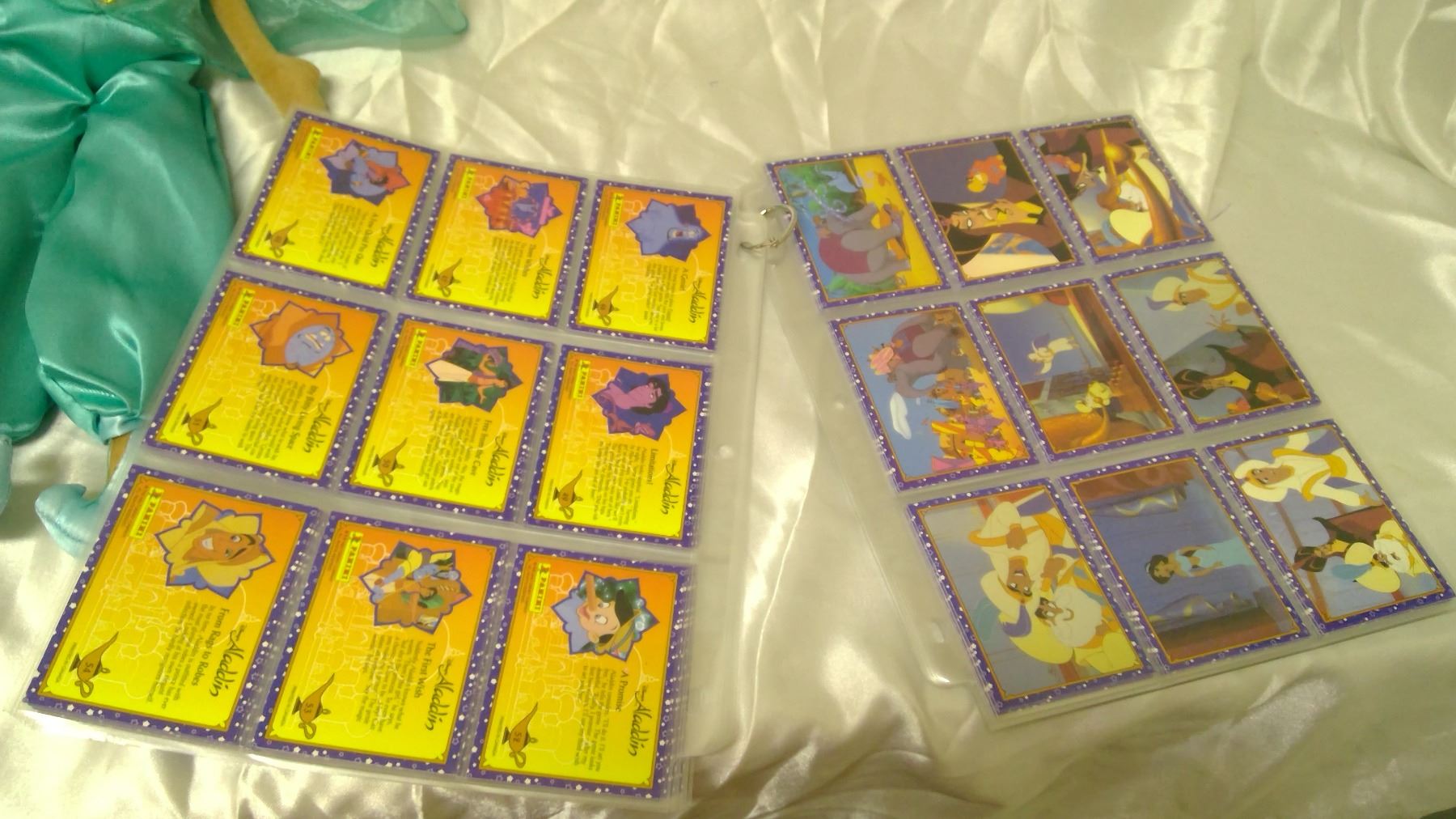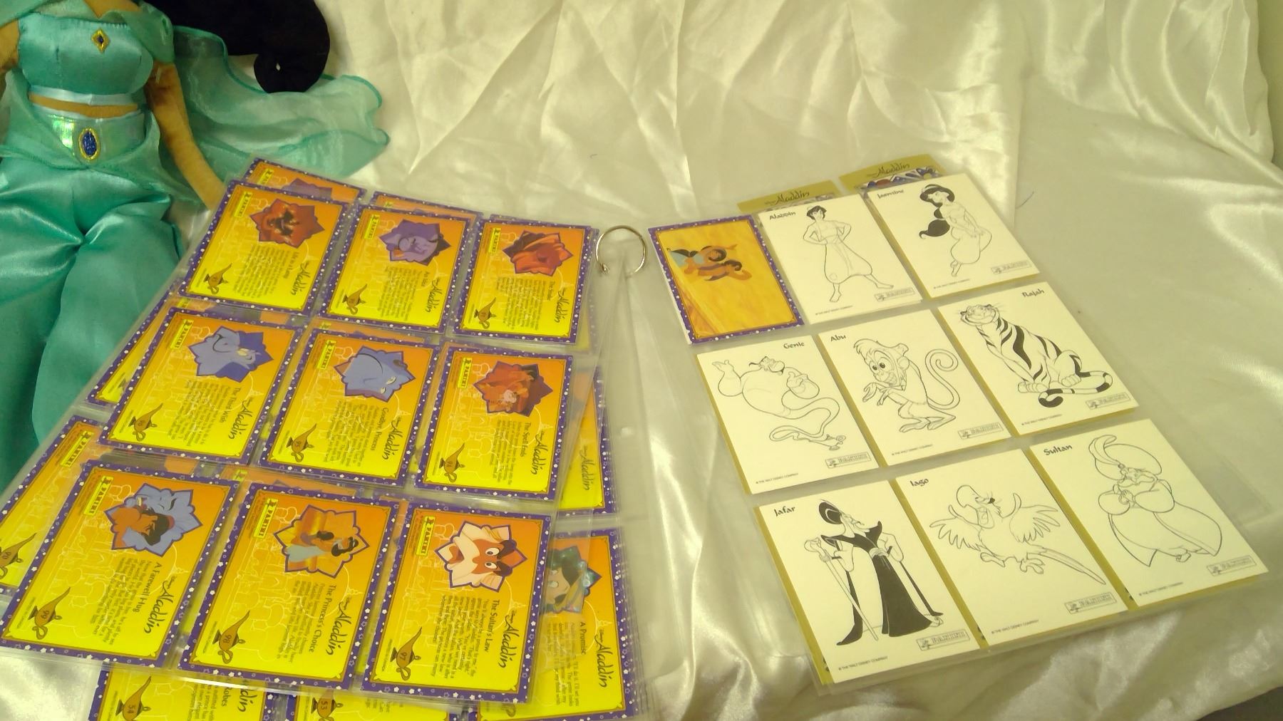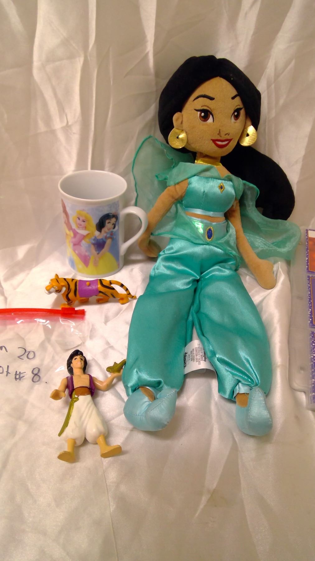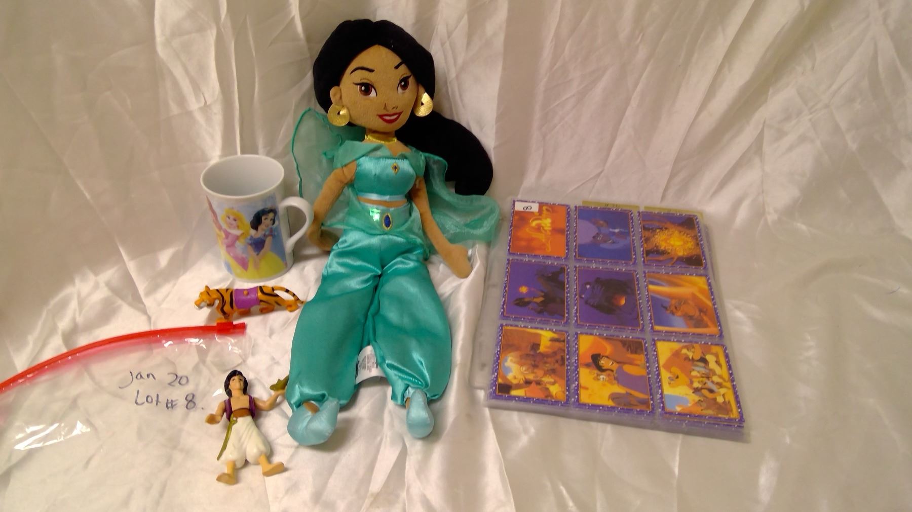 Disney Aladdin items – Jasmine Plush, 2 Plastic Toys, 119 Collector Cards, 1 Mug