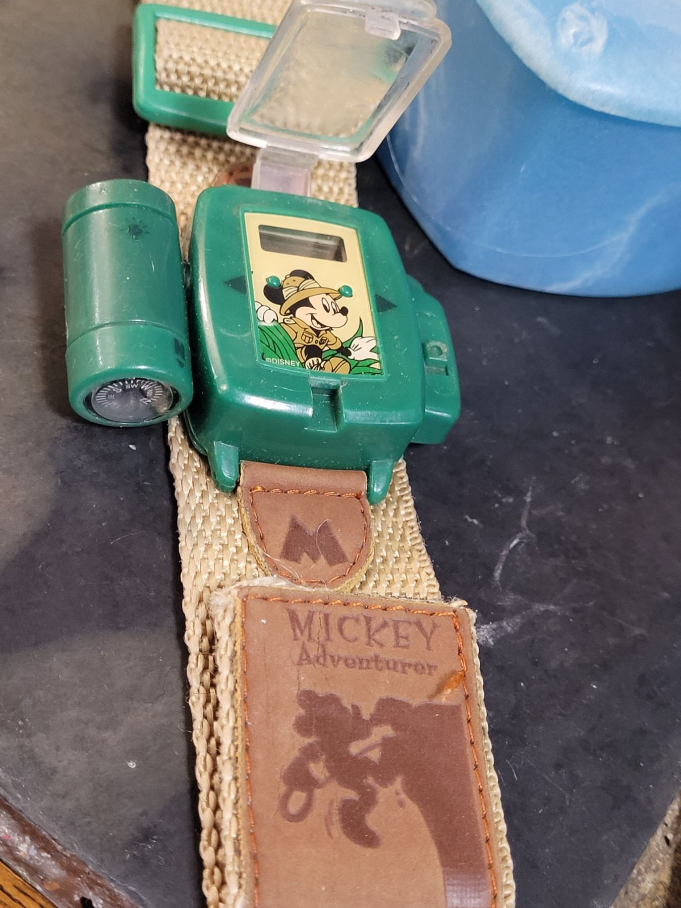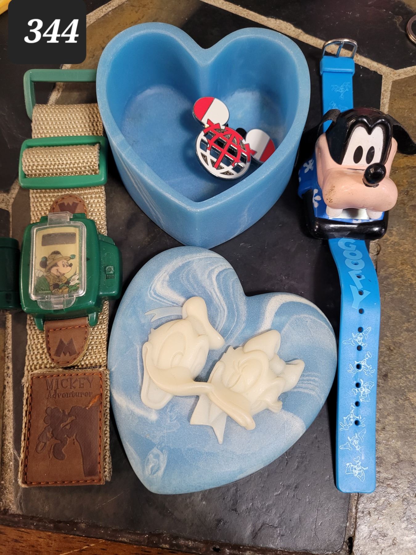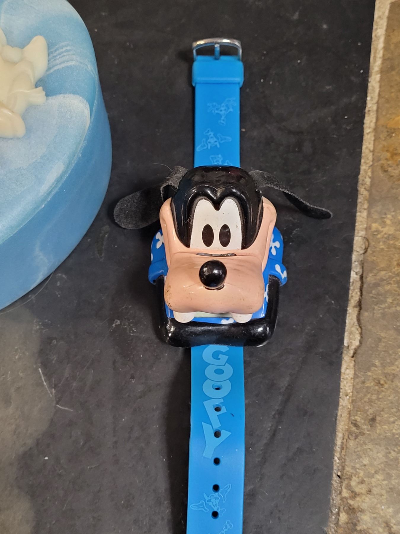 Disney trinket box. Mickey Mouse & 1981 Goofy digital watches.