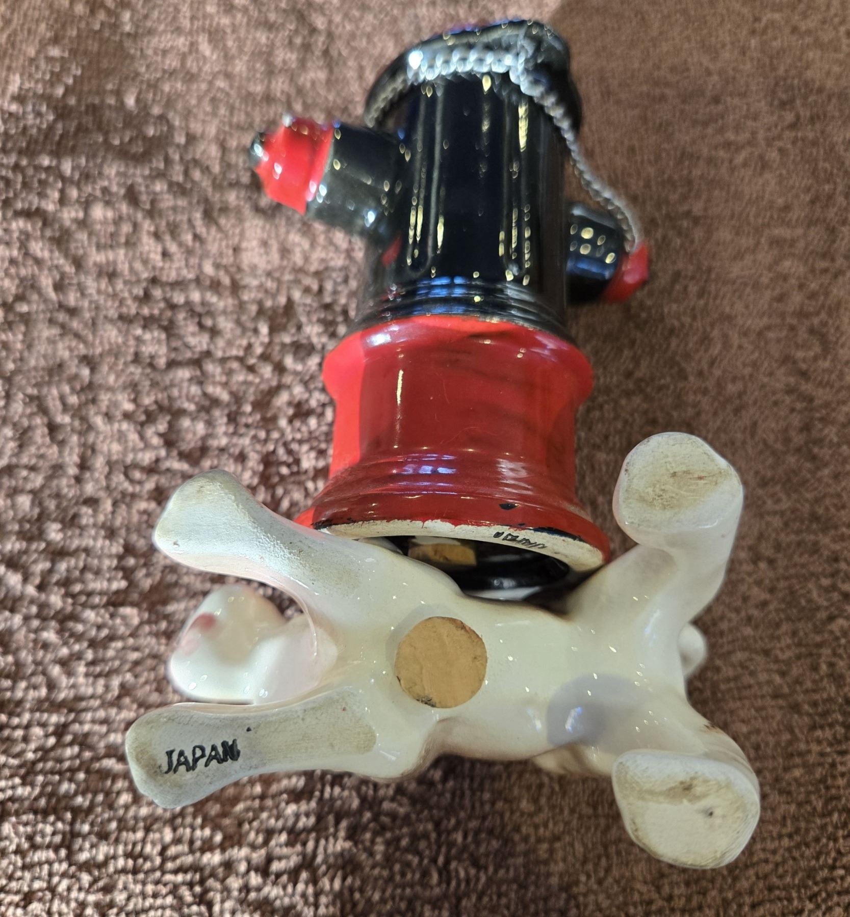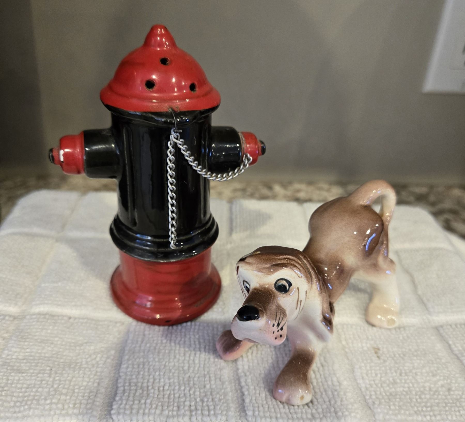 Dog and fire hydrant porcelain salt and pepper shakers. 1950s. Kitchy salt & pepper. Marked Japan. Chain needs repair.