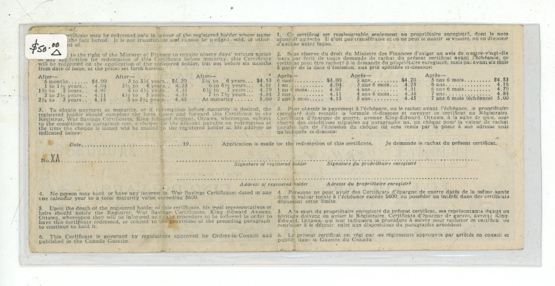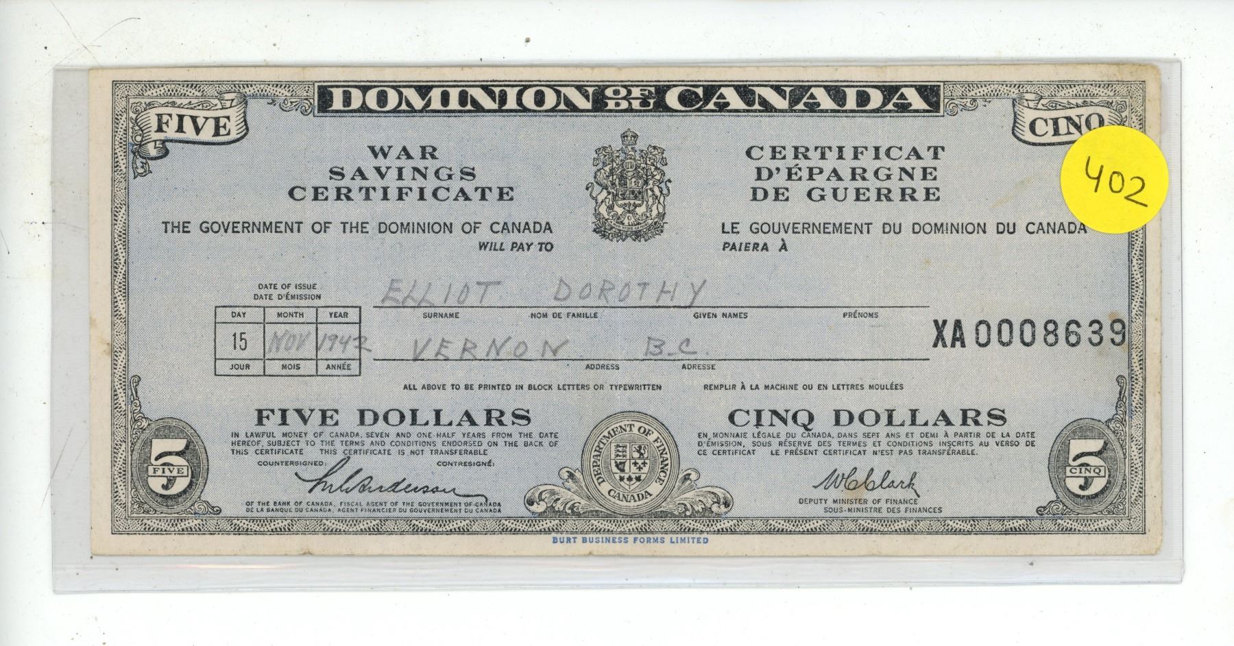 Dominion of Canada $5 War Savings Certificate. Purchased by Dorothy Elliot of Vernon BC in 1942. VF. Scarce.