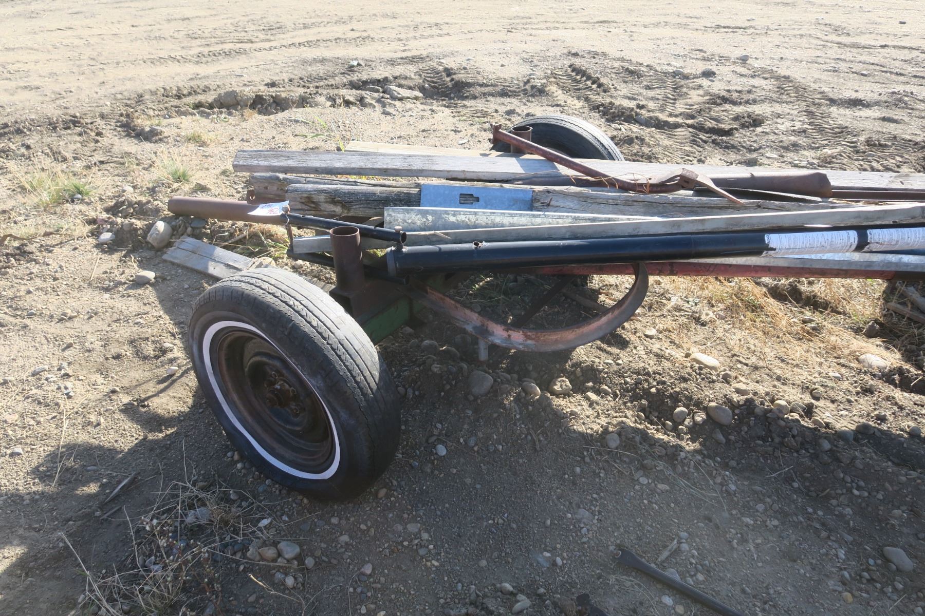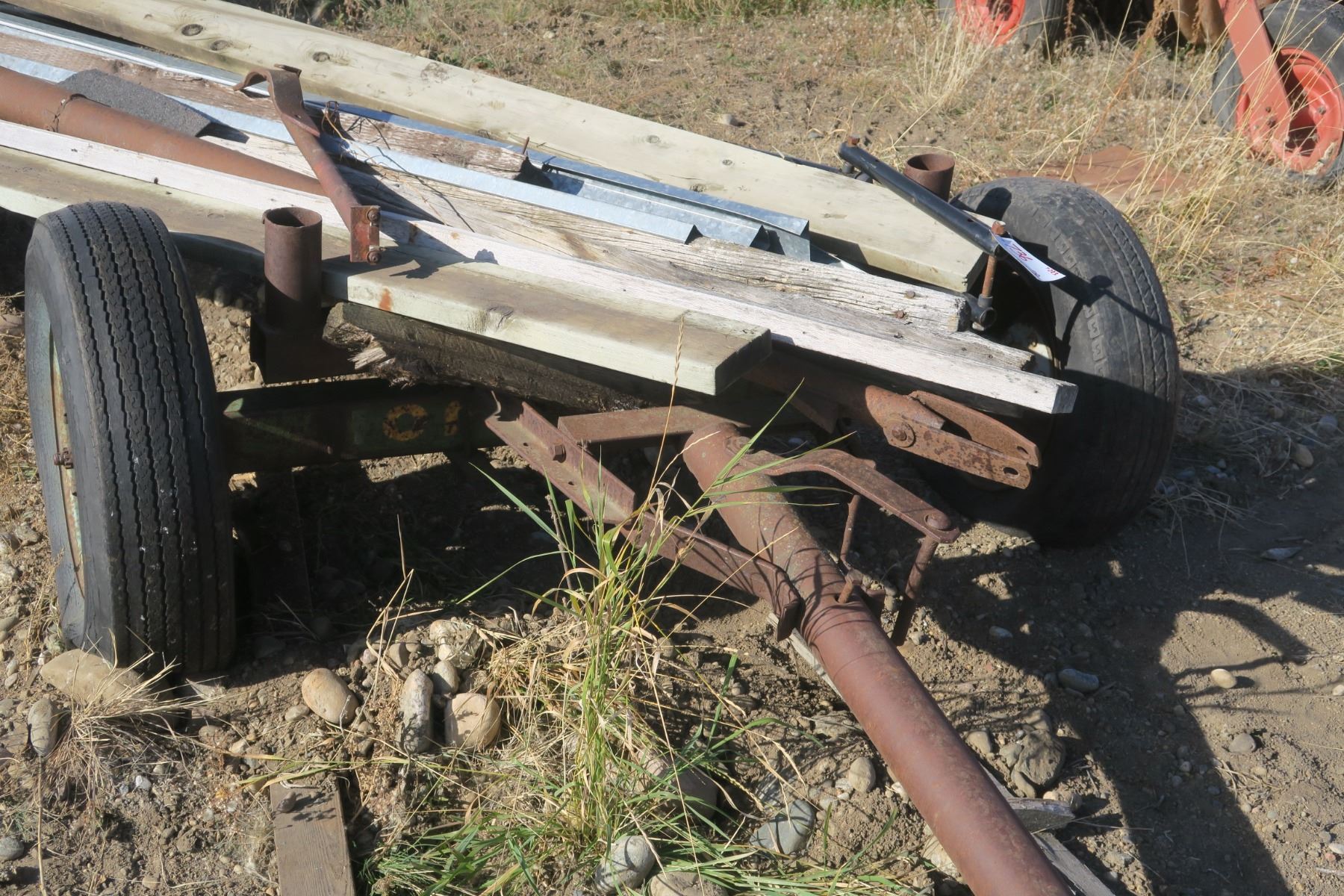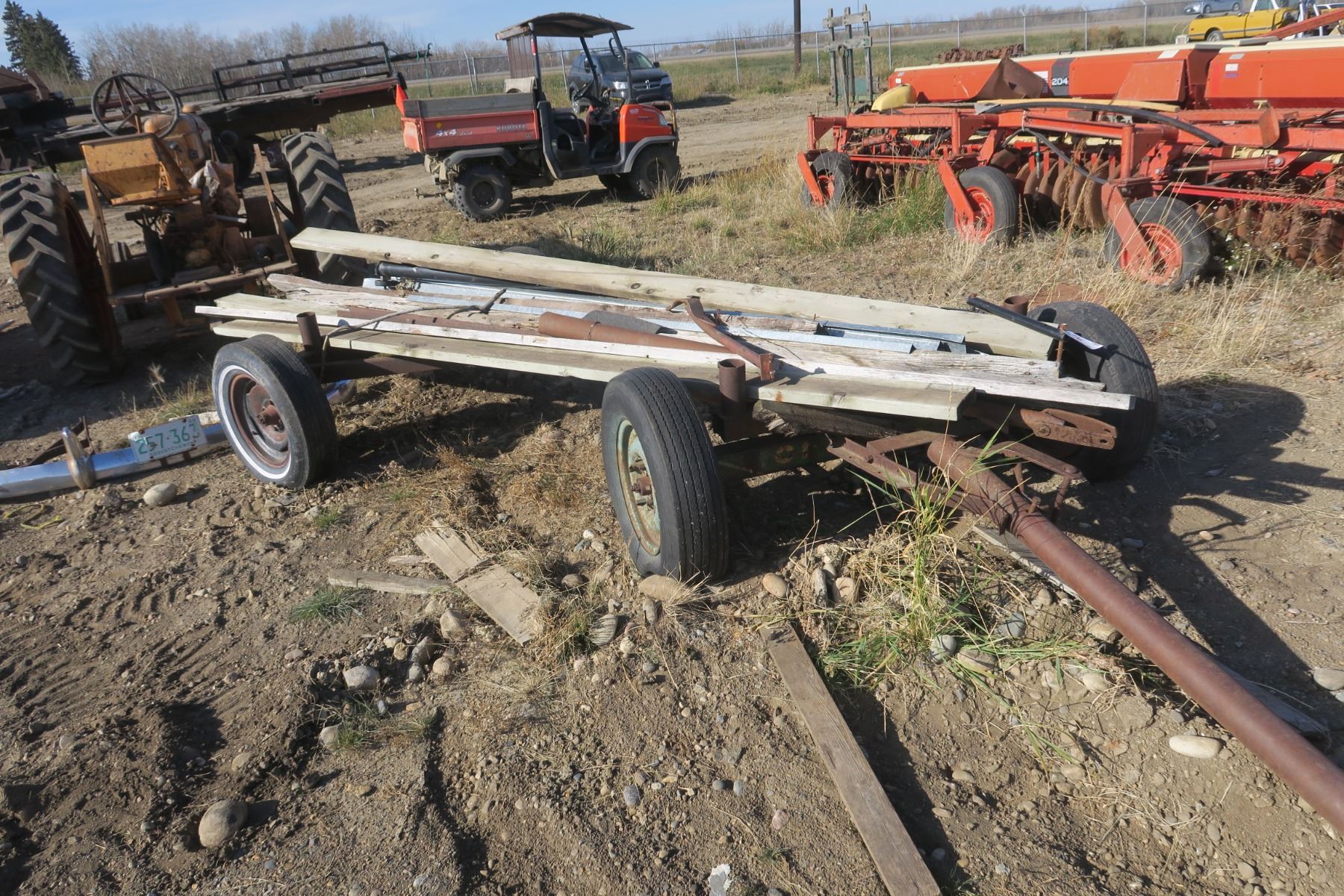 Double axle hay trailer with misc wood items on it