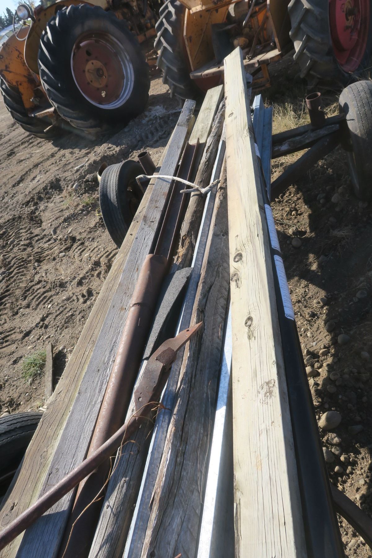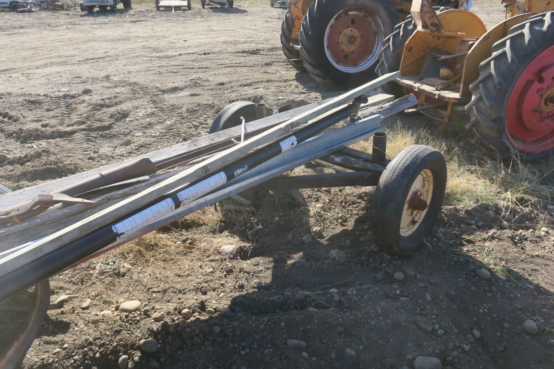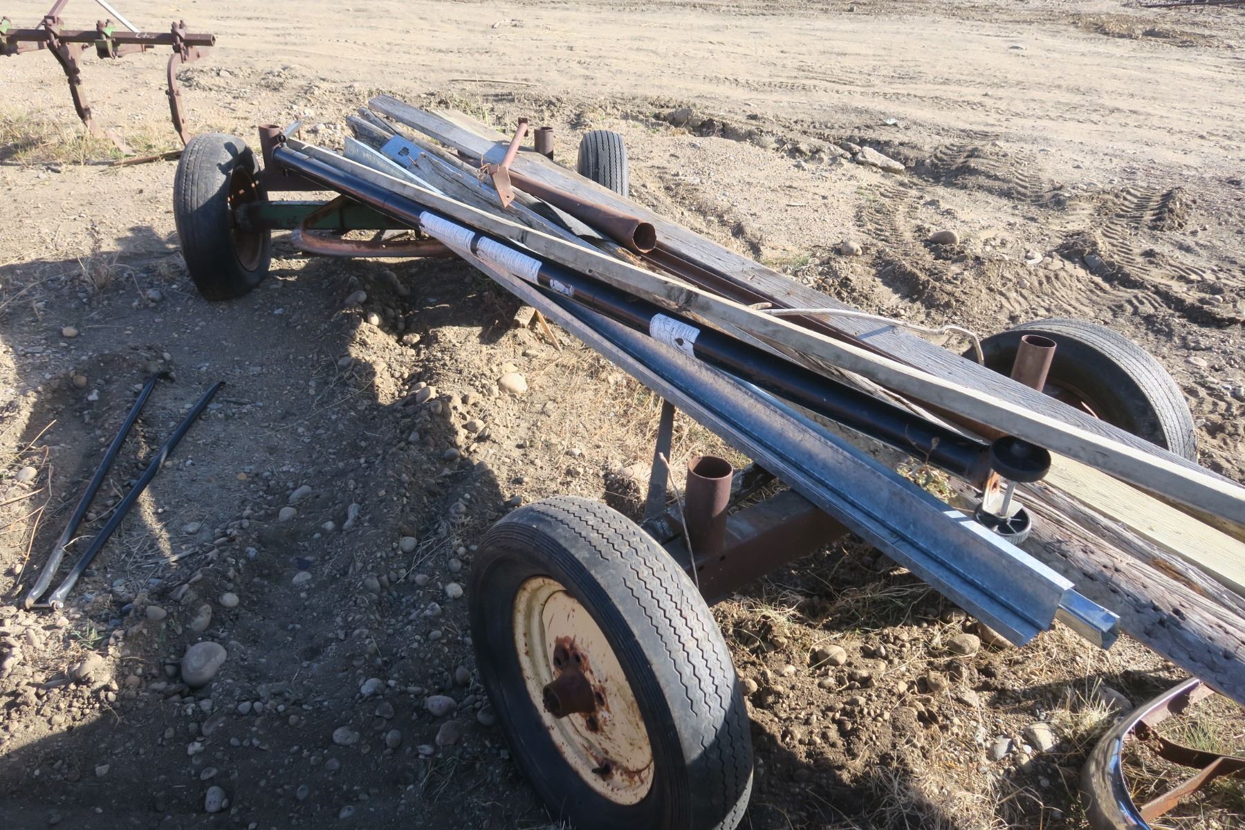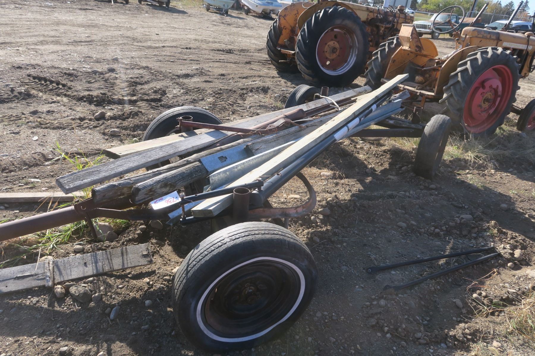 Double axle hay trailer with misc wood items on it