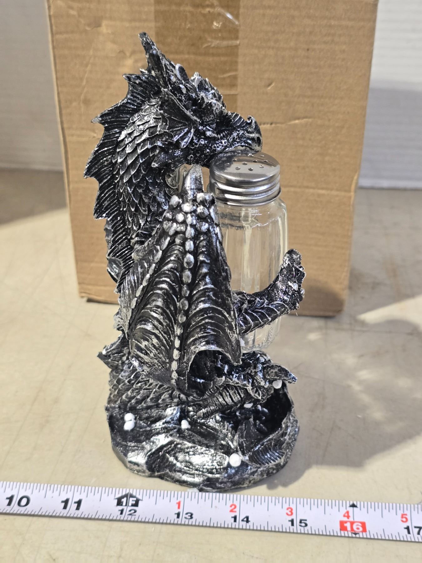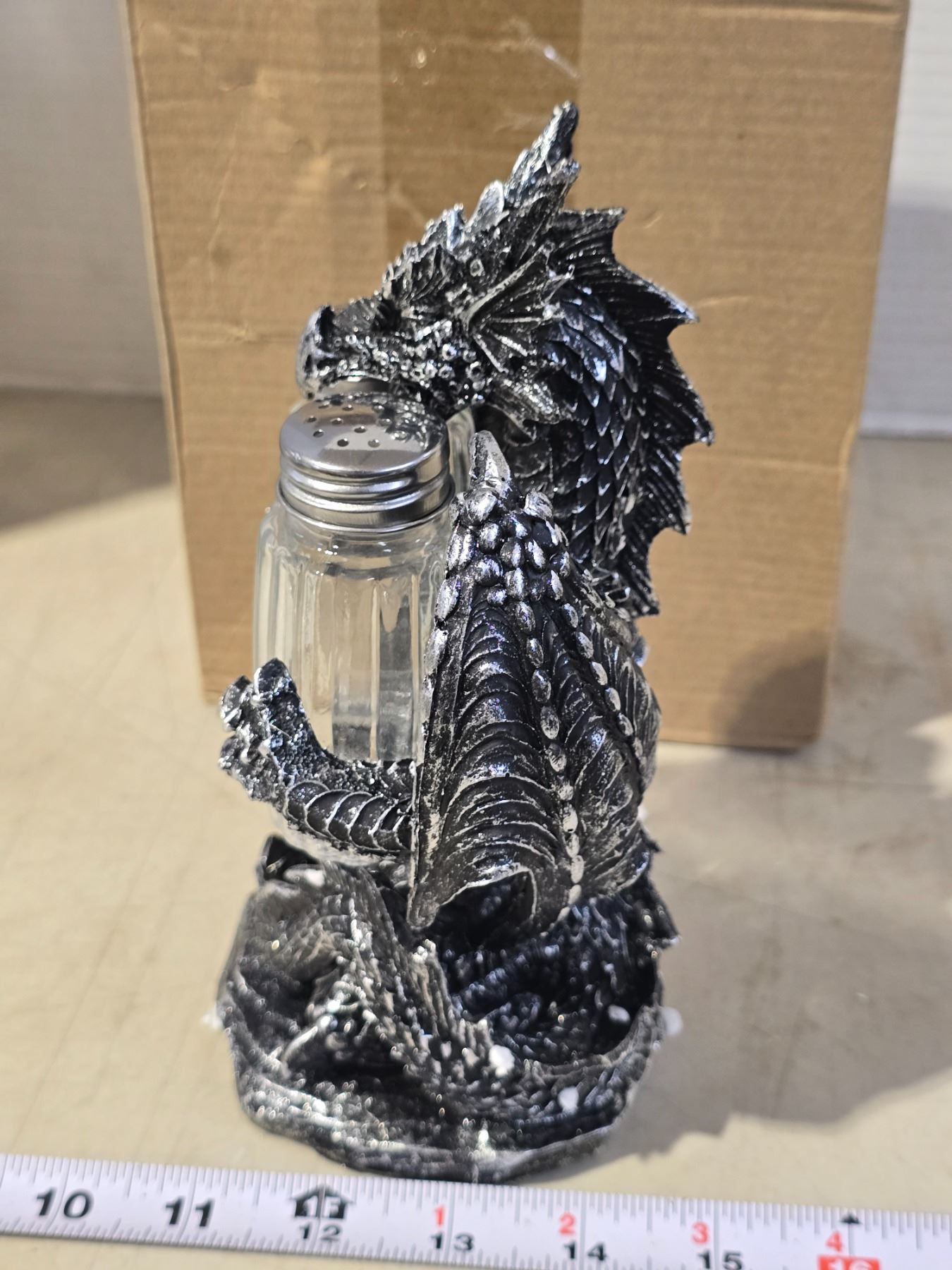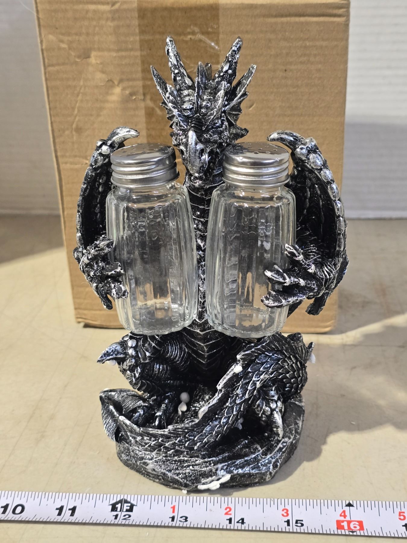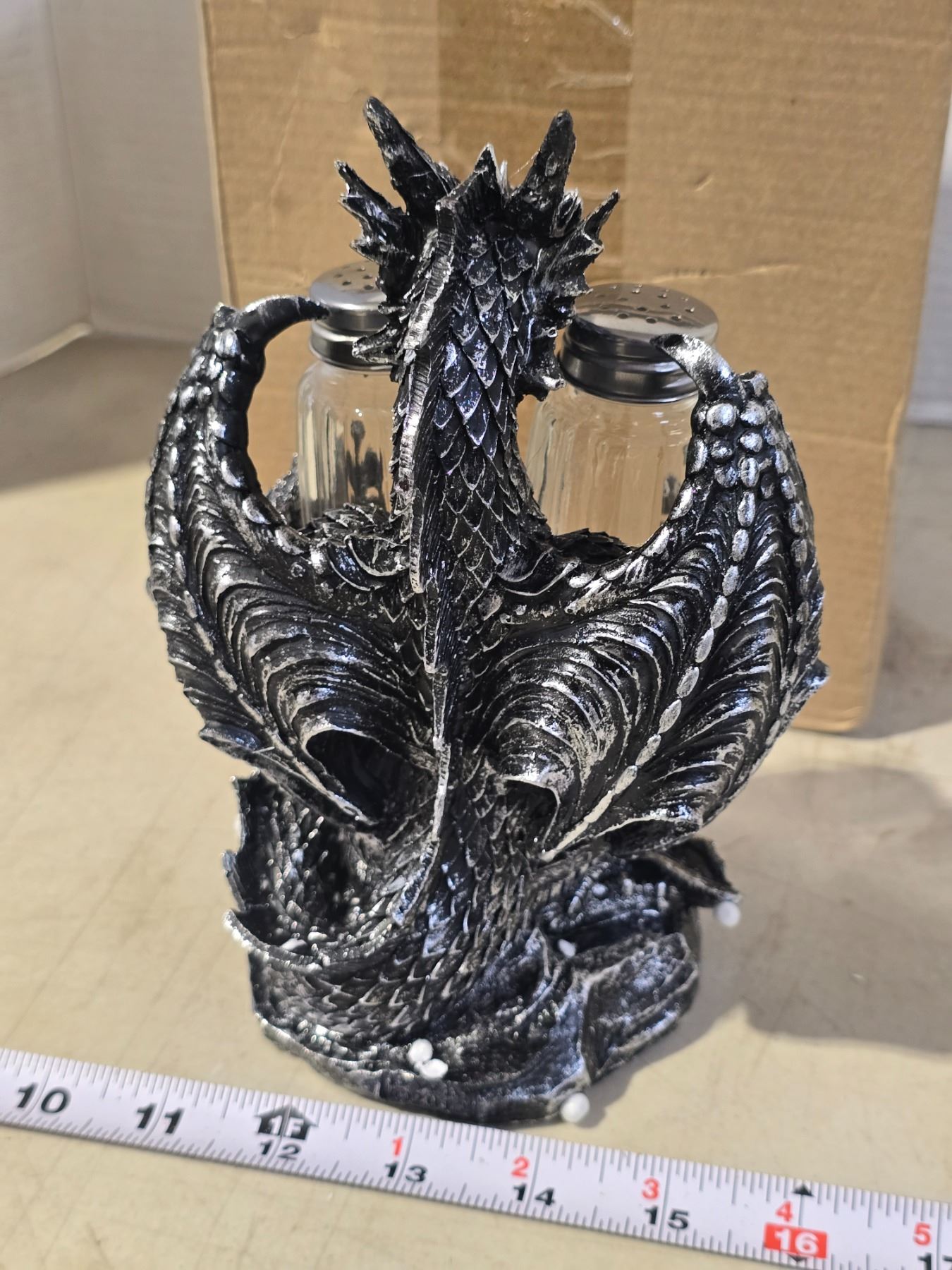 Dragon salt n pepper holder figurine, c/w salt n pepper shakers - new in box