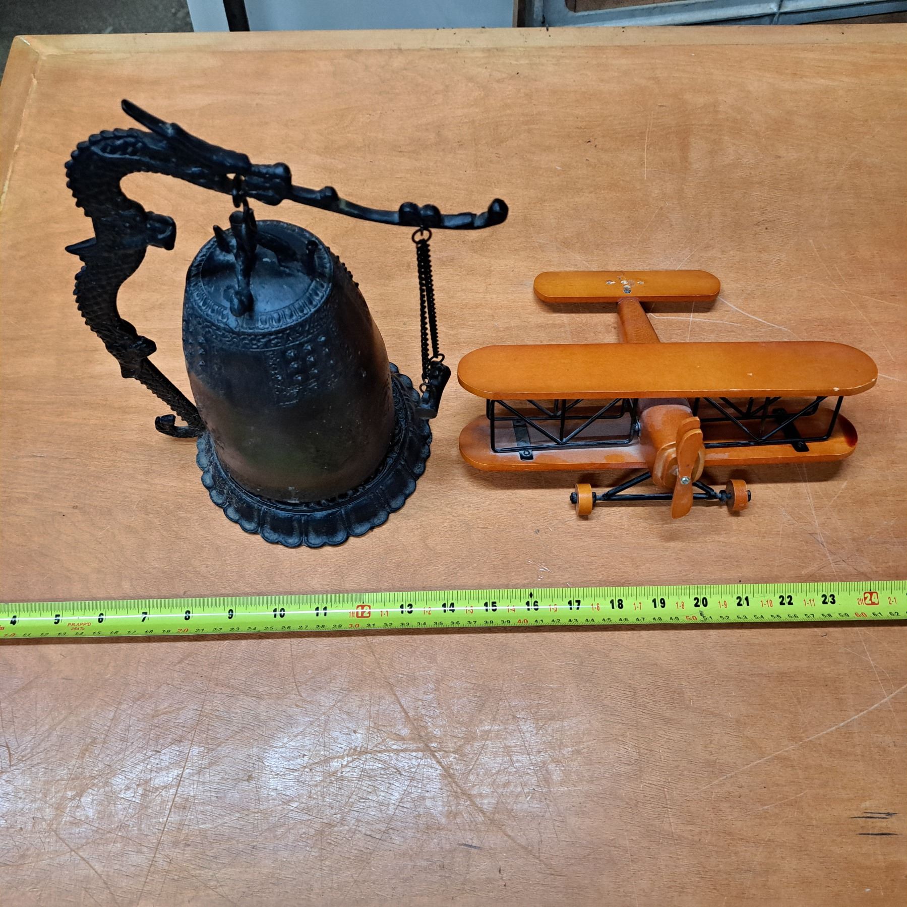 Dragon temple bell- 10"H and small wood biplane model- 8"L