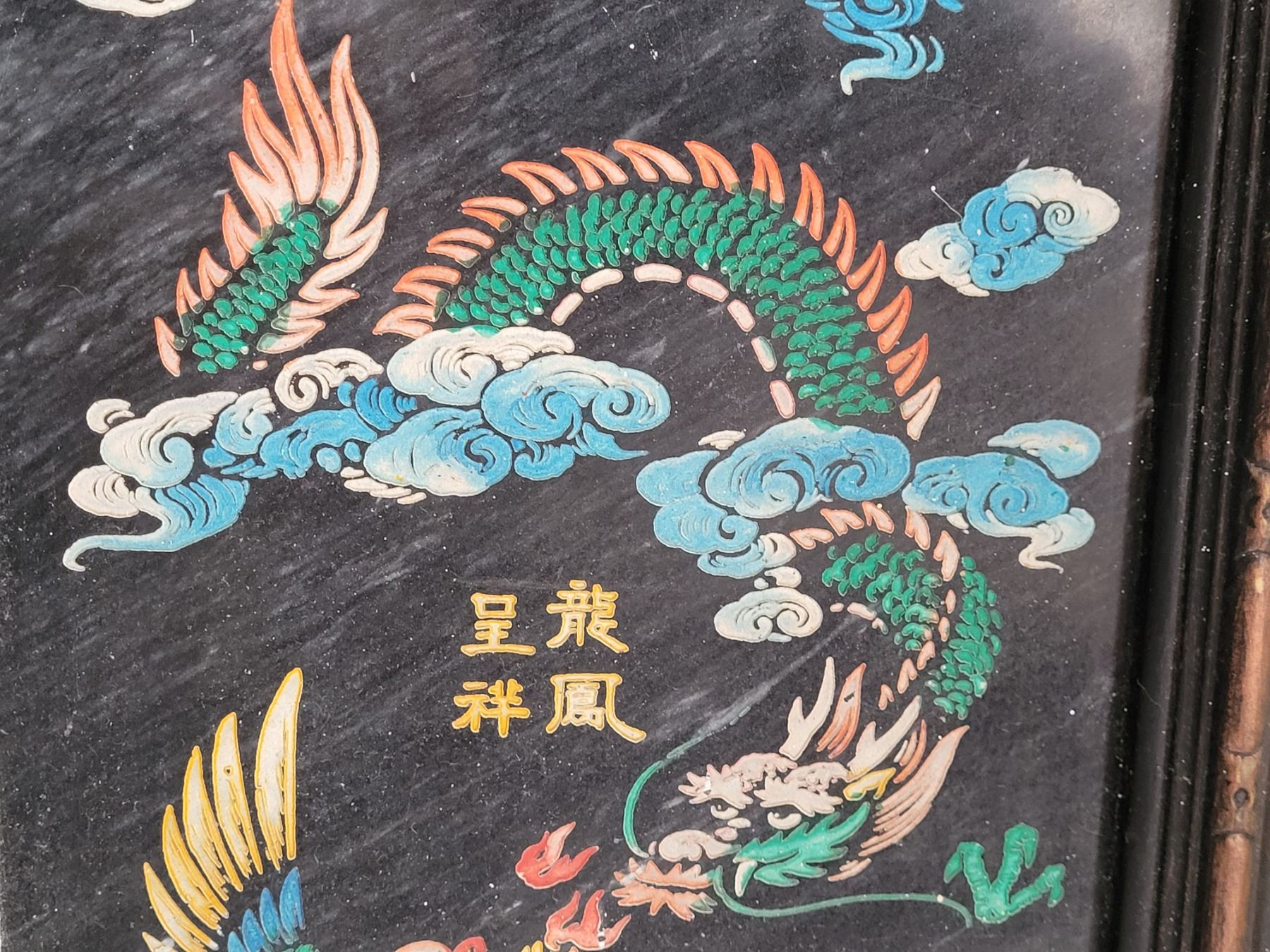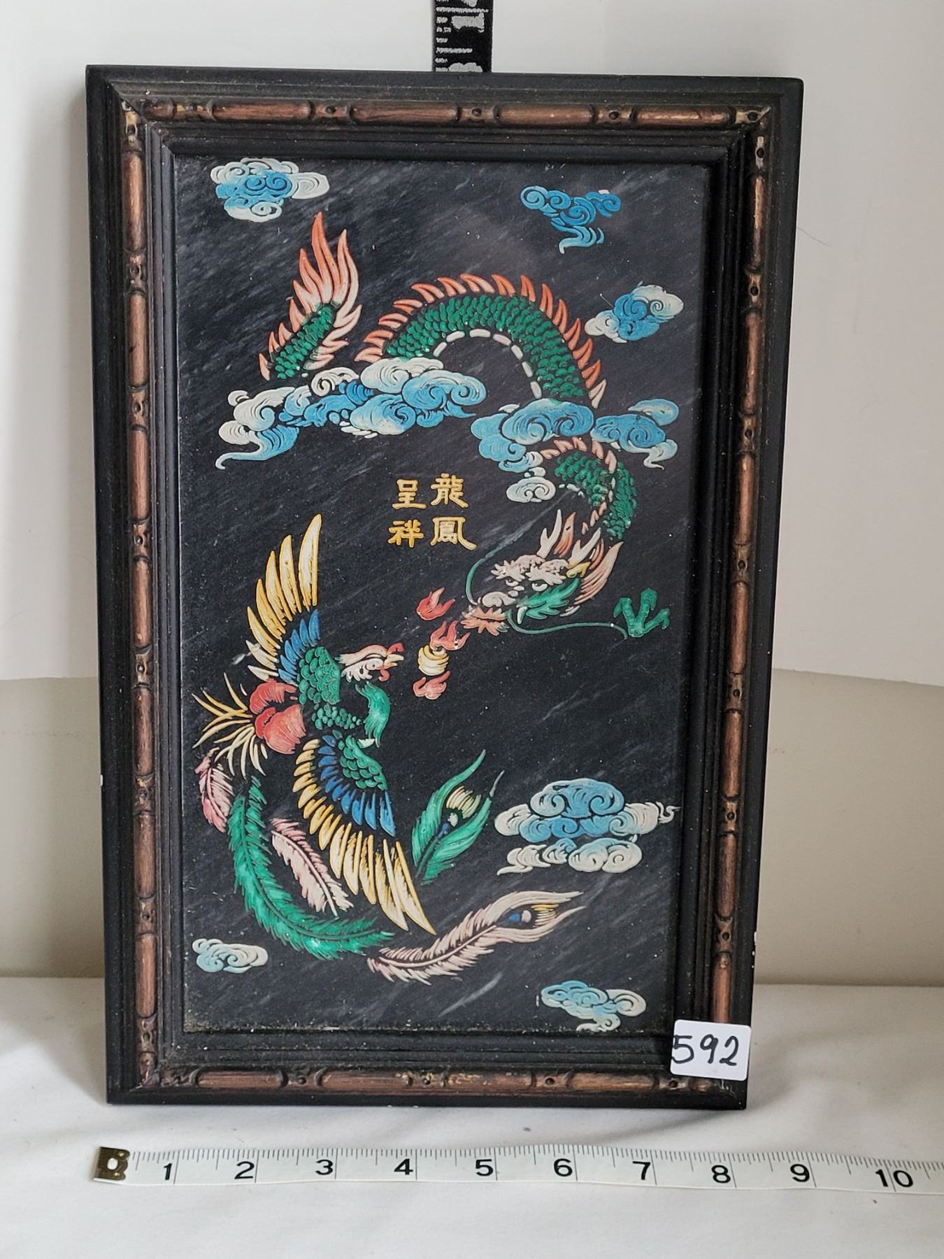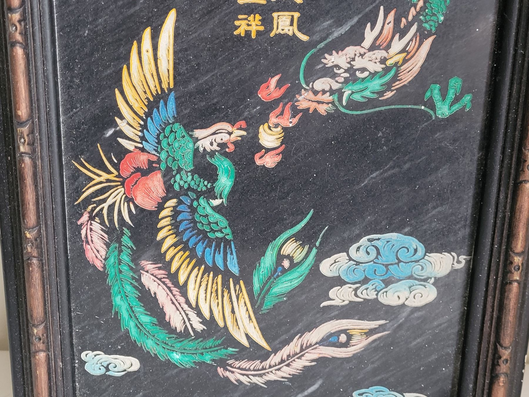 Dragon(yang) Phoenix(Yin) etched in granite & framed. Symbol of marital happiness, everlasting love.