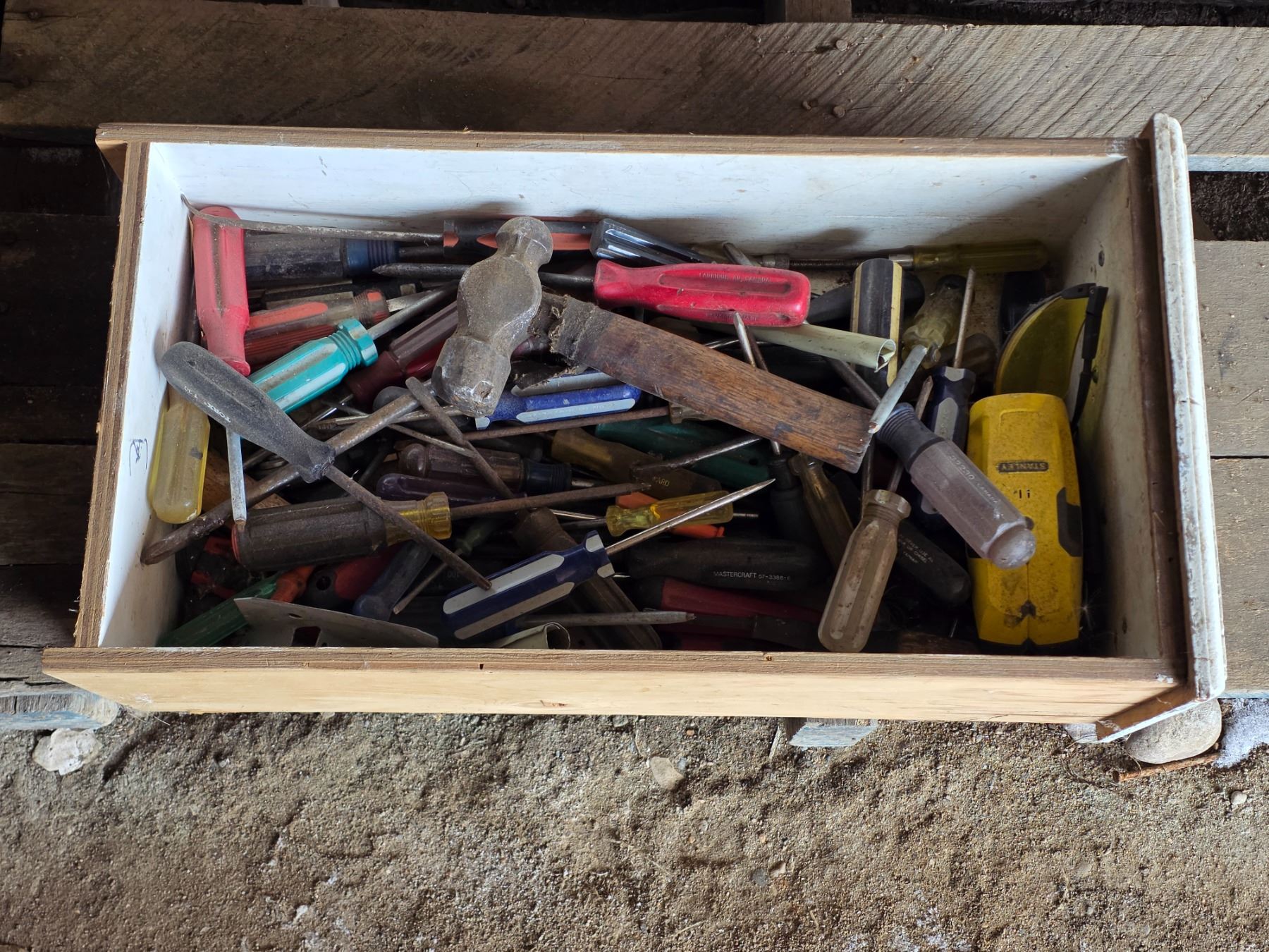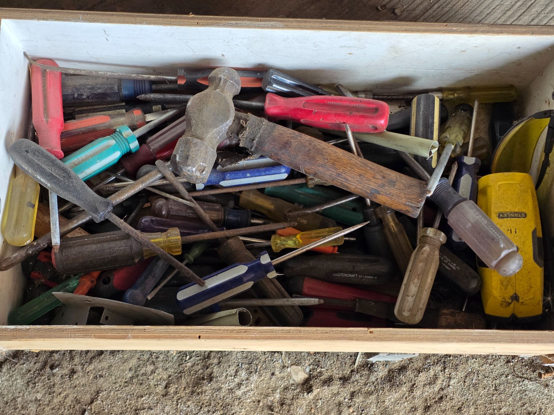 Drawer full of tools, screw drivers and hammer