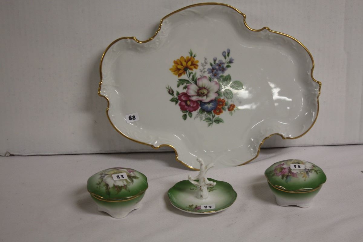 A dresser set with two dishes, a ring holder, and a Limoge tray