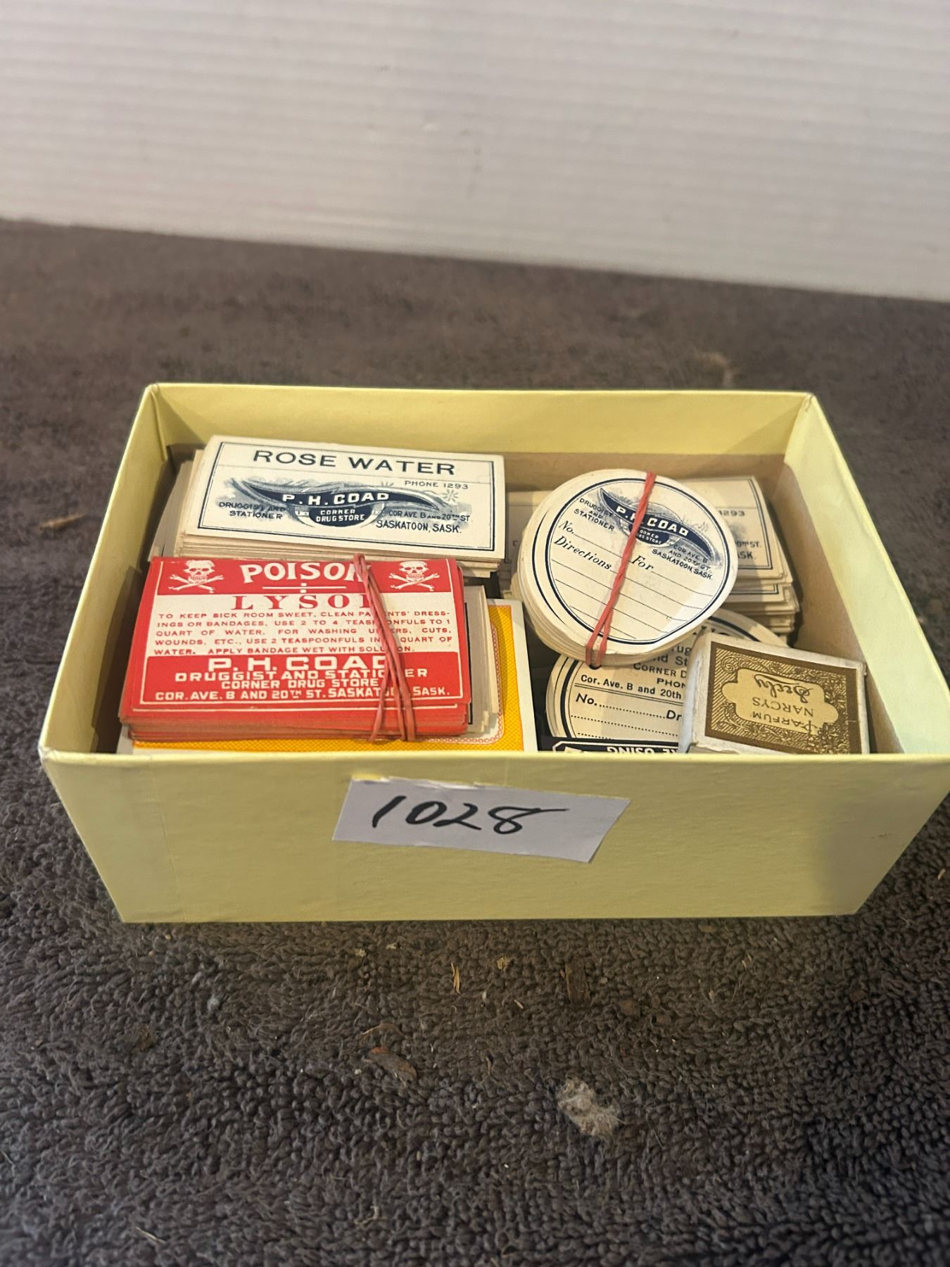 Drug store labels-coads drug store, poison, rosewater, salt petre etc-"NOS"