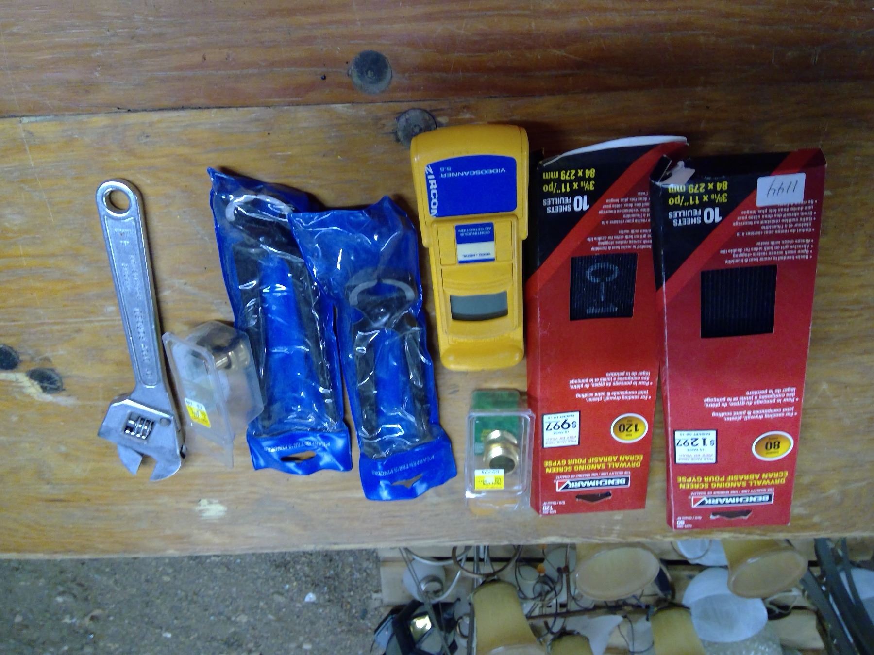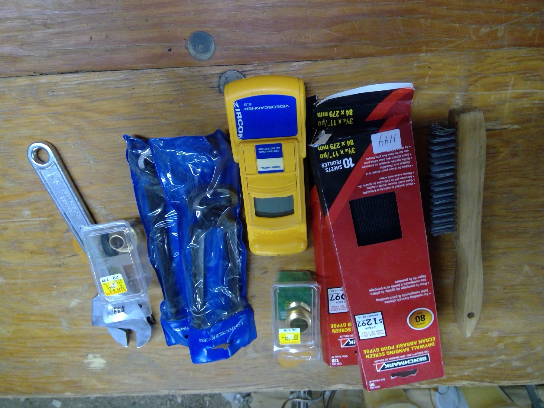 Drywall sanding screen, 2 carpenter pincers, crescent wrench, wire brush, and Zircon Videoscanner