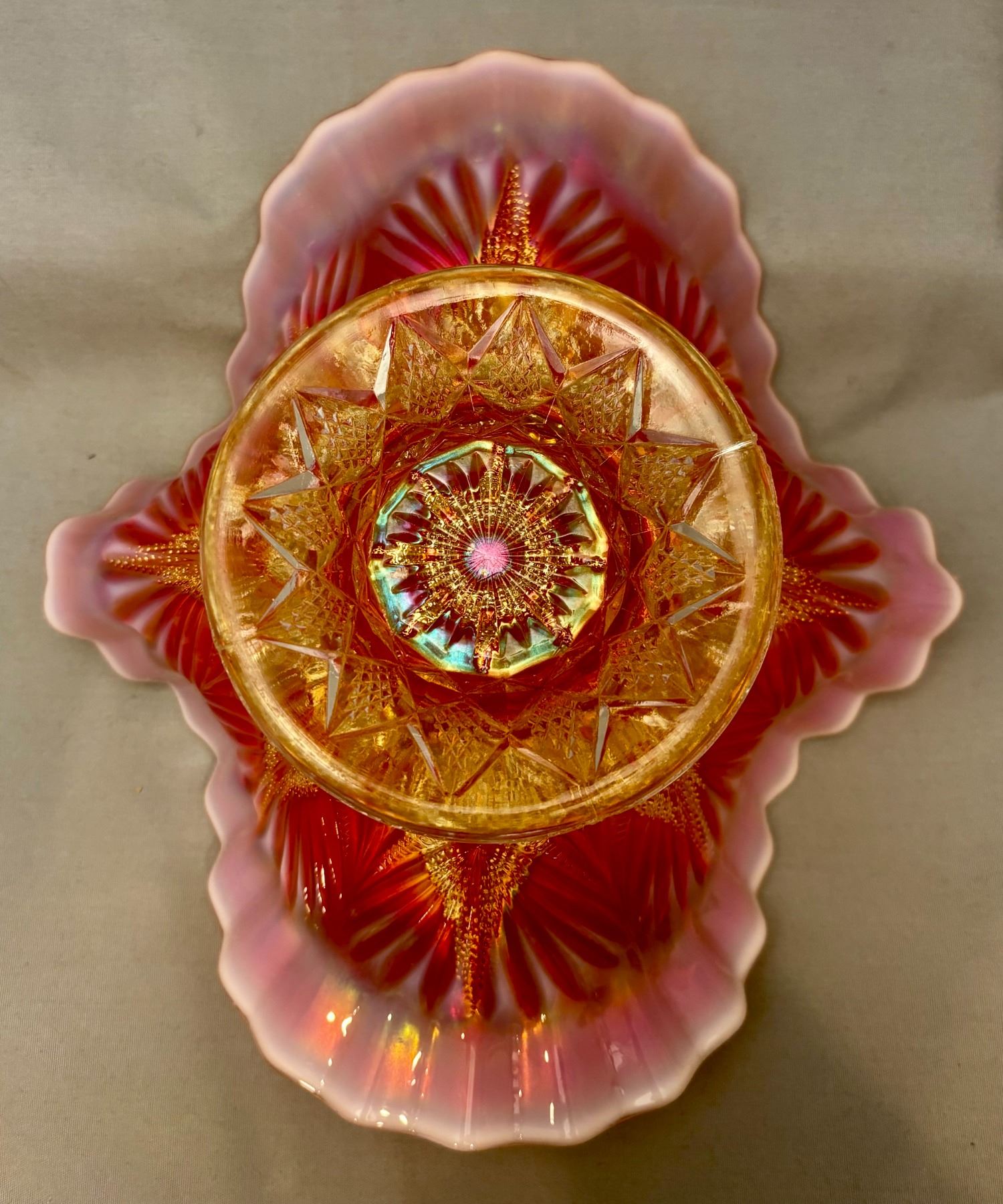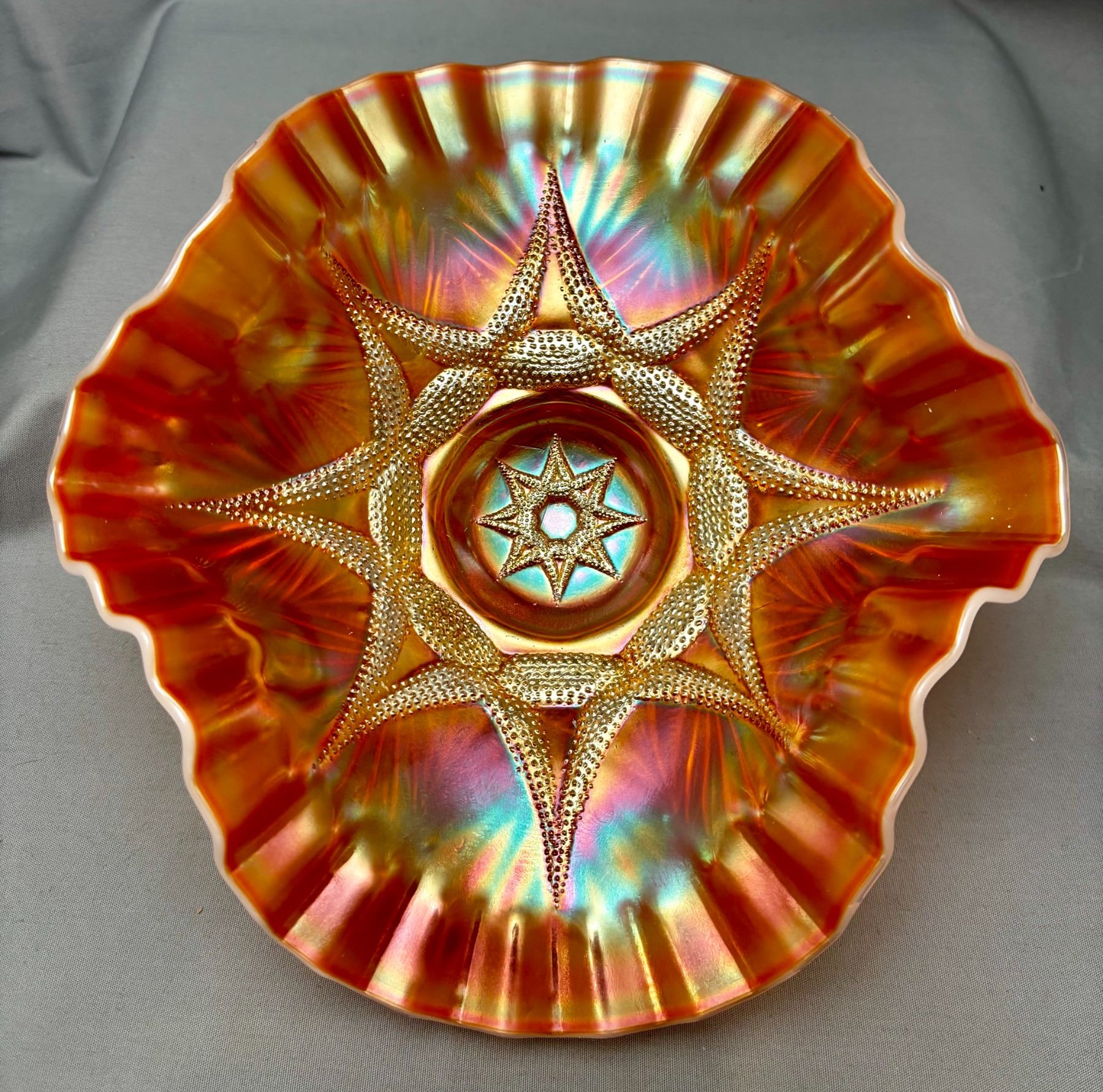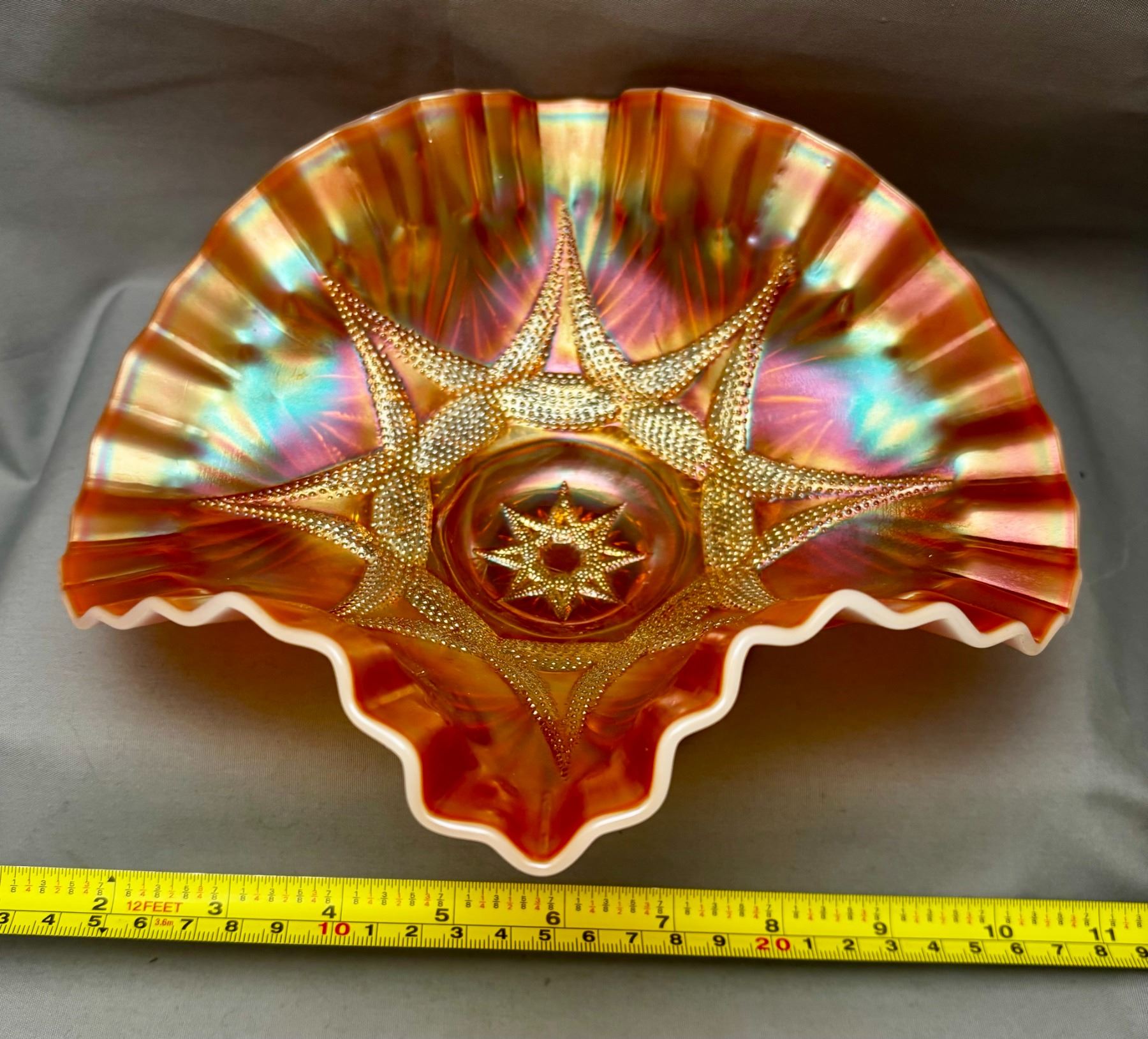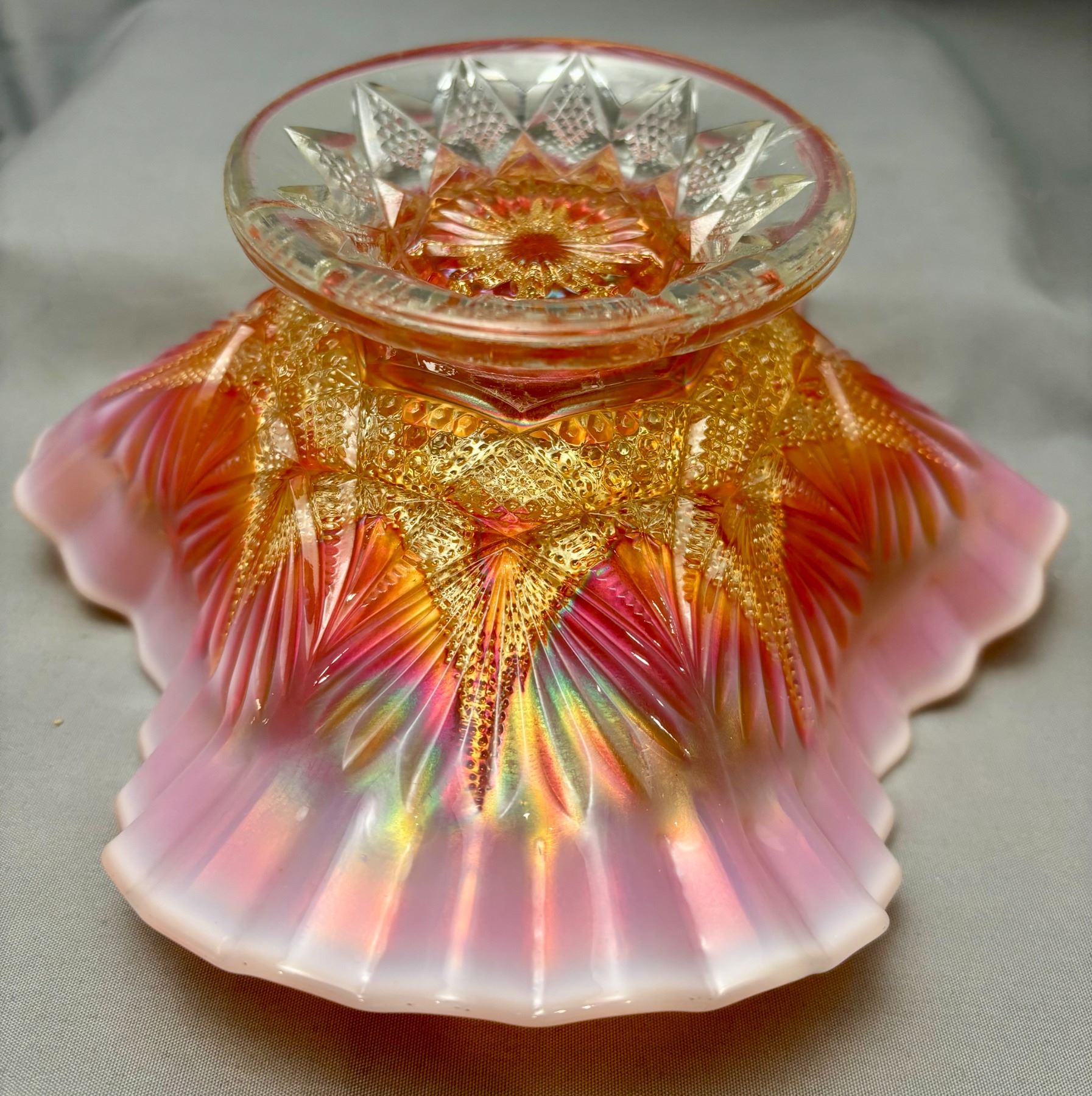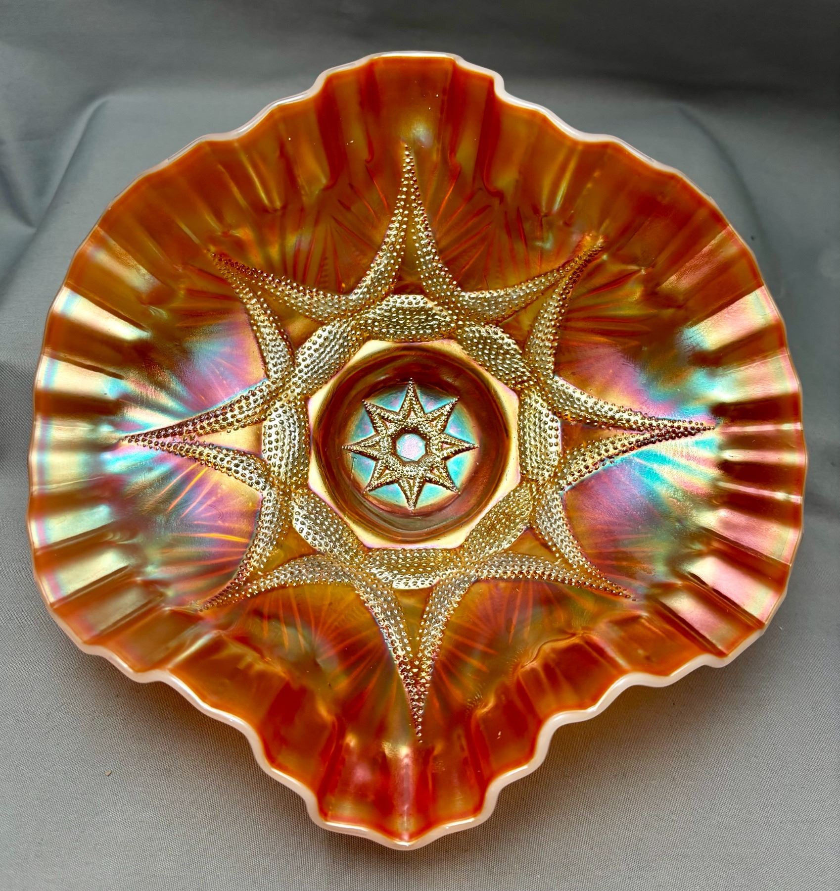 Dugan Peach Opal Carnival Glass "Ski Star" Crimped Edge Banana Boat (Circa 1910)
