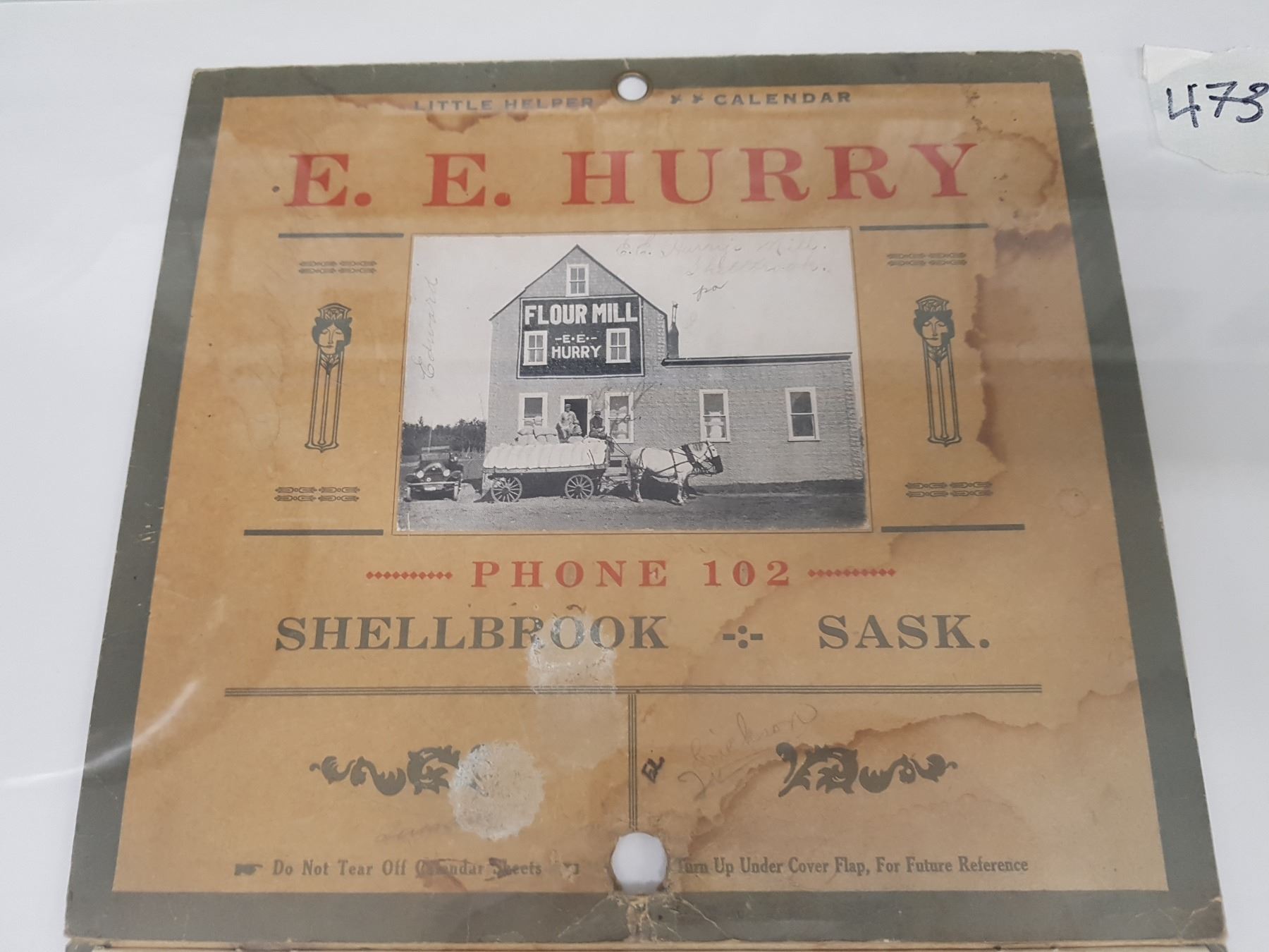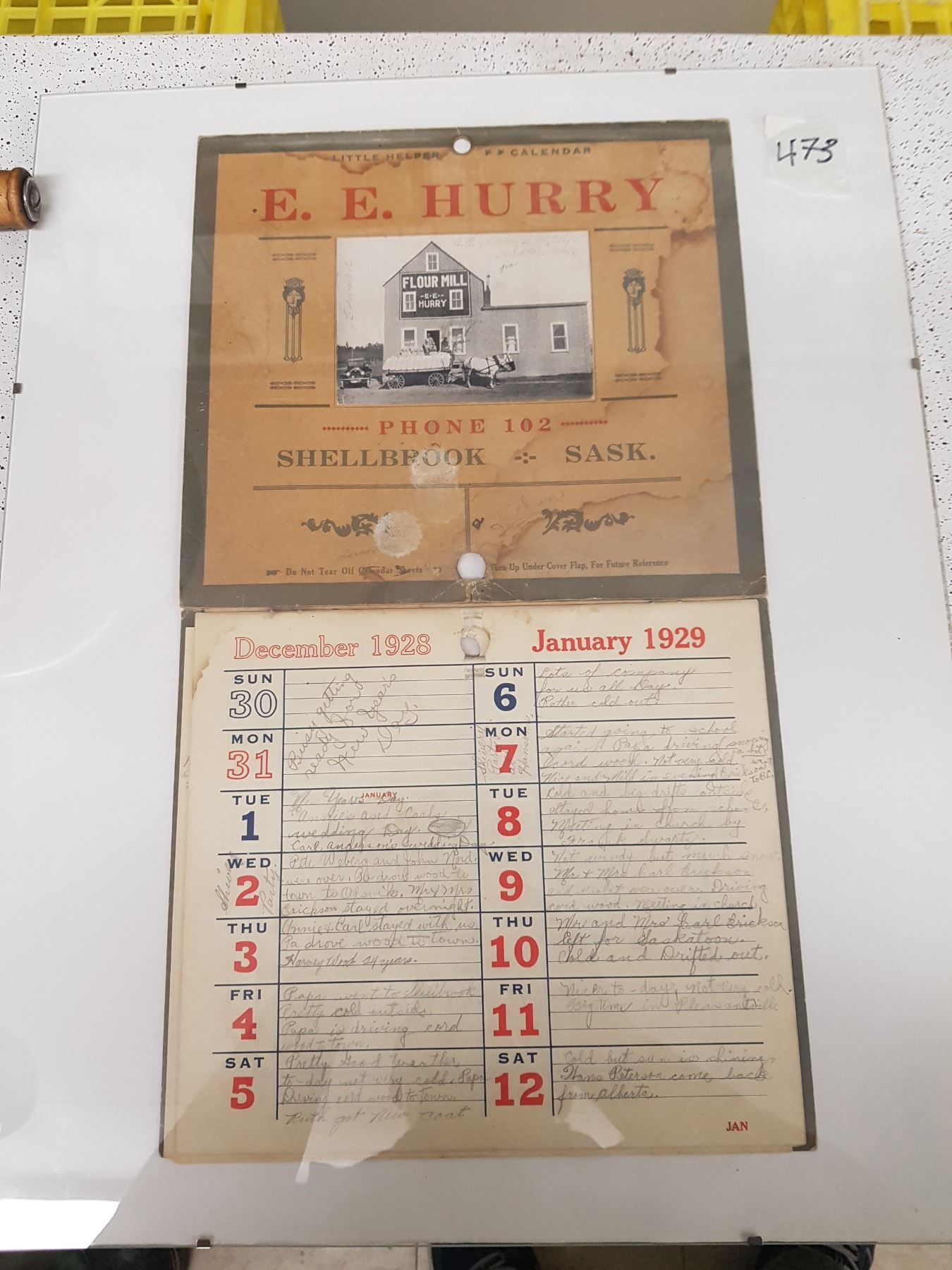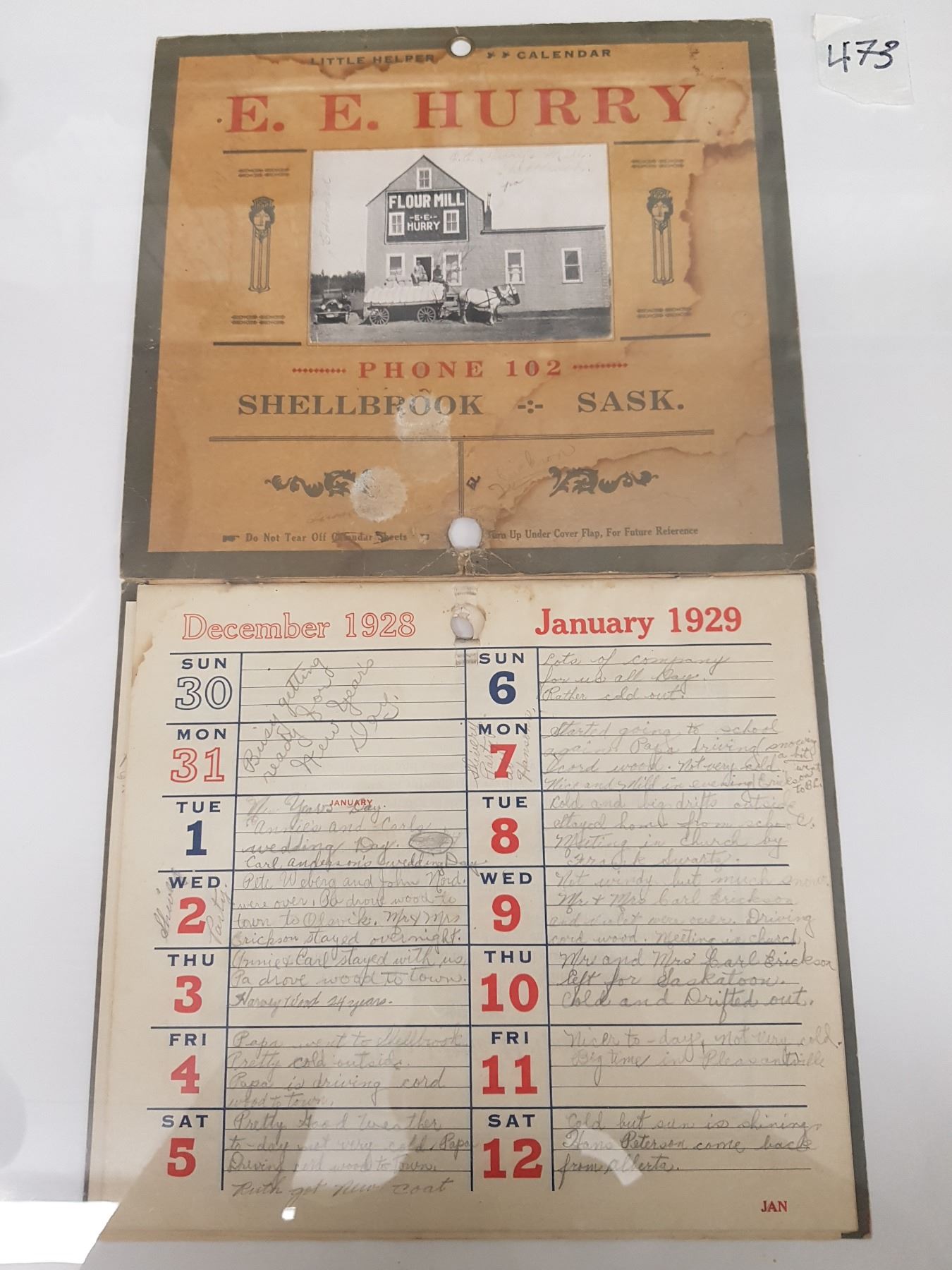E.E. HURRY SHELLBROOK, SK 1928/29 CALENDAR 17 X 10"