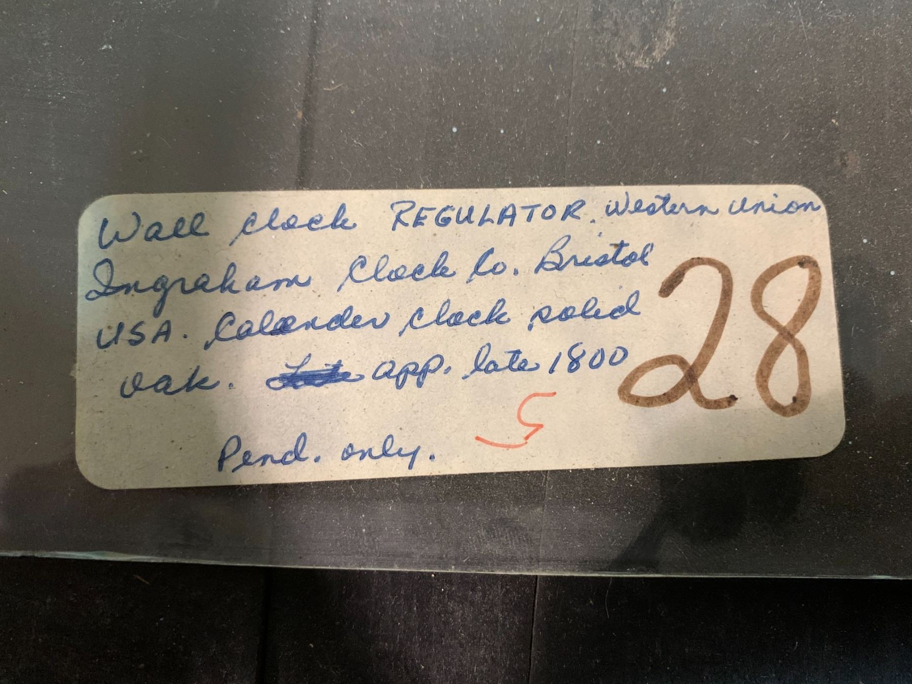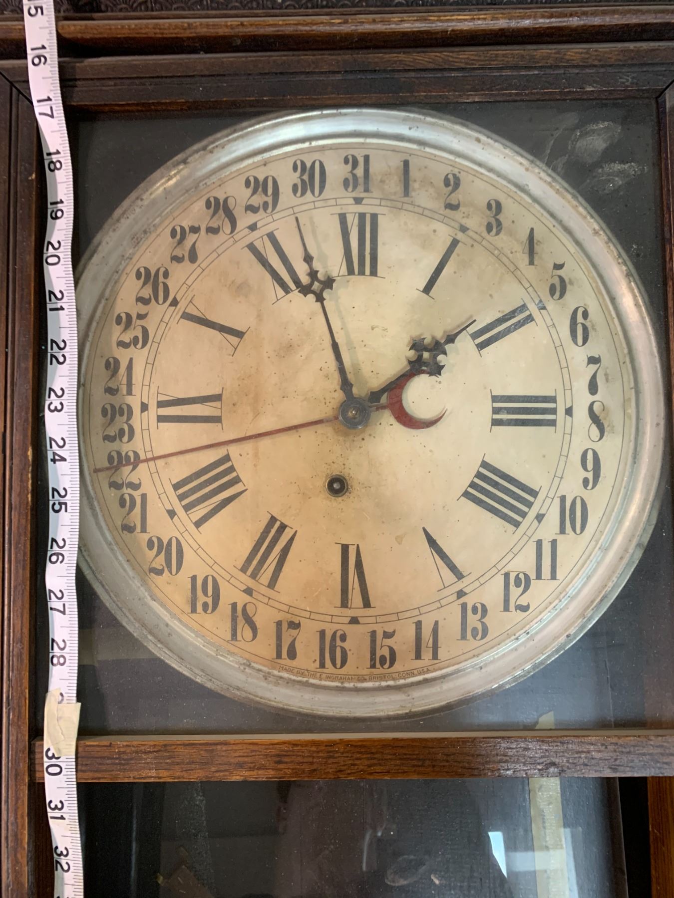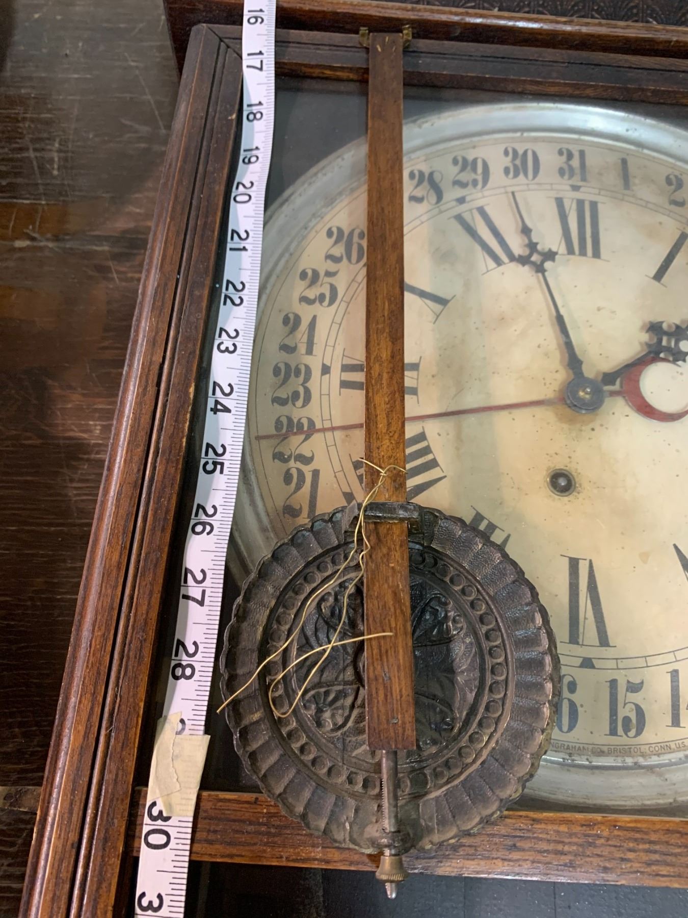E. INGRAHAM CO. ANTIQUE WOODEN CLOCK - LATE 1800'S W/ PENDULUM