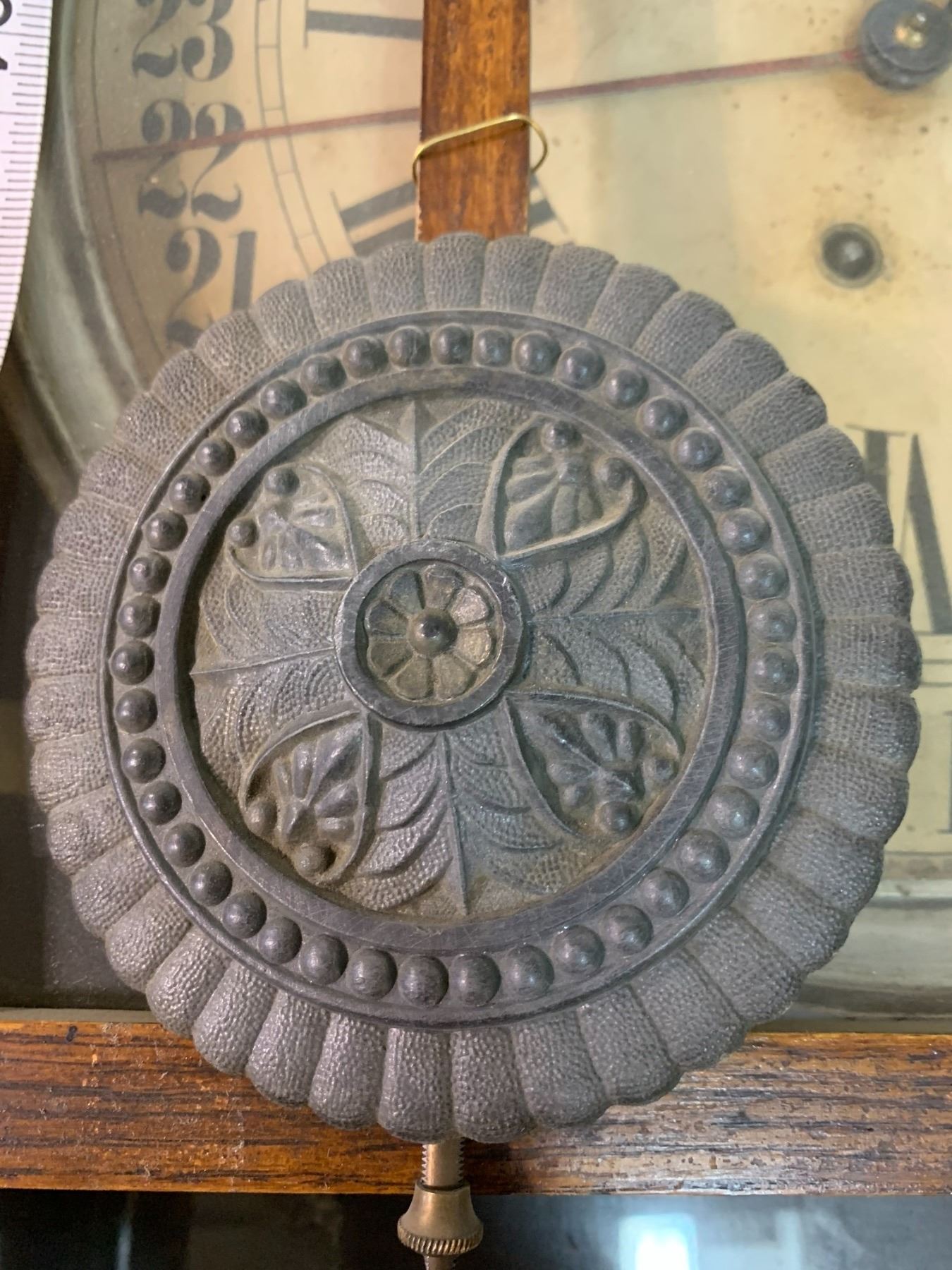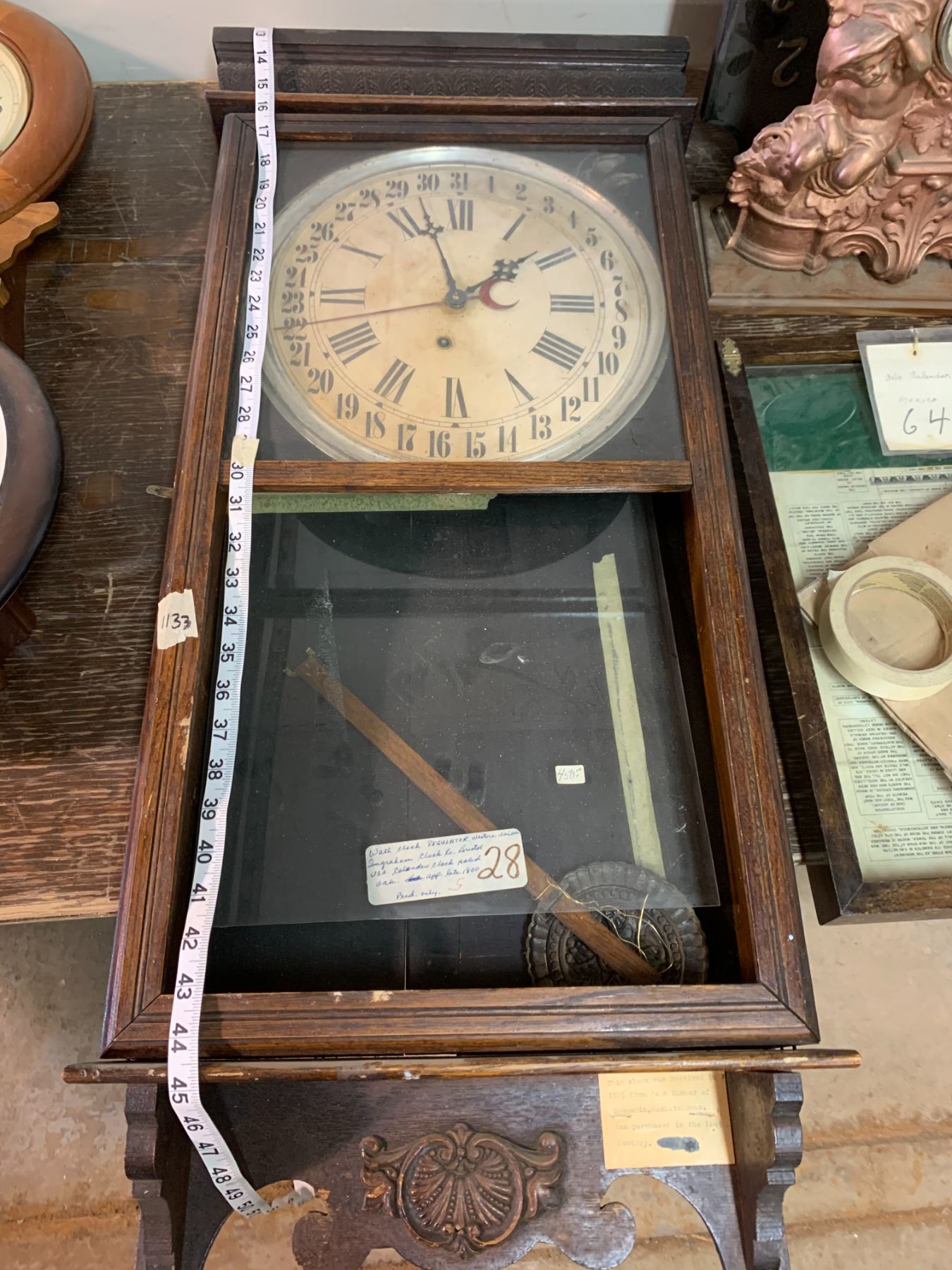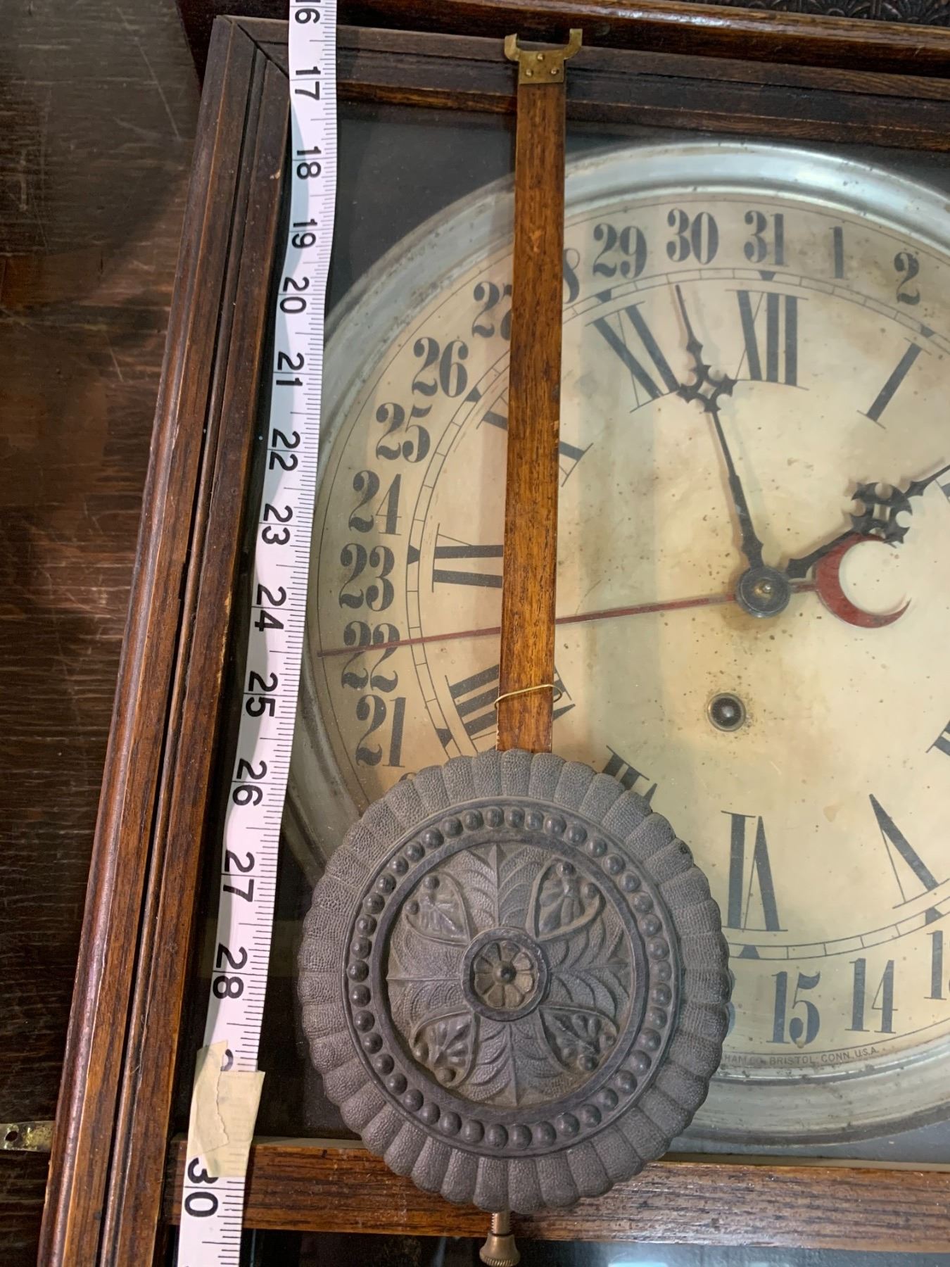 E. INGRAHAM CO. ANTIQUE WOODEN CLOCK - LATE 1800'S W/ PENDULUM