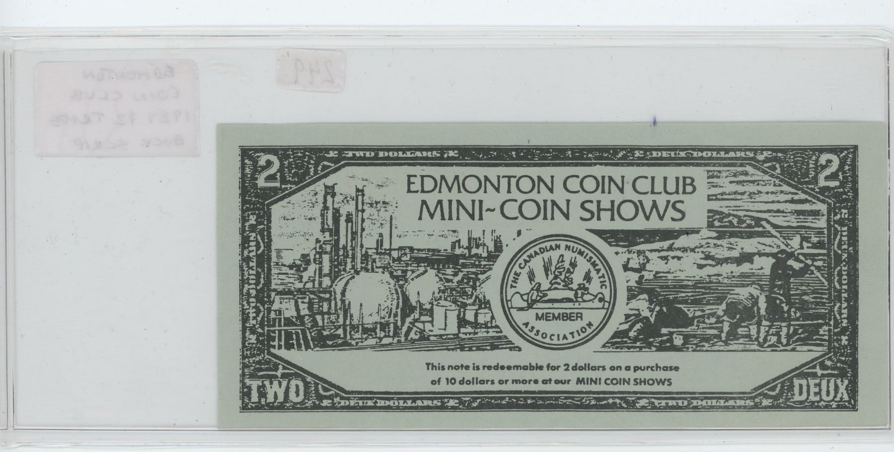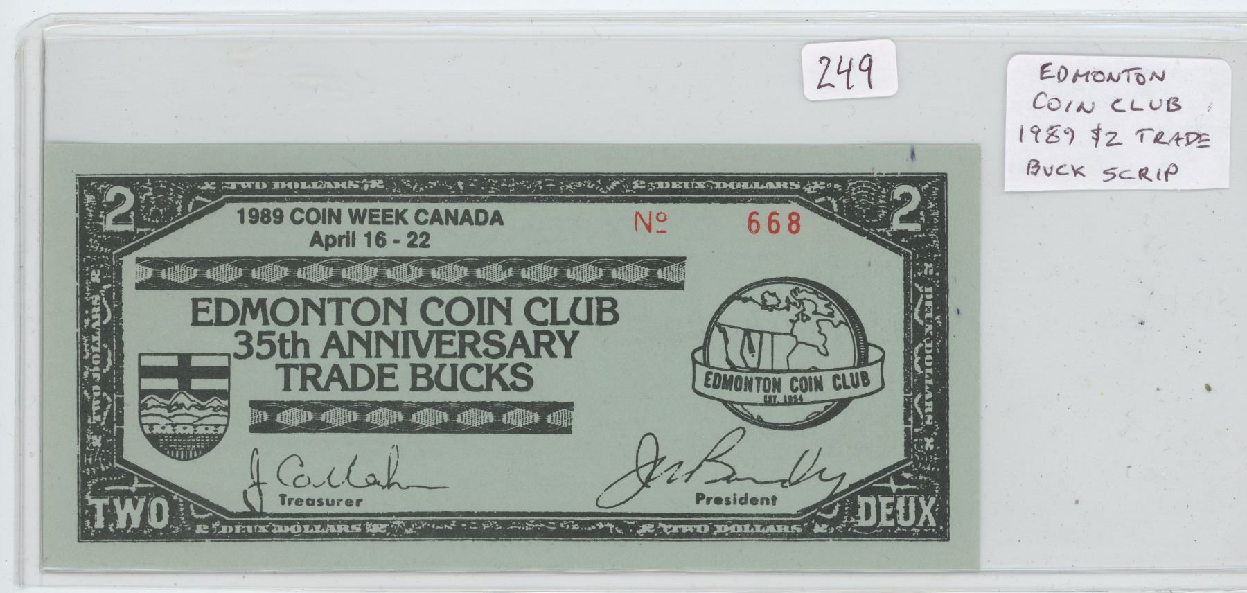 EDMONTON COIN CLUB 35TH ANNIVERSARY 1989 $2 TRADE BUCKS. SERIAL NUMBER 668. UNC.