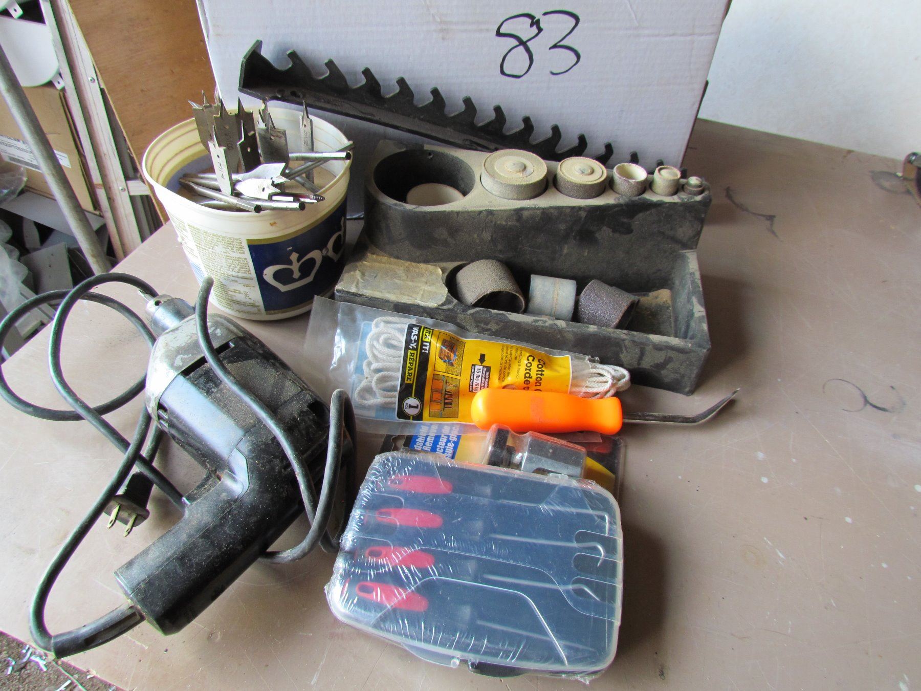 ELECTRIC DRILL, SANDING WHEELS, MISC TOOLS AND DRILL BITS