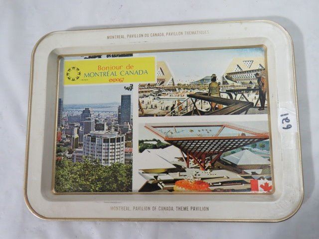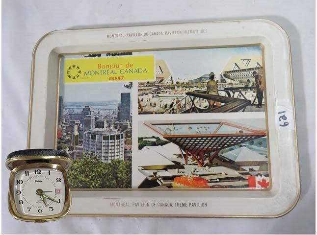 EXPO 67 METAL TRAY & SABRE TRAVEL ALARM (W/AUTO DATE IN CASE)