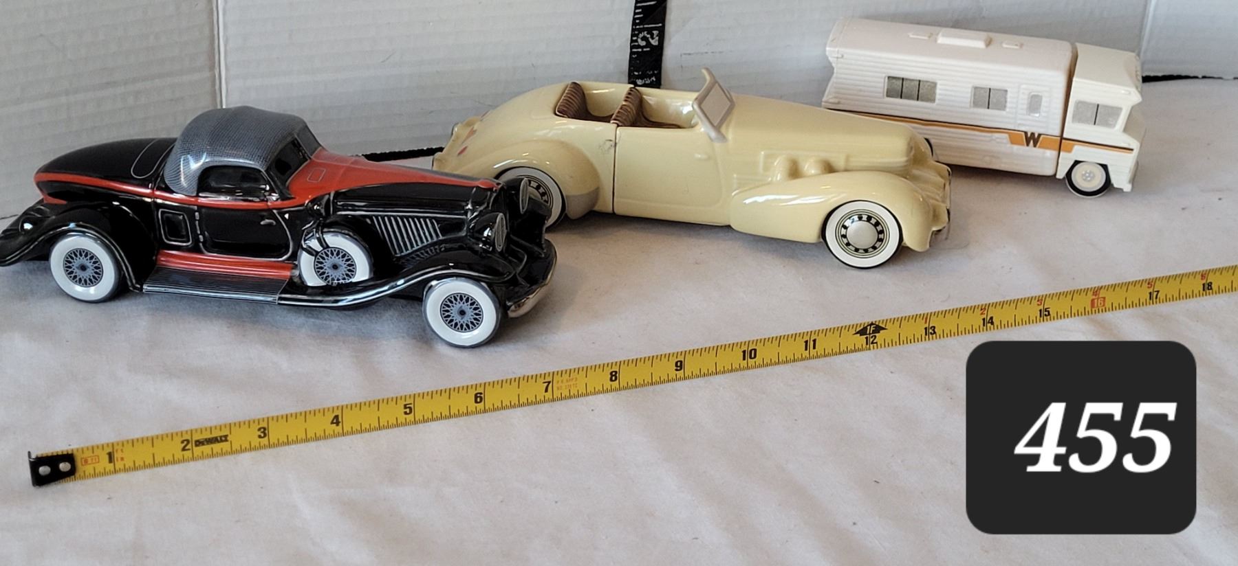 Early 1980's collectable Avon cars. 1932 Auburn, 1937 Cord & Winnebago. Handcrafted in Brazil
