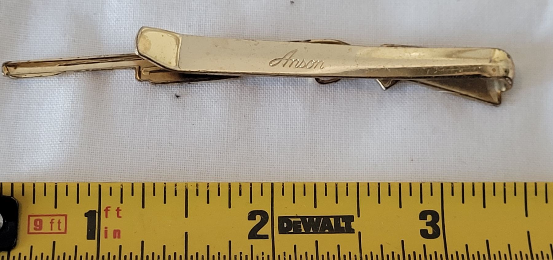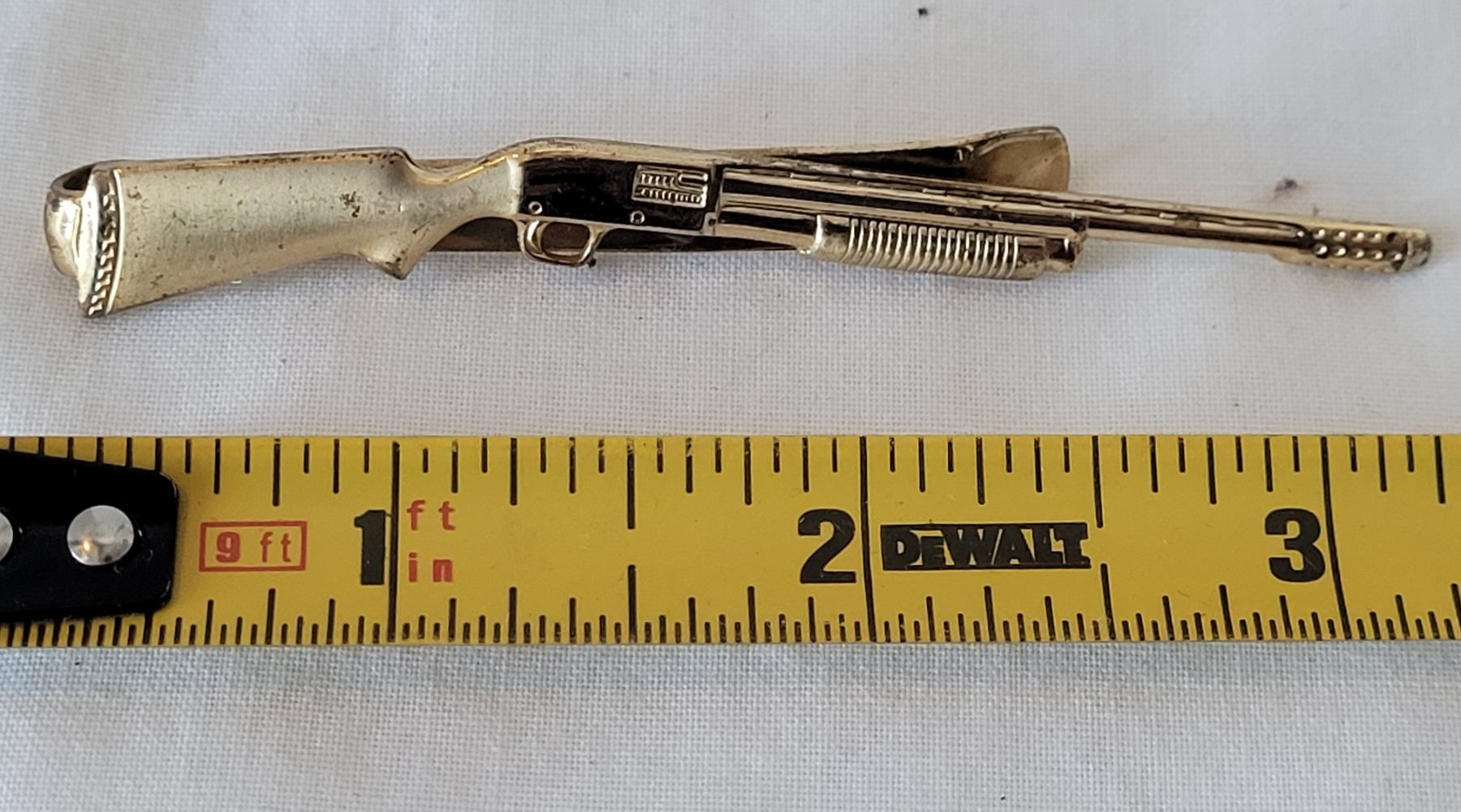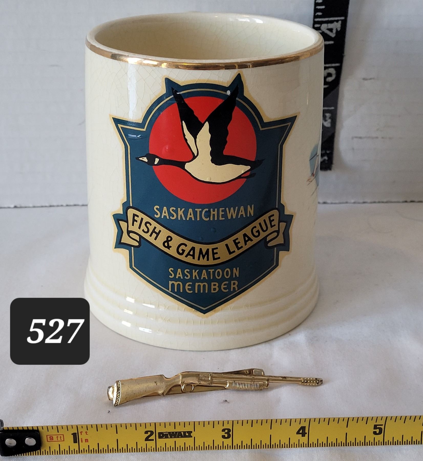 Early century Anson pump action shotgun tie clip. Sask. Vtg. Lord Nelson Ware Fish & Games mug.