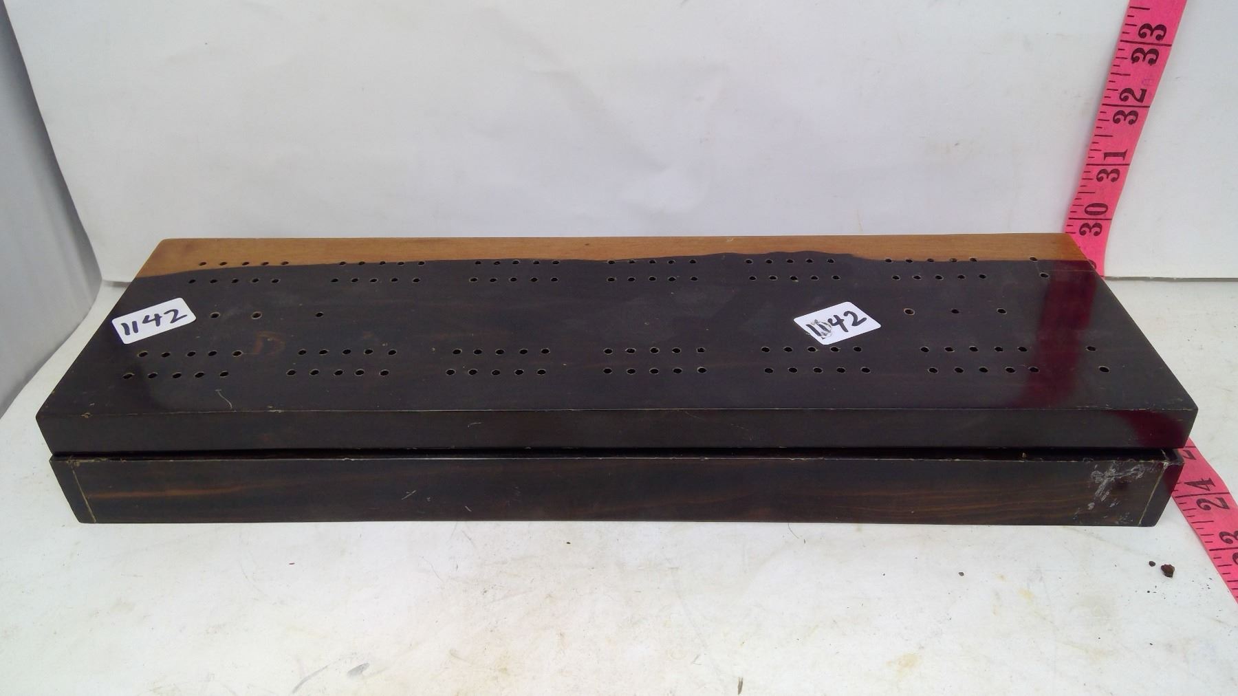 Ebony cribbage board that contains dominos. Weight: 5". Length: 14 1/2". Width: 4 1/2". Thickness: 2". Heavy, dense, polishes, exotic, lustrous ebony wood. From Africa.