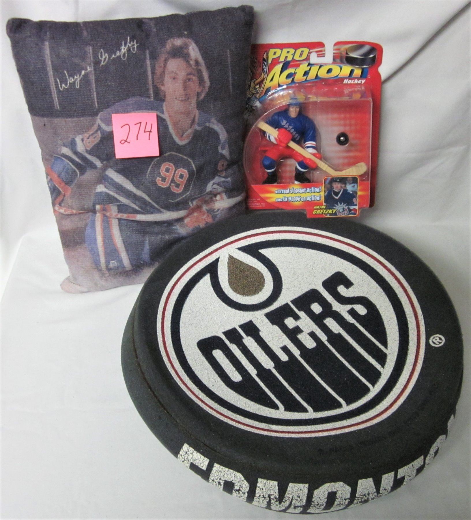 Edmonton Oilers foam 'puck head', Wayne Gretzky pillow, new 1998 pro action starting lineup NYR Wayne Gretzky figurine