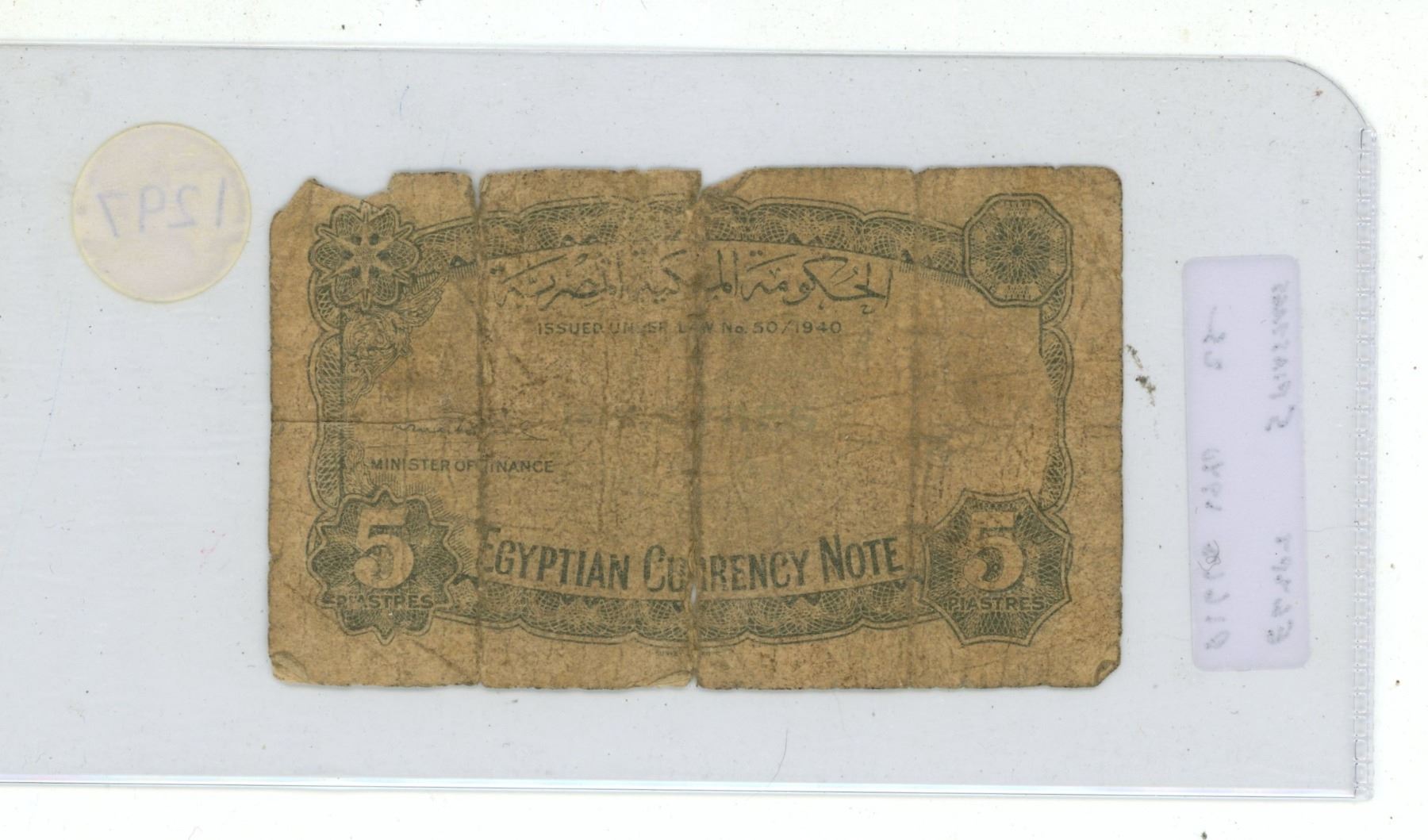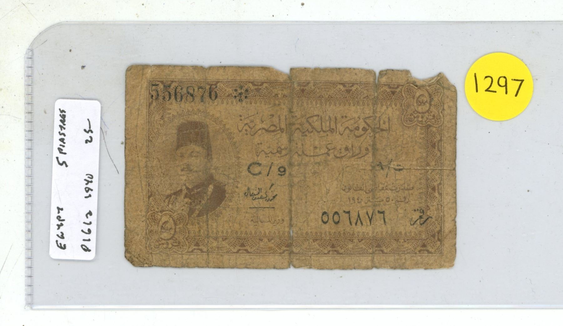 Egypt. 1940 5 Piastres. King Farouk (famous coin collector). VG.