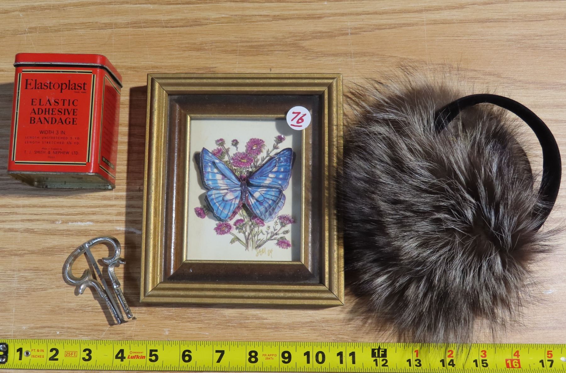 Elasto Plast Bandage tin, Paper Dimensional Butterfly Picture, Jewish Harp-made in England, Rabbit Ear Muffs