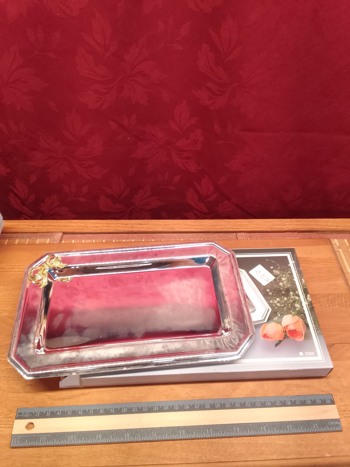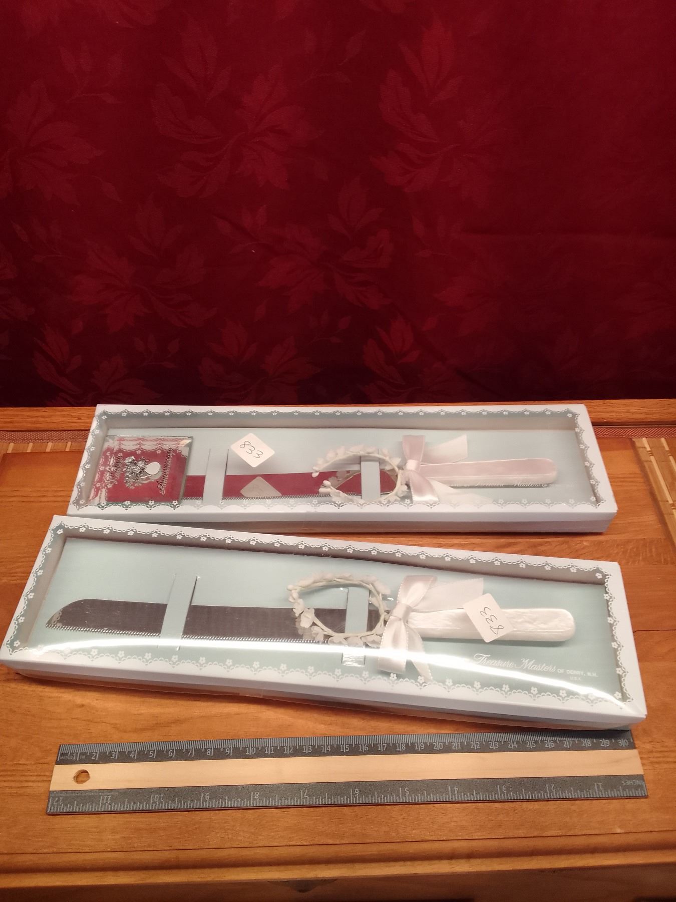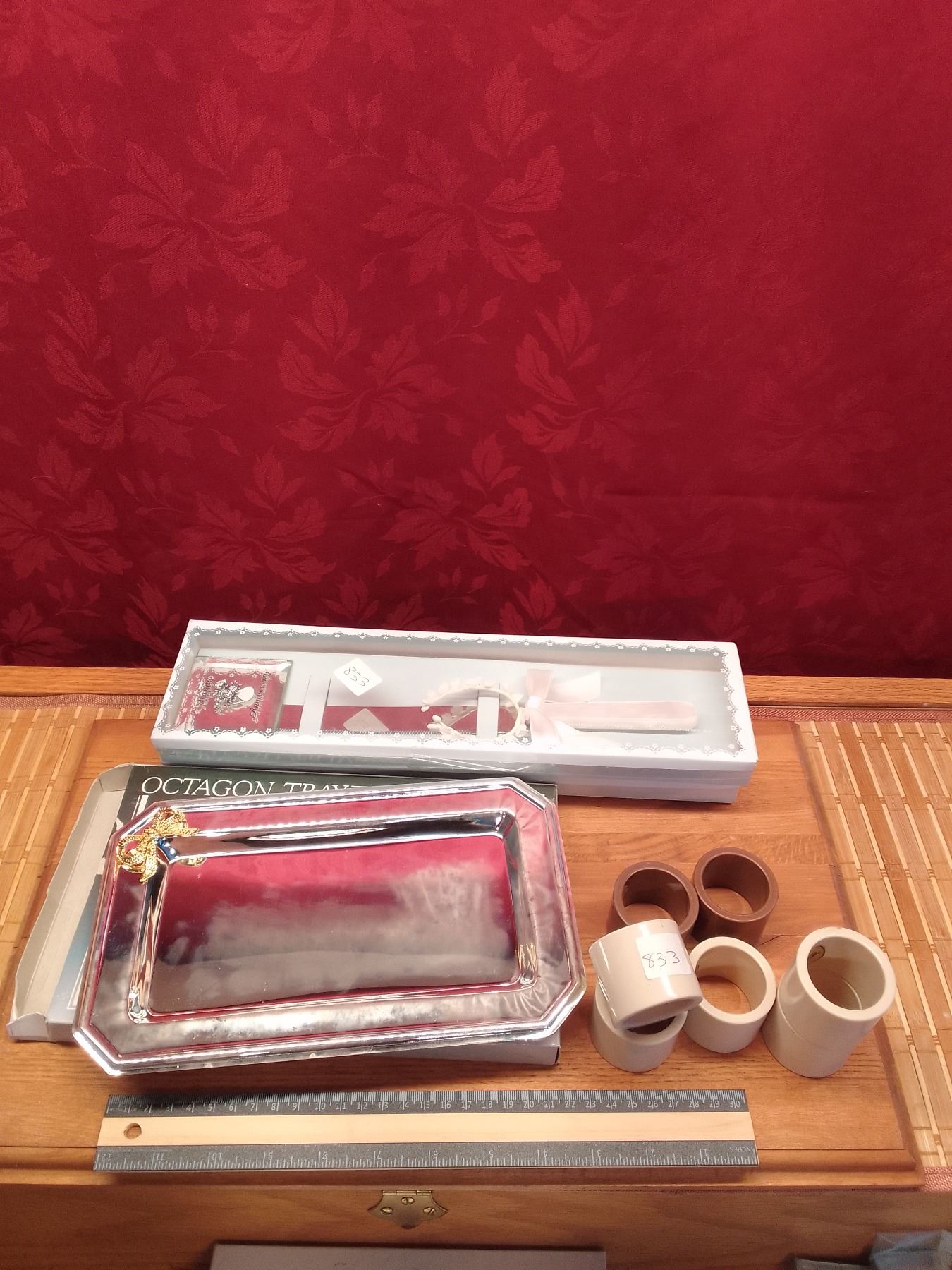 Elegant Silver Knife Set, Server & Napkin Rings Collection- Two fine knives in presentation box, a silver-colored octagonal tray/server, and assorted napkin rings (silver and neutral tones). Ideal for table setting or gifting.