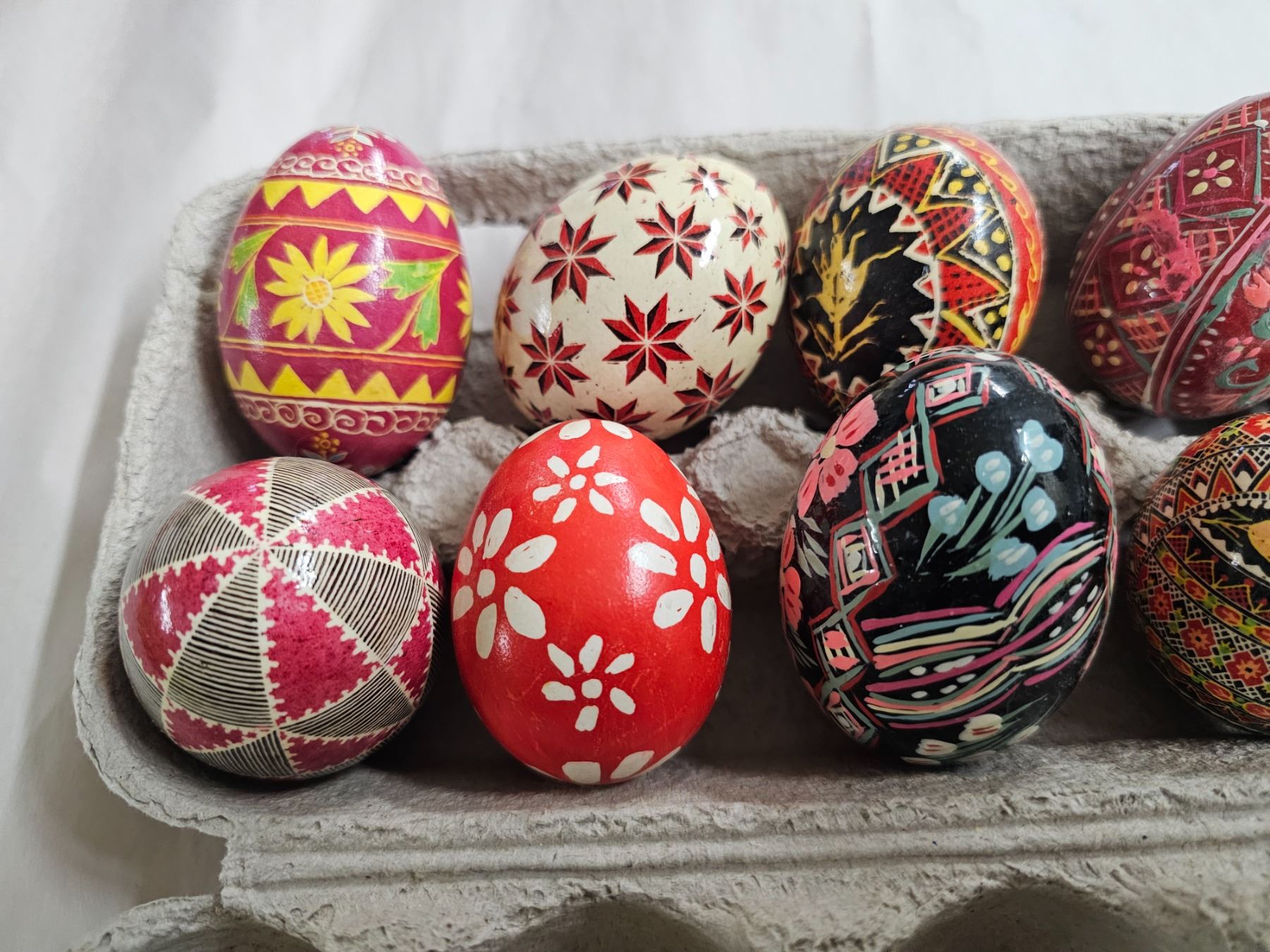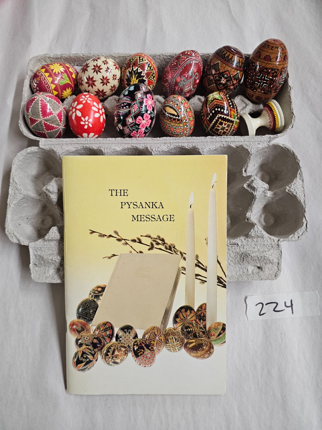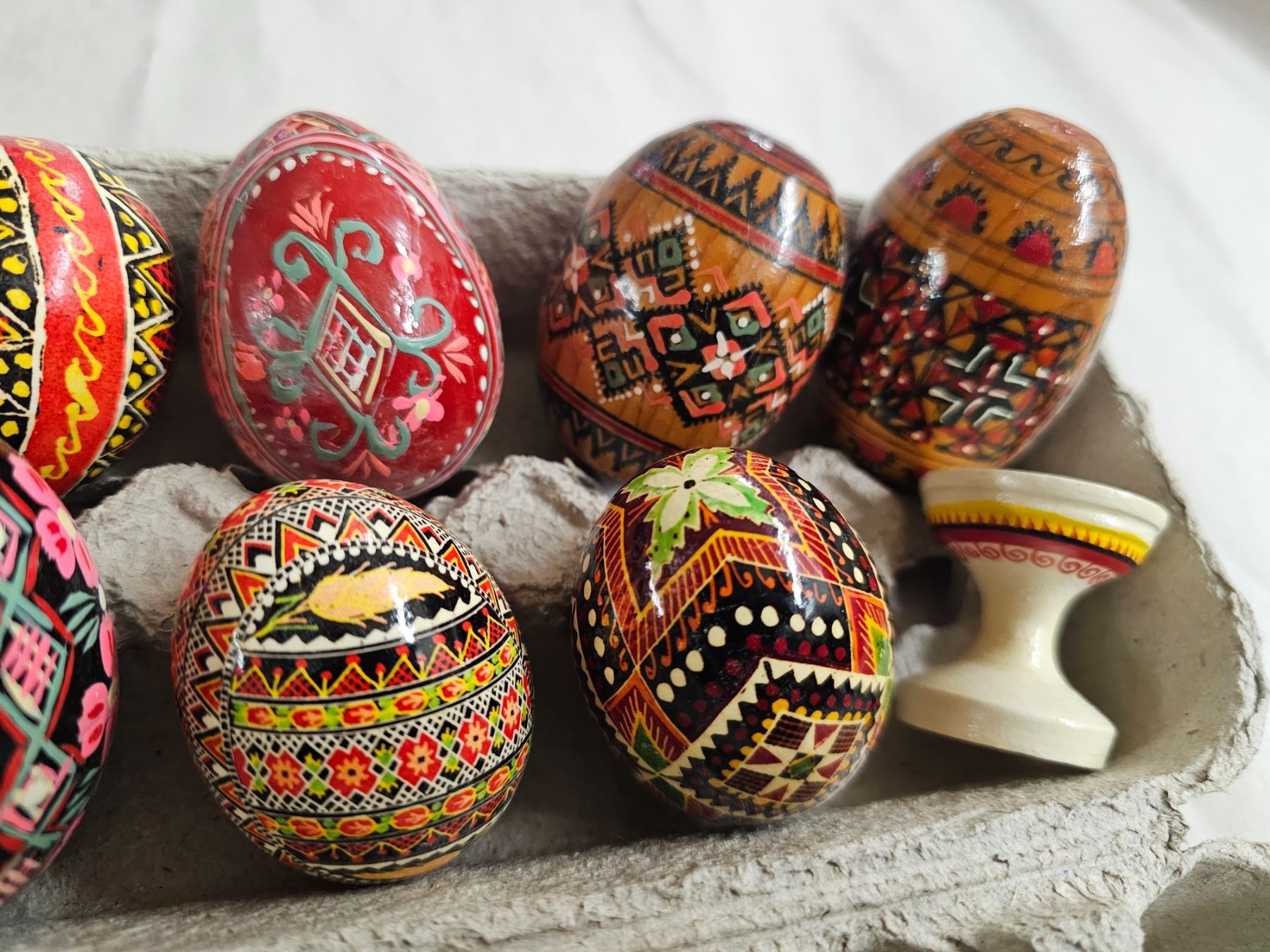 Eleven Ukrainian Easter eggs (4 wooden), one Easter egg stand and book on Ukrainian Easter Eggs (pysanka) designs.