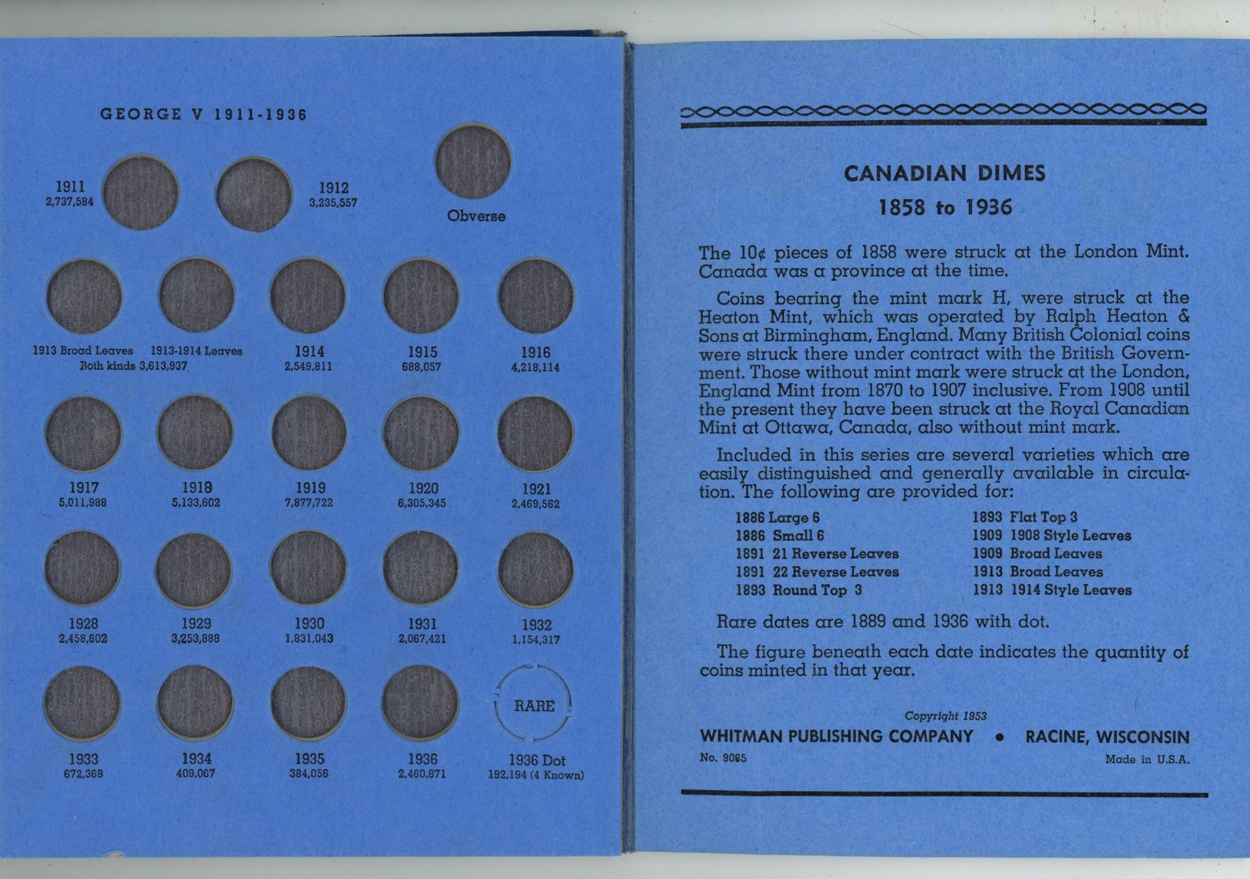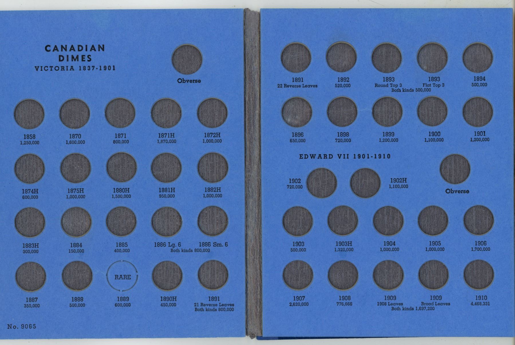 Empty Canadian Silver 10 Cents Whitman folder. Houses Canadian silver 10 Cents from 1858 – 1936.