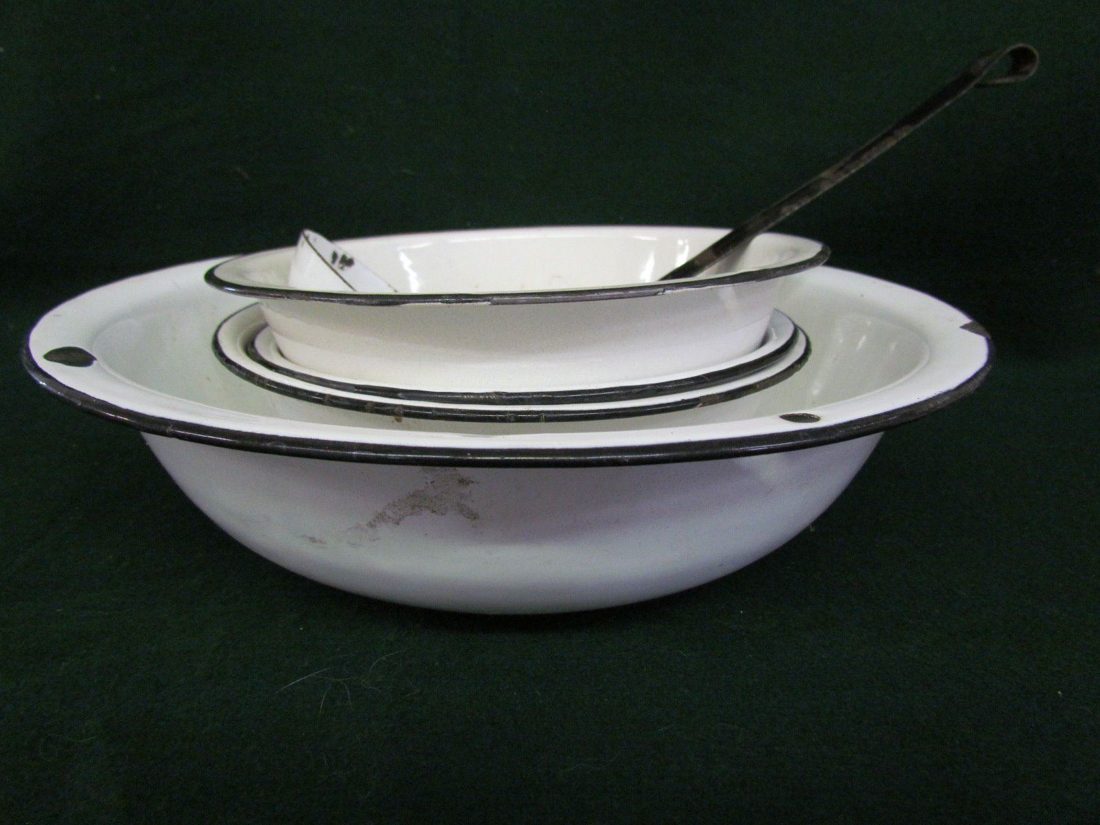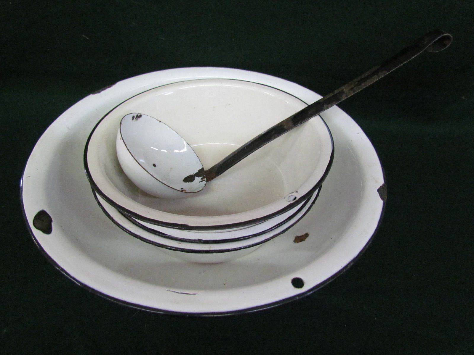Enamel wear black/white kitchen items - ladel, 3 medium bowls, 1 large bowl