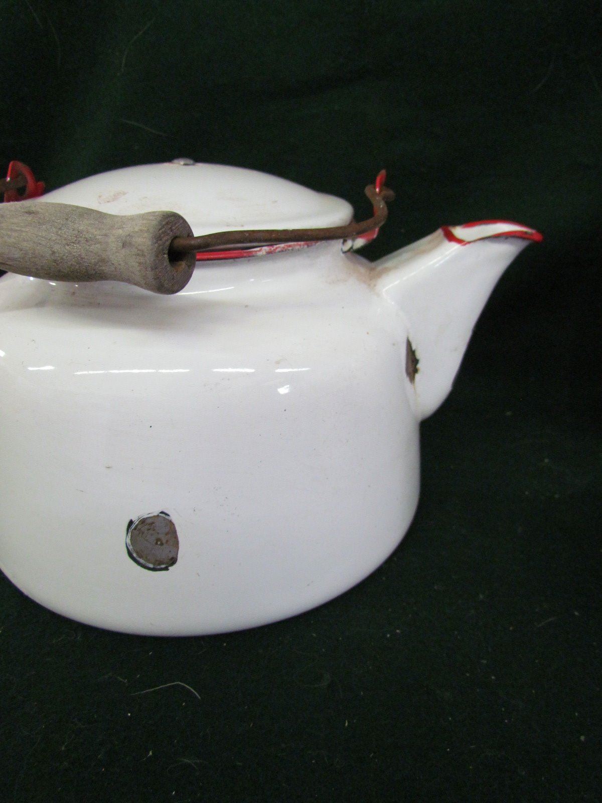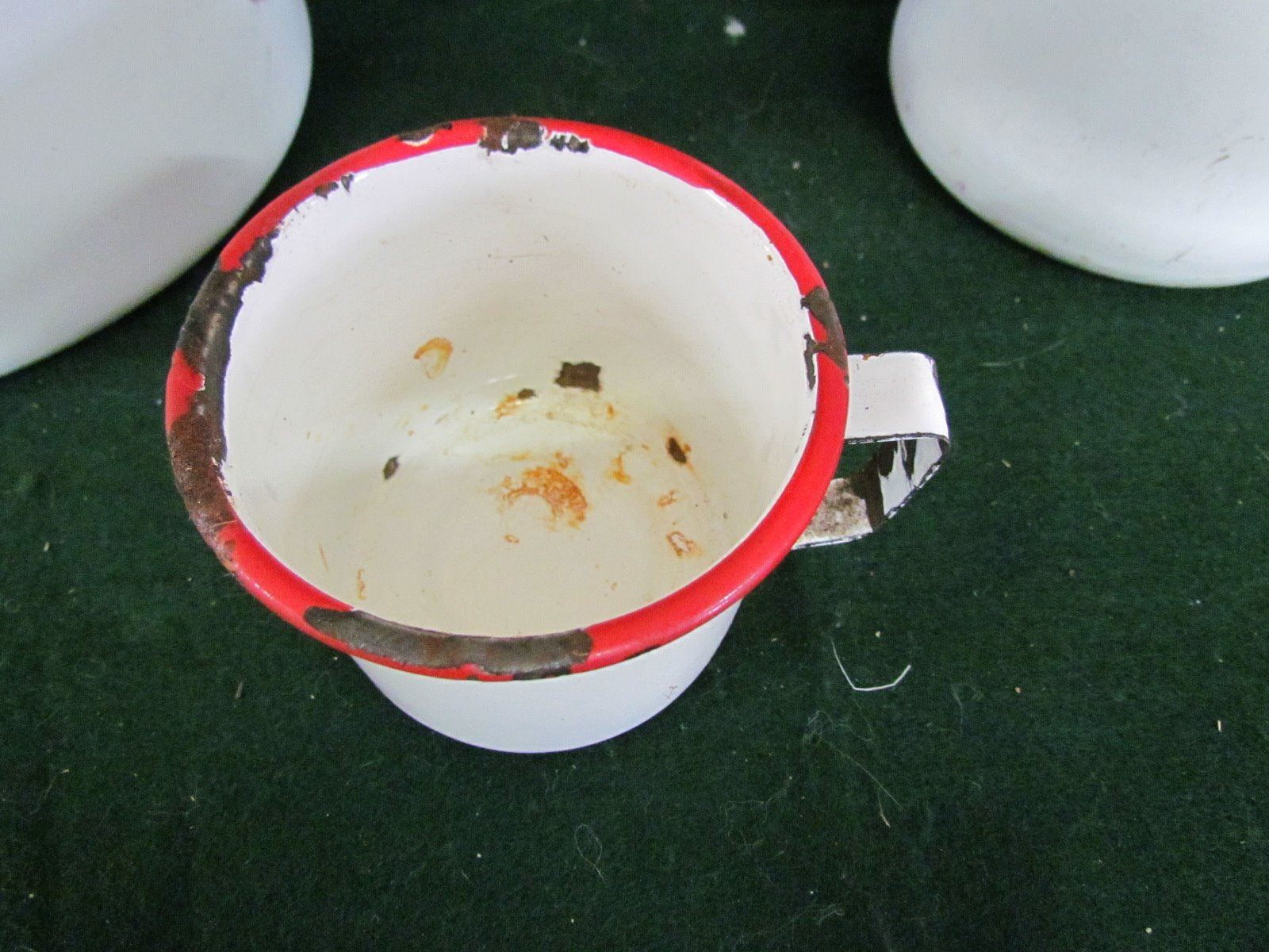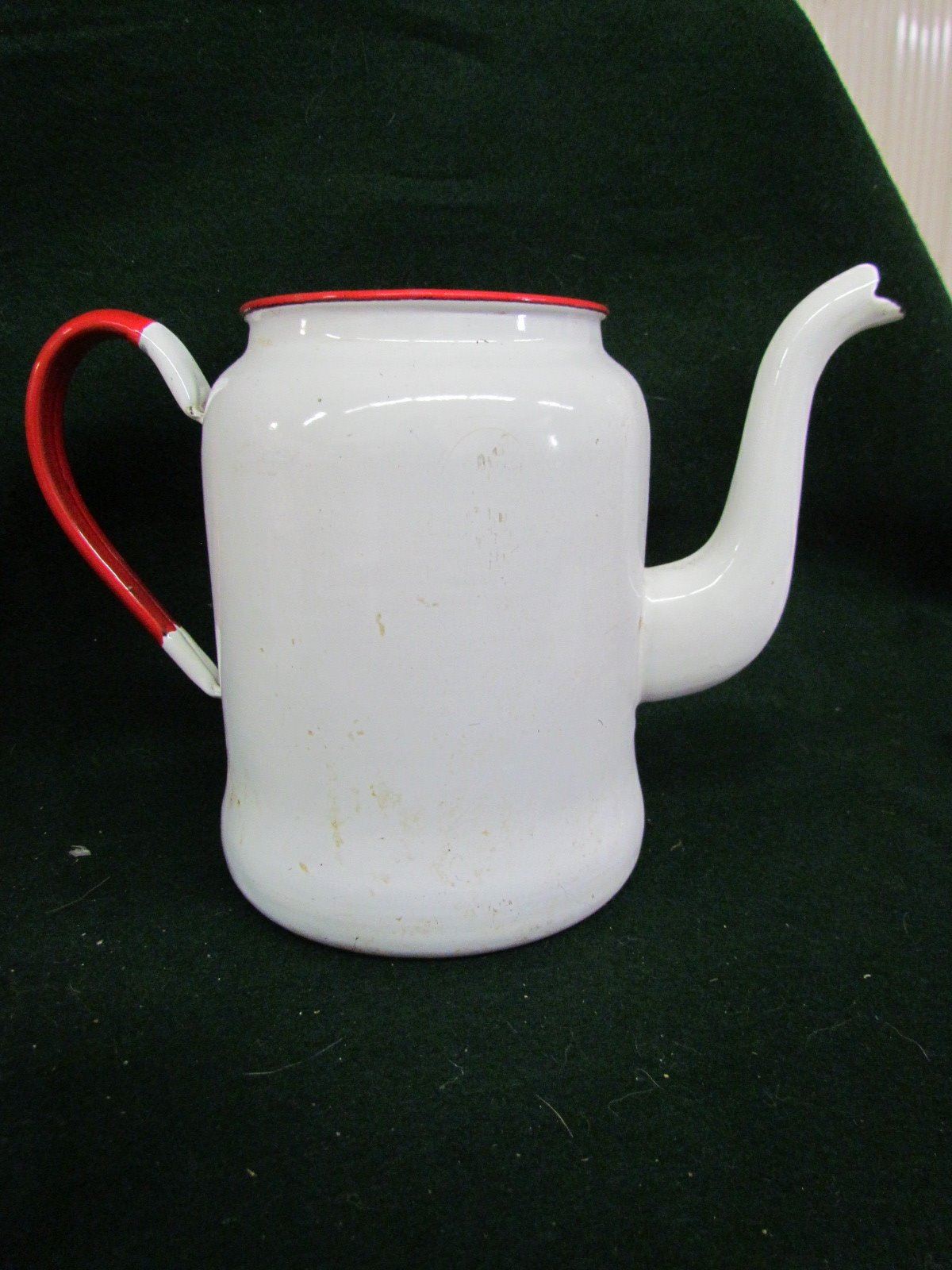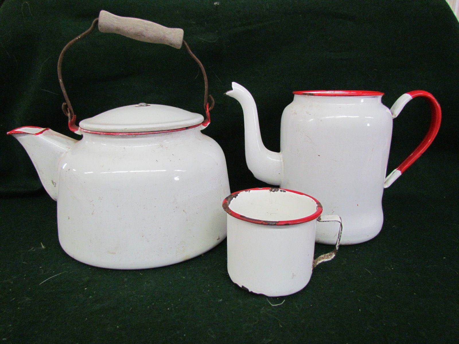 Enamel wear white/red kitchen items - coffee cup, kettle and tea pot