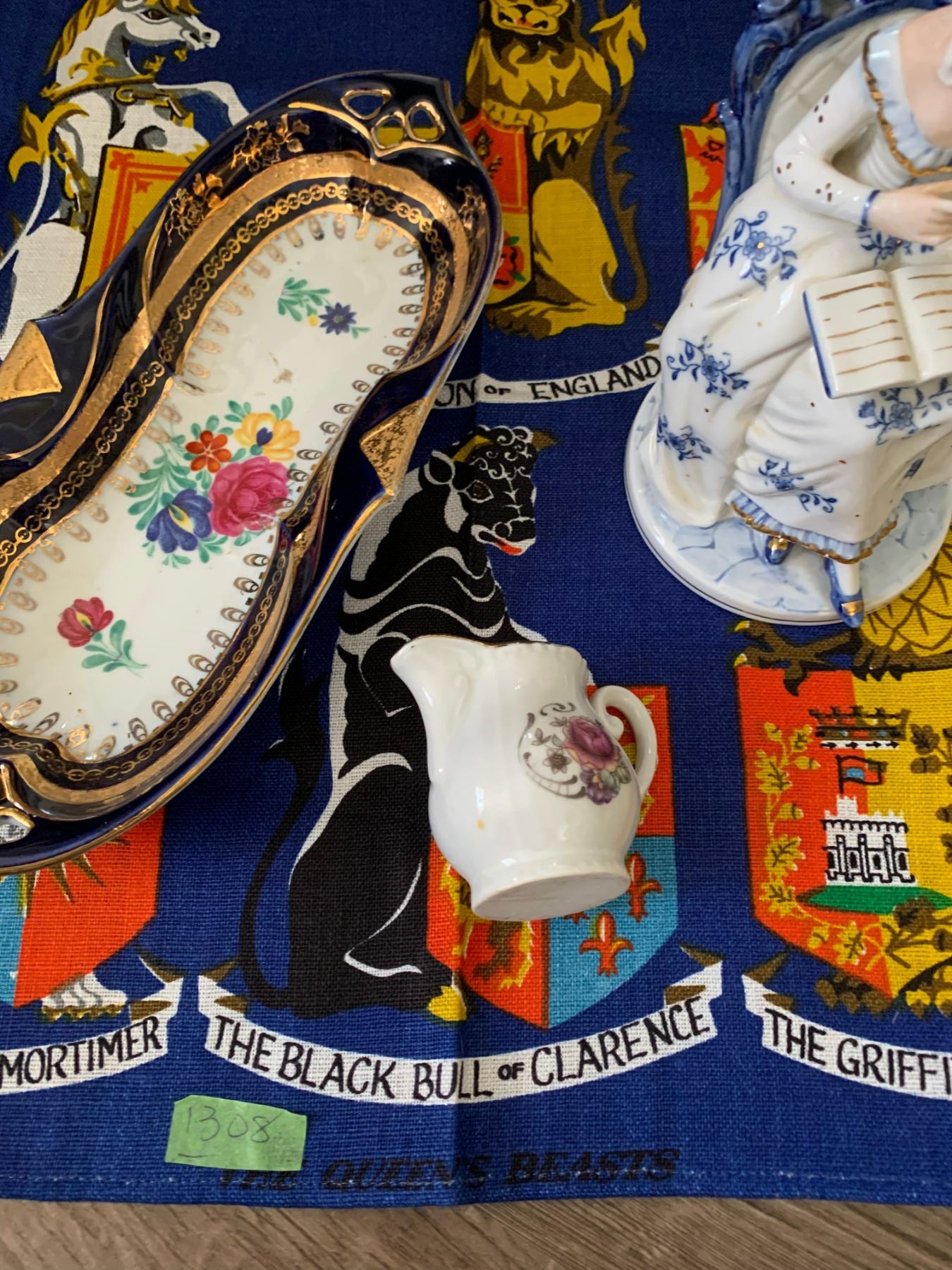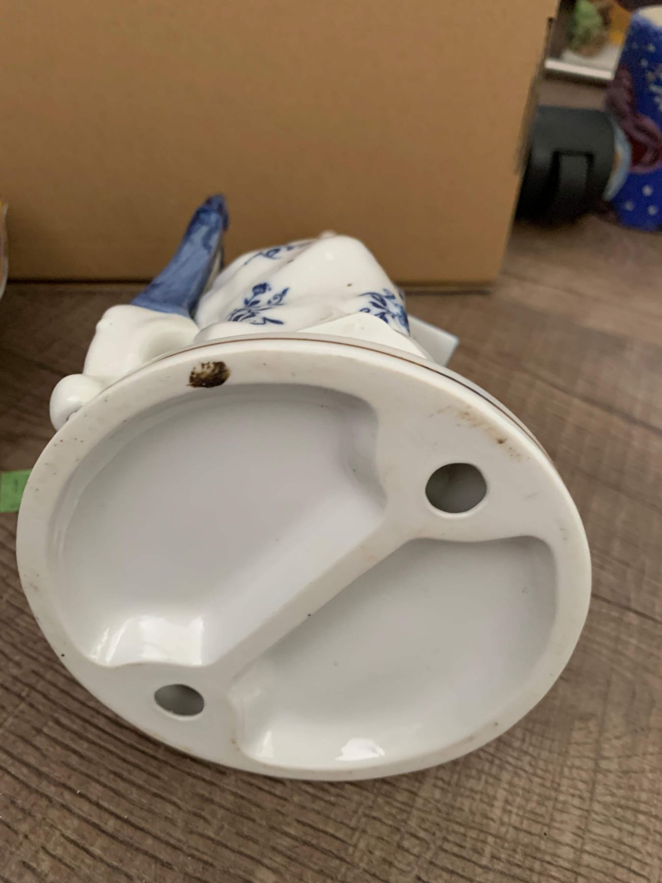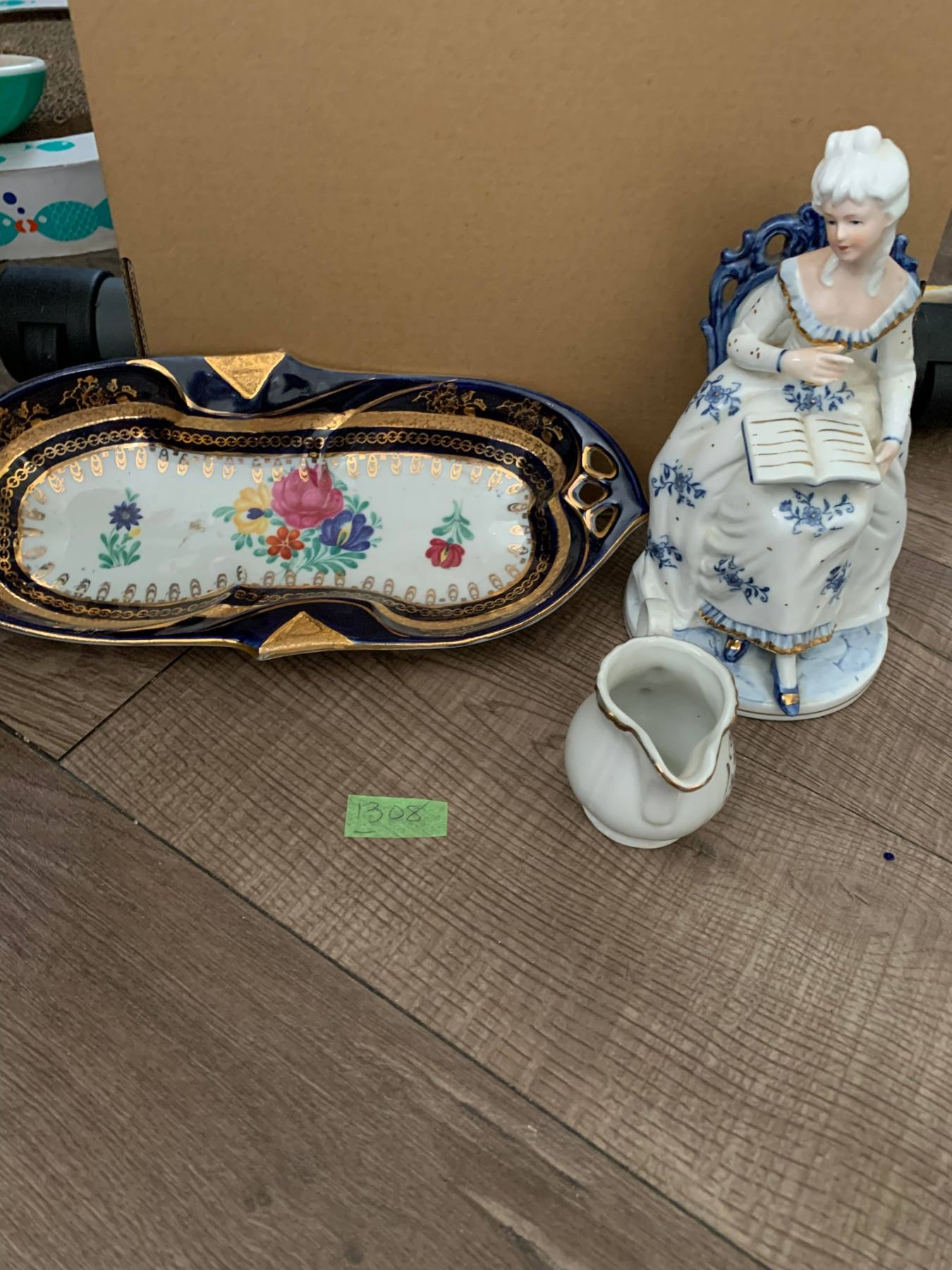 English China ornament- lady in blue and white with gold trim, small floral pitcher, stunning colbalt blue dish with floral and gold accents