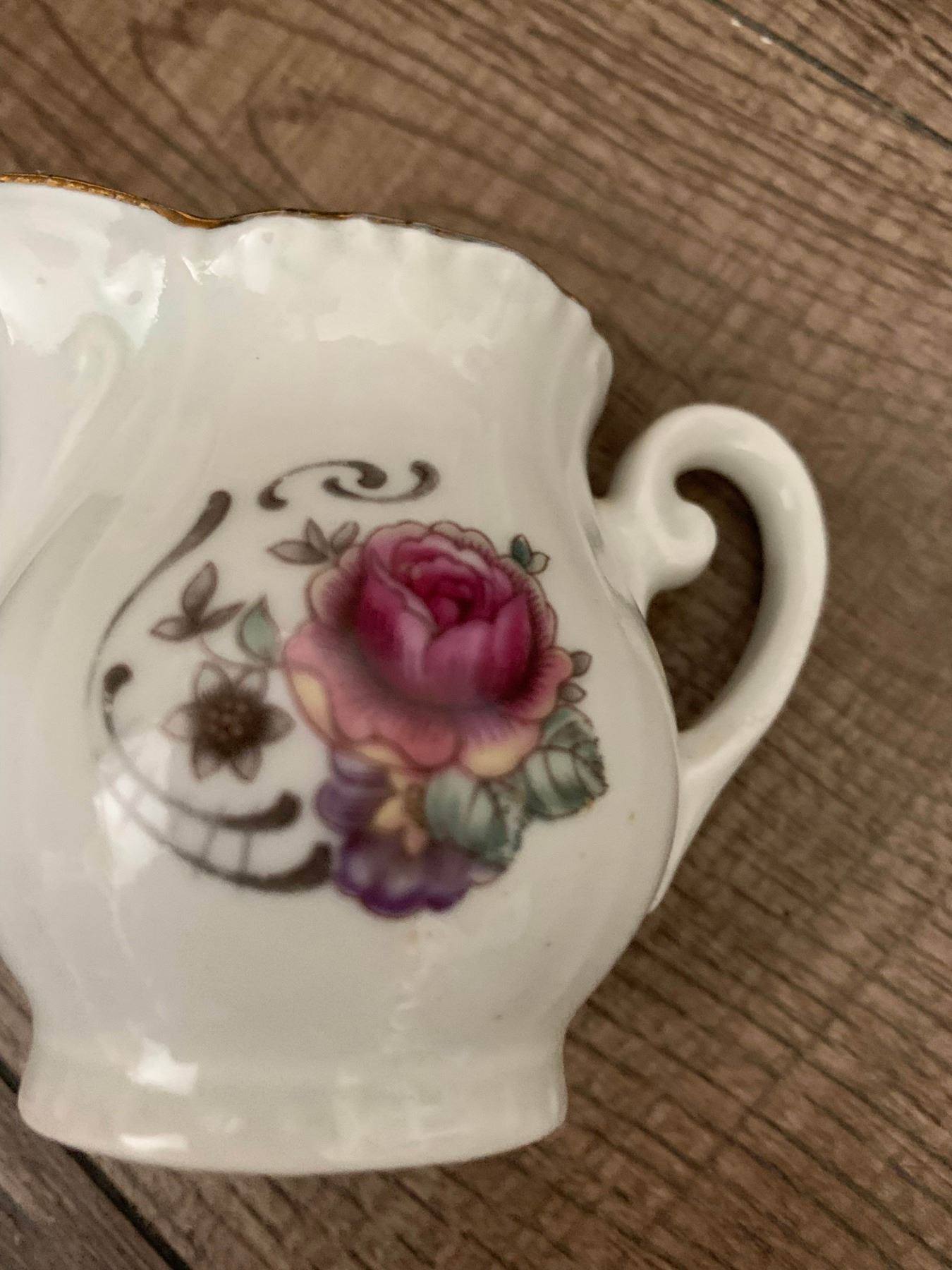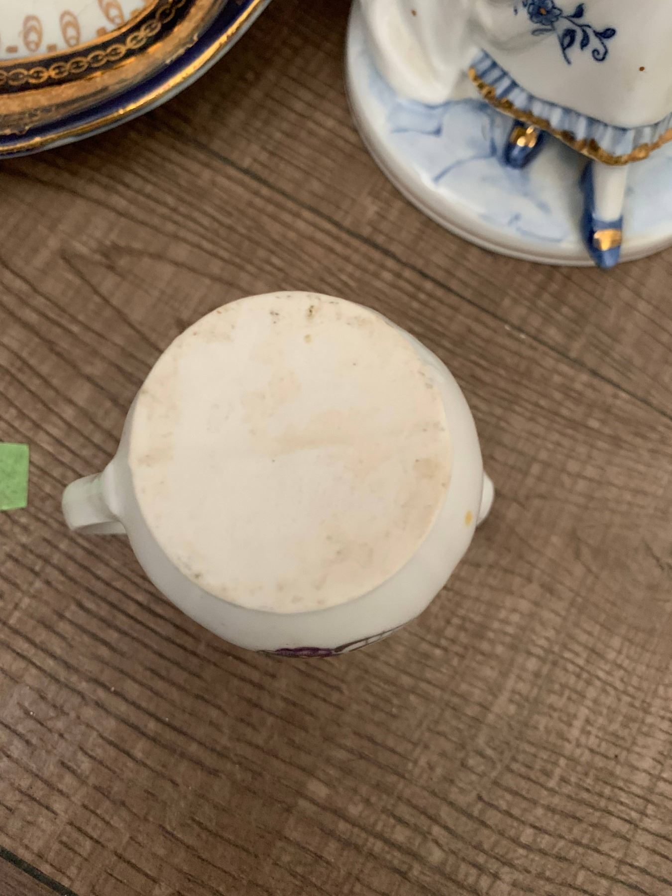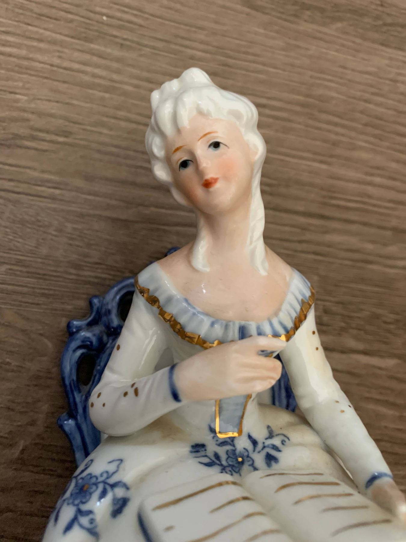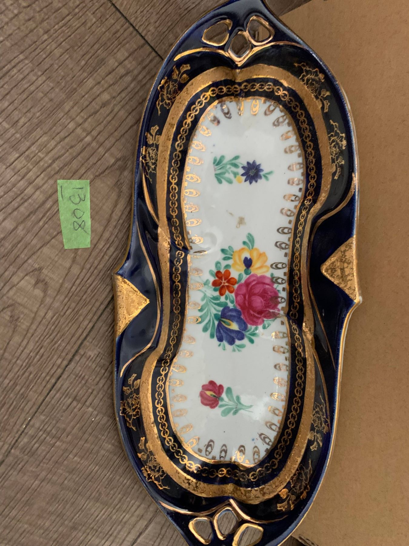 English China ornament- lady in blue and white with gold trim, small floral pitcher, stunning colbalt blue dish with floral and gold accents