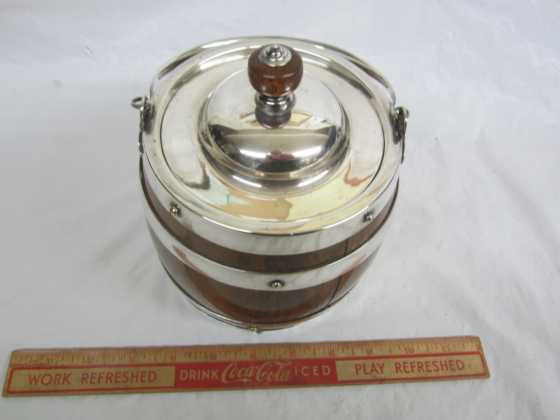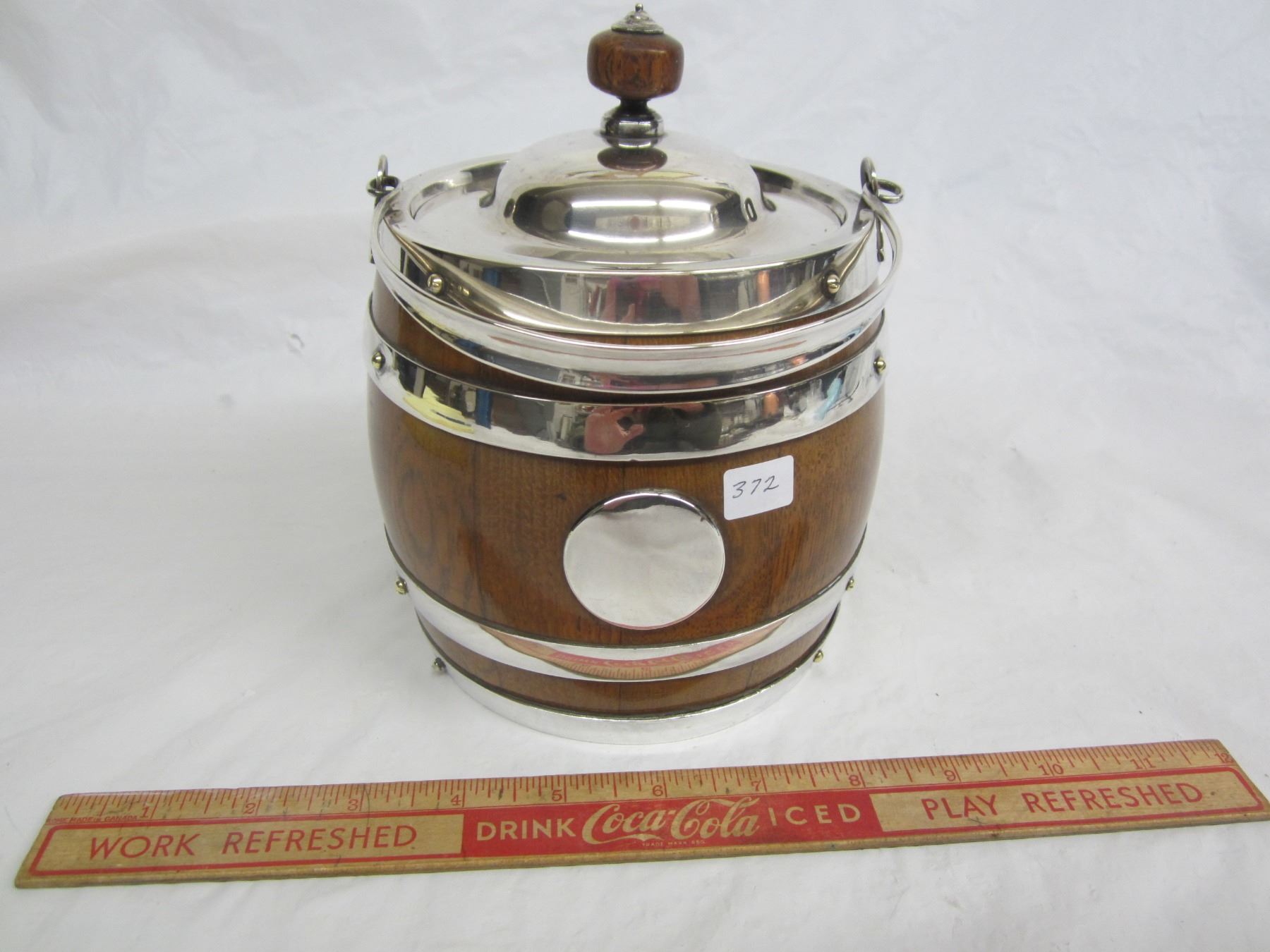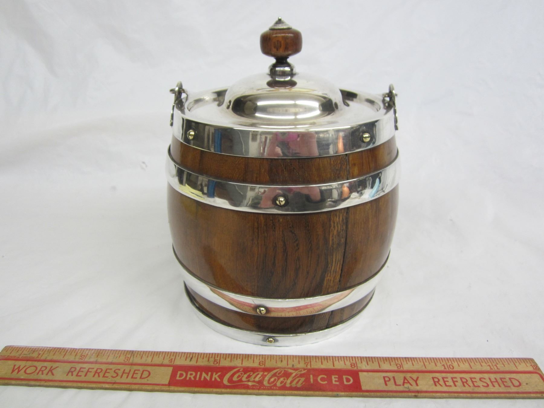 English Oak and Silver Plate Biscuit Barrell Nice Condition